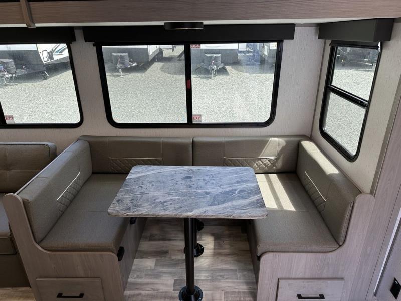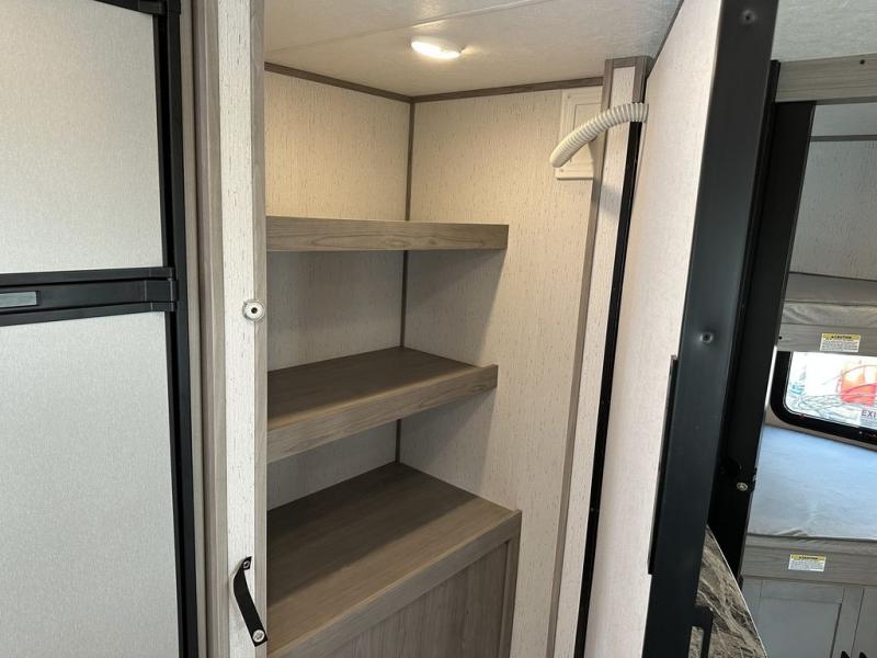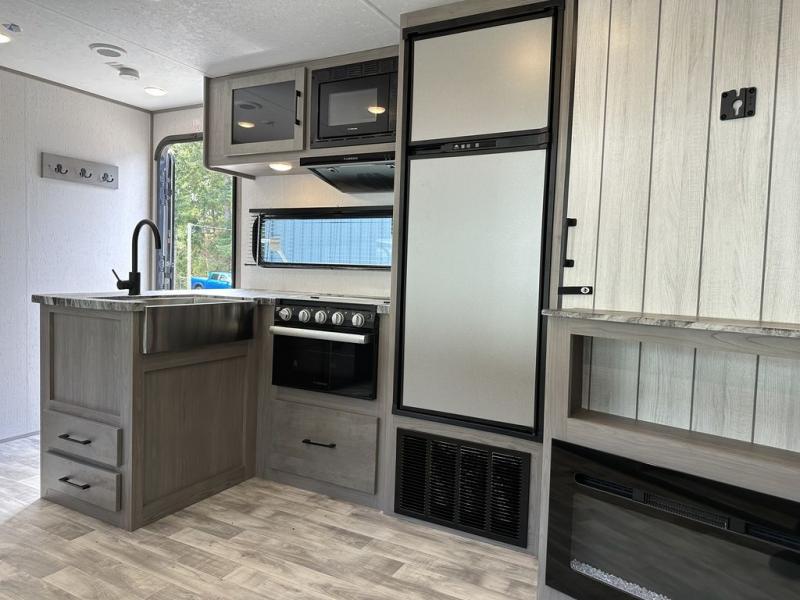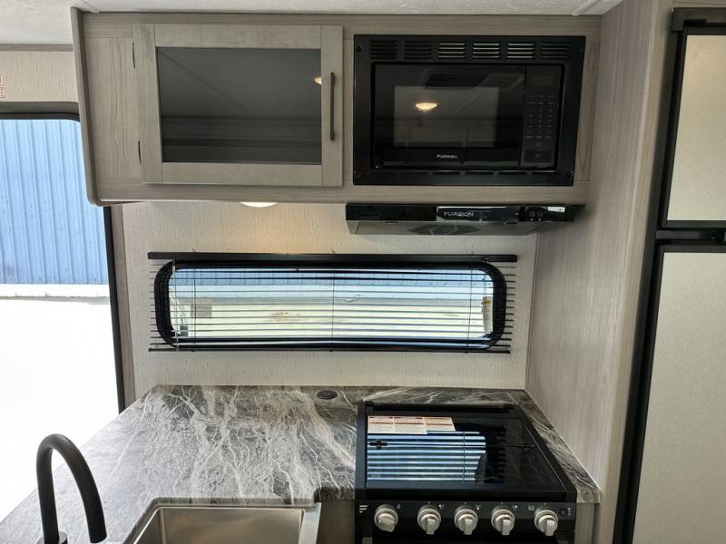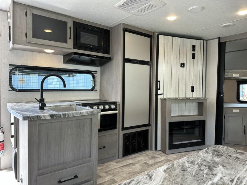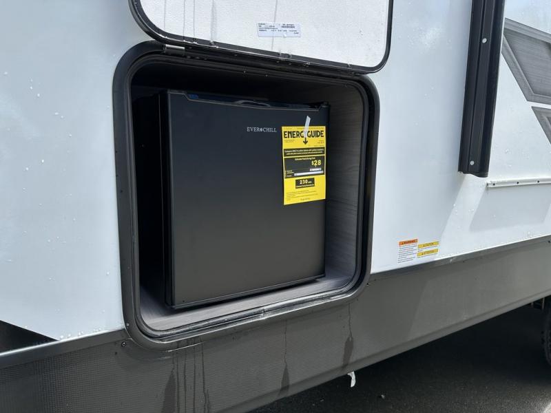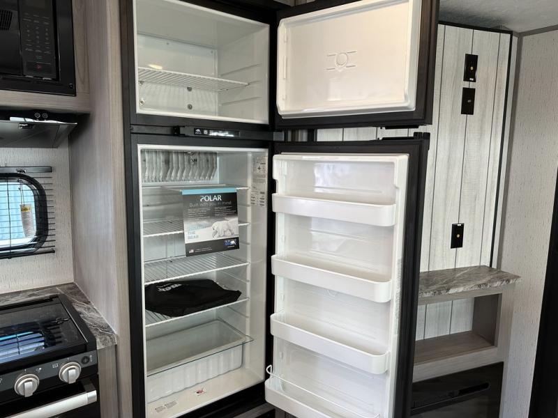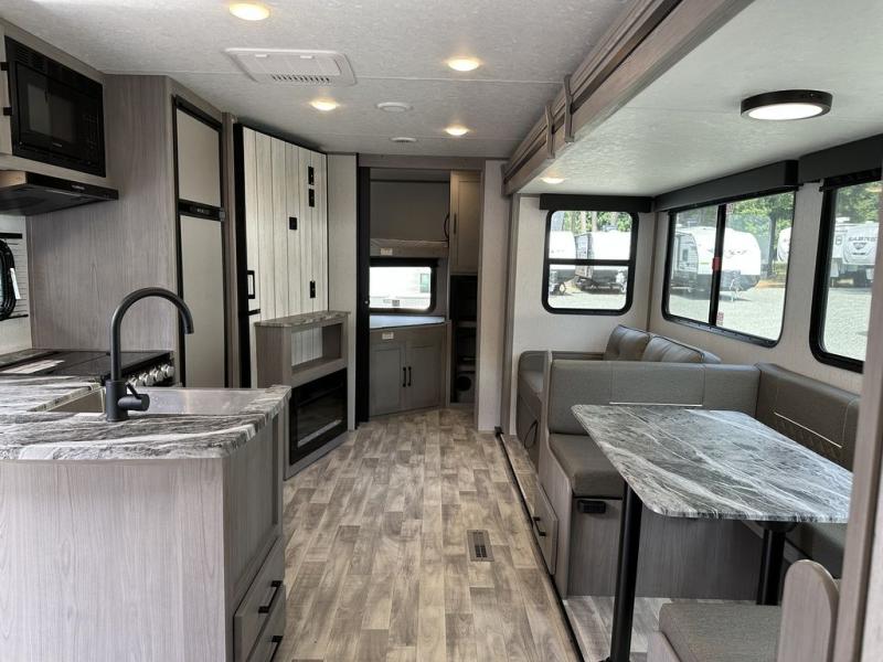 Comfort is found in this roomy travel trailer for eight! The rear bunk beds include their own door for privacy, plus there is a wardrobe here so your guests can store their things. When the large slide is out, the chef of the group can easily cook in the full kitchen, or they can use the outside kitchen if they need some fresh air. You'll also find Solid Entry steps, a 21' power awning with LED lights, plus a pass-through storage outside as well. You will love the front master bedroom with its queen bed with storage space on either side of the bed, plus the walk-through bath will be easily accessible for everyone to use!