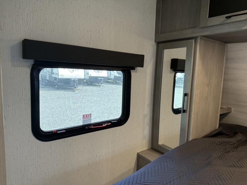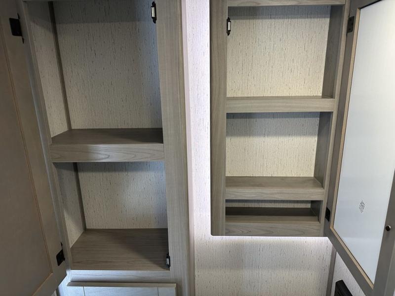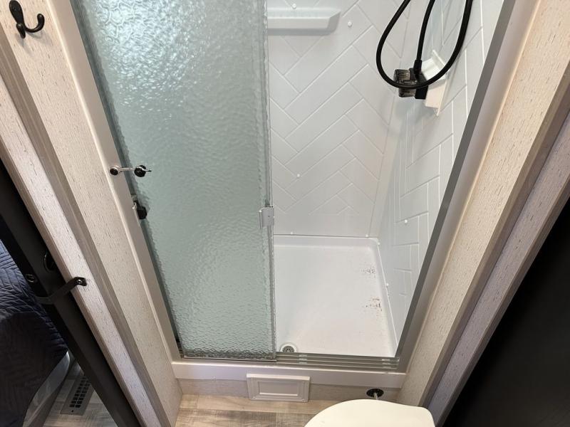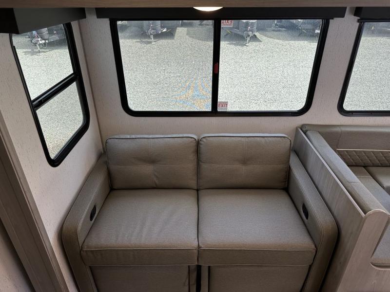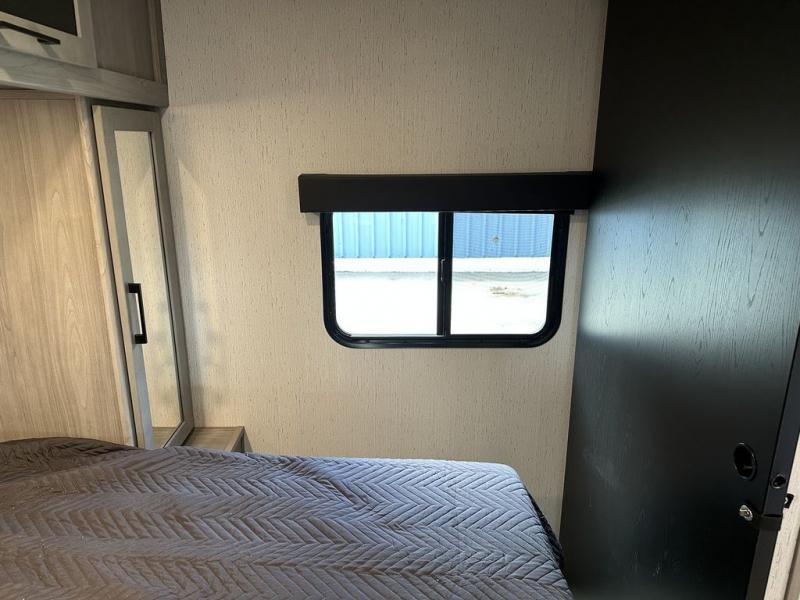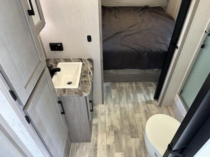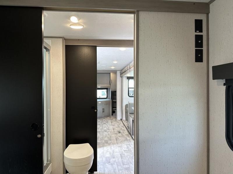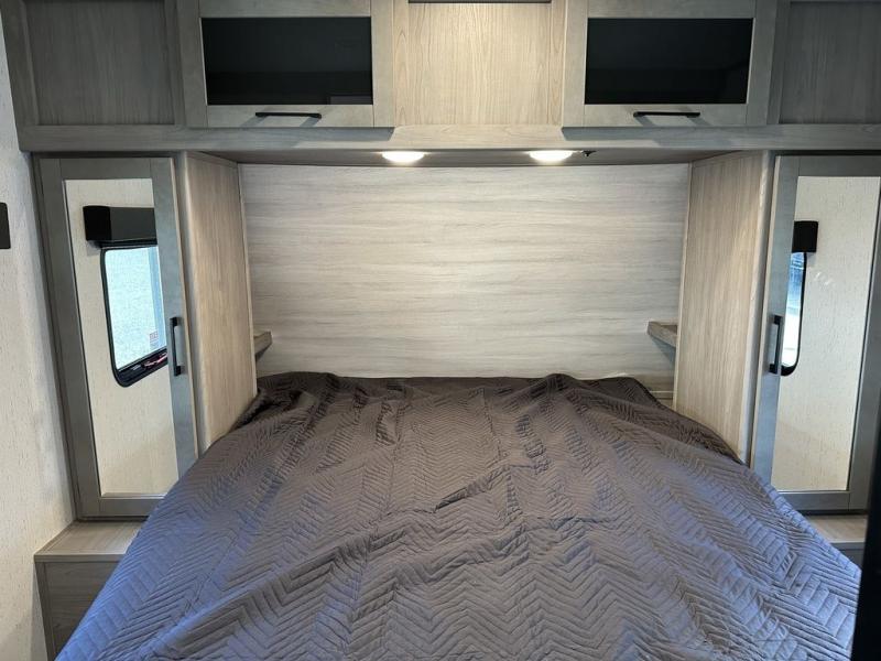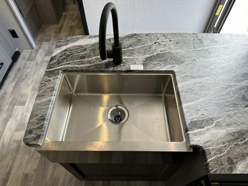 Comfort is found in this roomy travel trailer for eight! The rear bunk beds include their own door for privacy, plus there is a wardrobe here so your guests can store their things. When the large slide is out, the chef of the group can easily cook in the full kitchen, or they can use the outside kitchen if they need some fresh air. You'll also find Solid Entry steps, a 21' power awning with LED lights, plus a pass-through storage outside as well. You will love the front master bedroom with its queen bed with storage space on either side of the bed, plus the walk-through bath will be easily accessible for everyone to use!