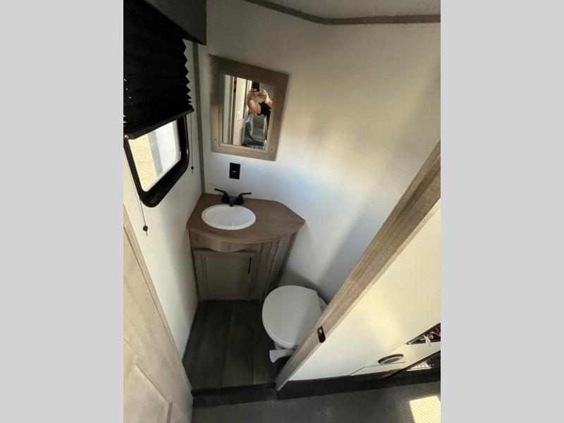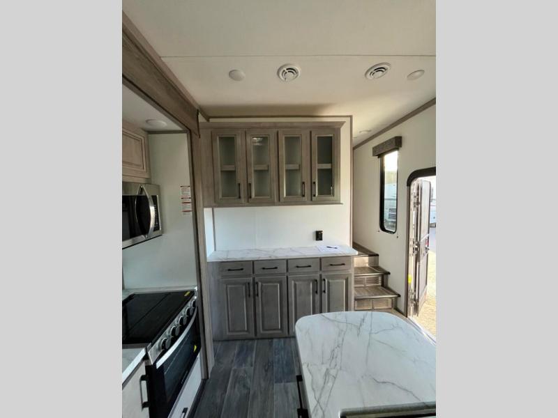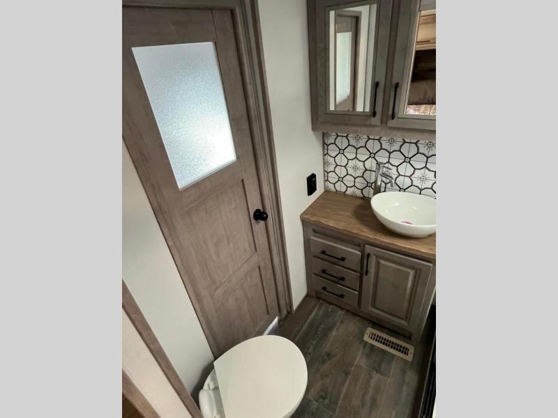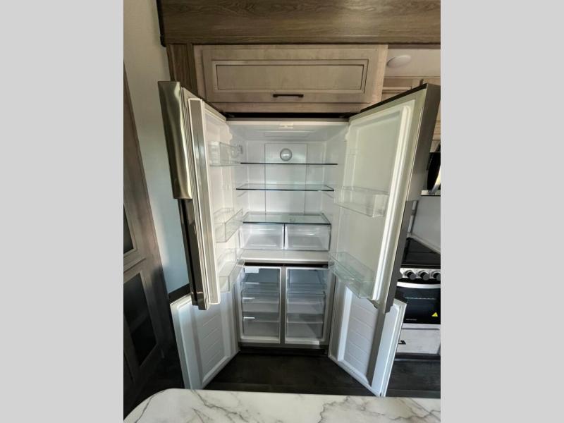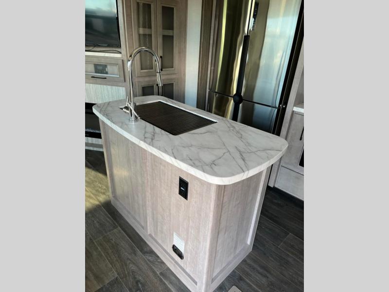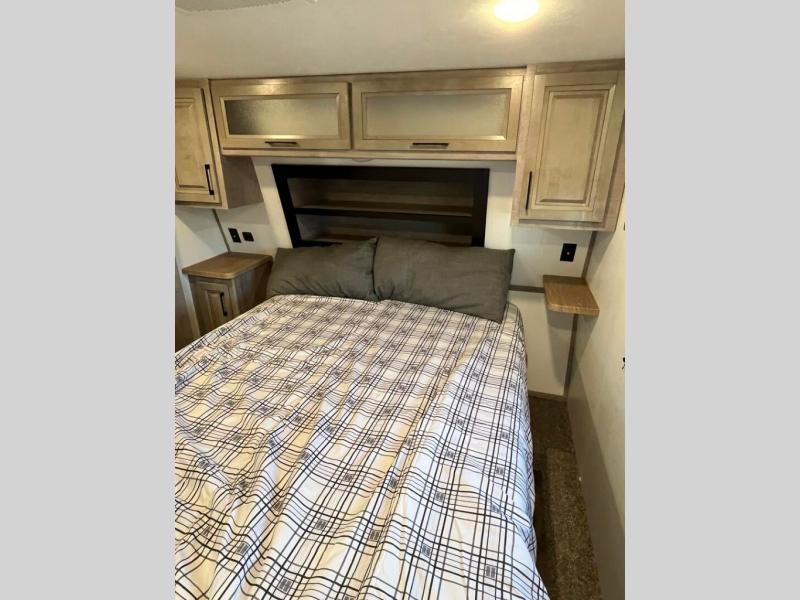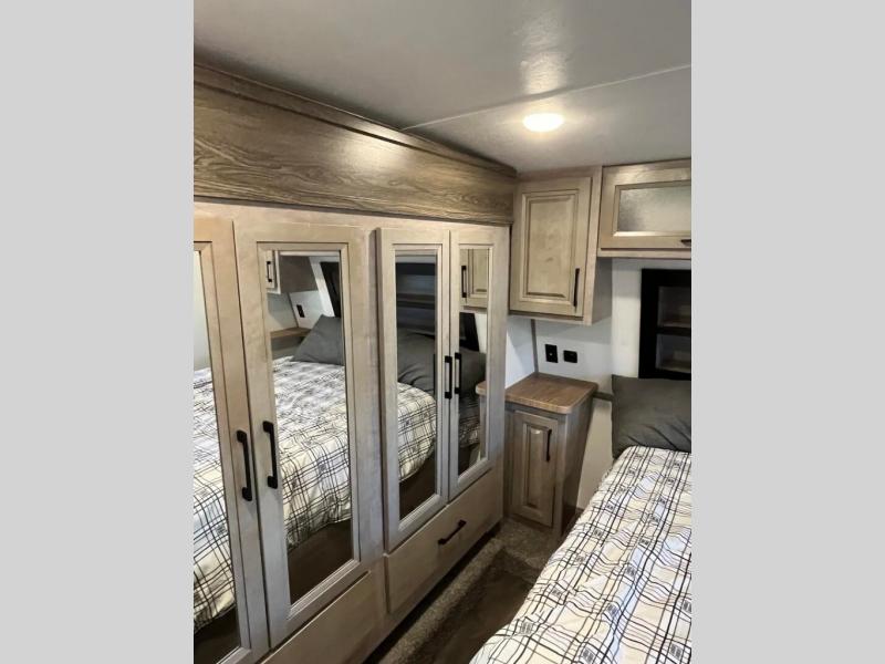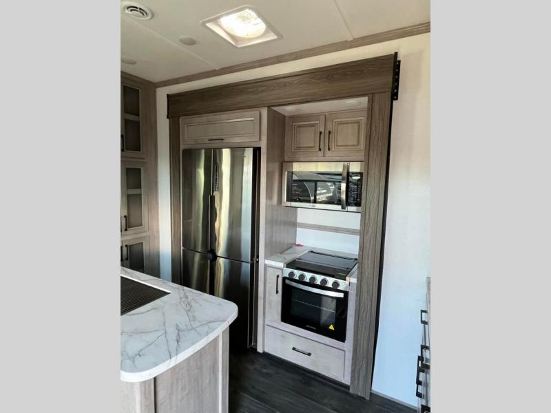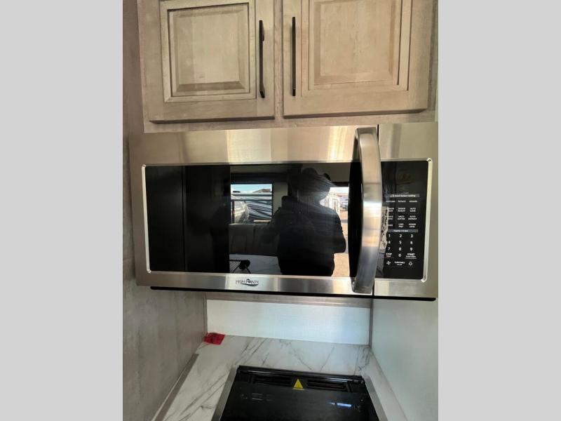 You will appreciate all that this toy hauler has to offer! Starting with the 15' garage area which has a lay flat Happi-Jack power bunk above opposing sofas with a table top in between them, a twin bed loft, a half bathroom, and even one of the dual entry doors to the unit. Lay your head each night on the comfortable king bed in the front private bedroom and enjoy easy access to the dual entry bathroom directly from your bedroom. The chef can prepare their best home cooked meals with the kitchen island, 18 cu. ft. refrigerator, and the Furrion three burner range with 21" oven then enjoy them at the either the sofas in the garage area or the sofa slide with table in the kitchen area. Easily access and store all of your outdoor gear in the front exterior pass-through storage area!