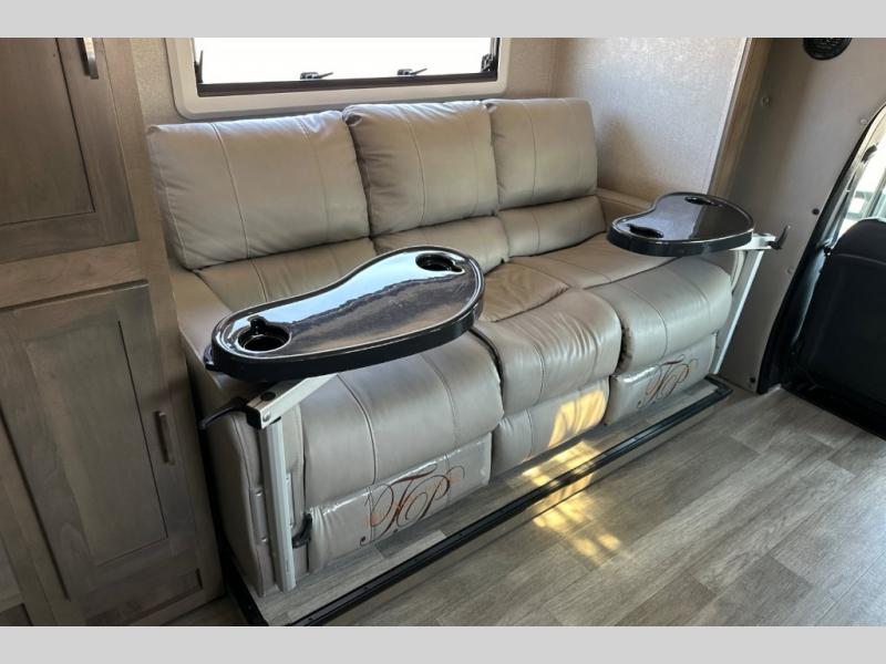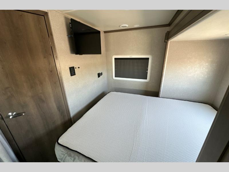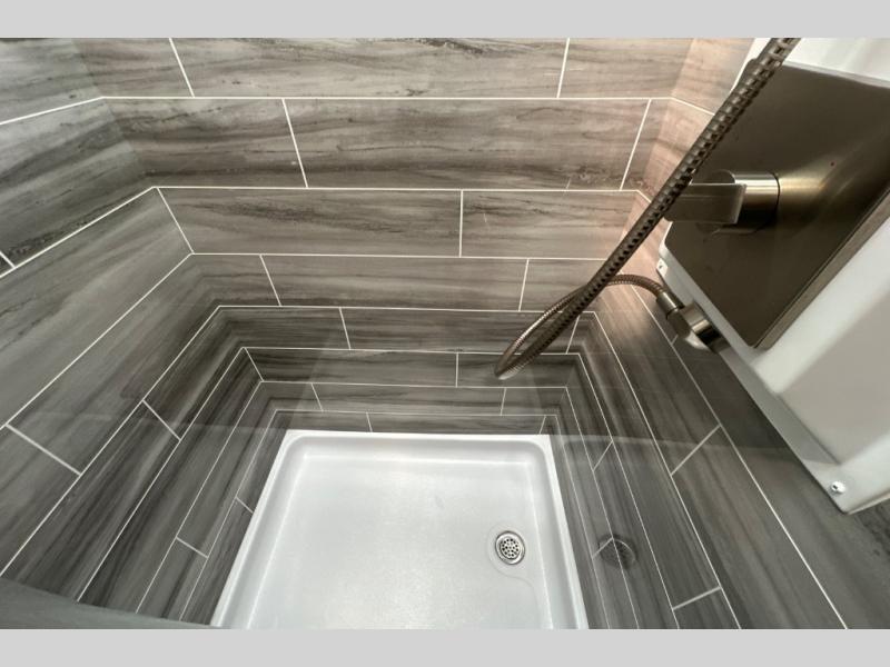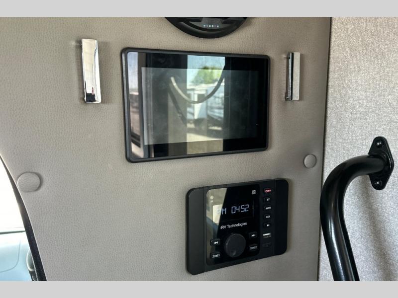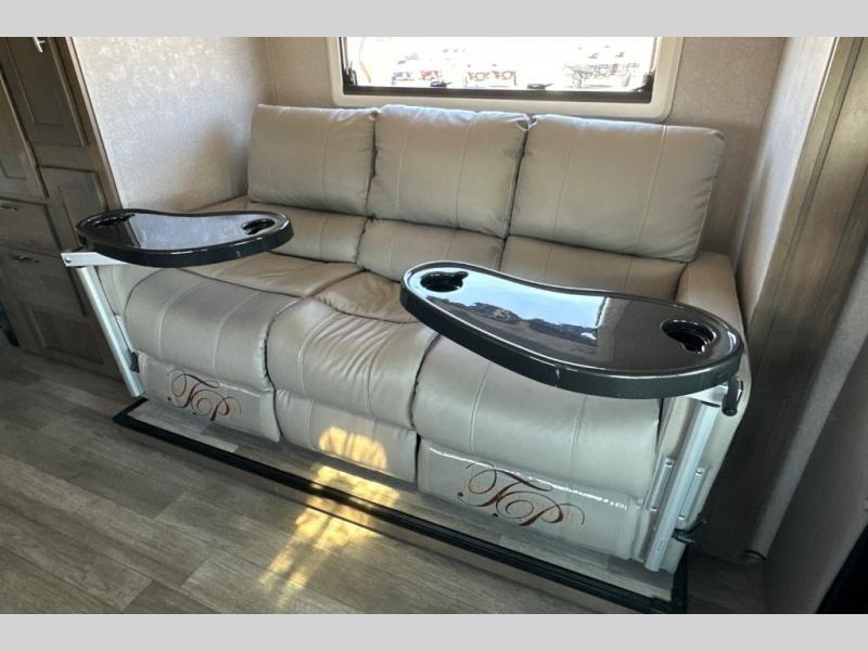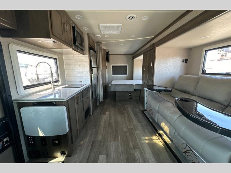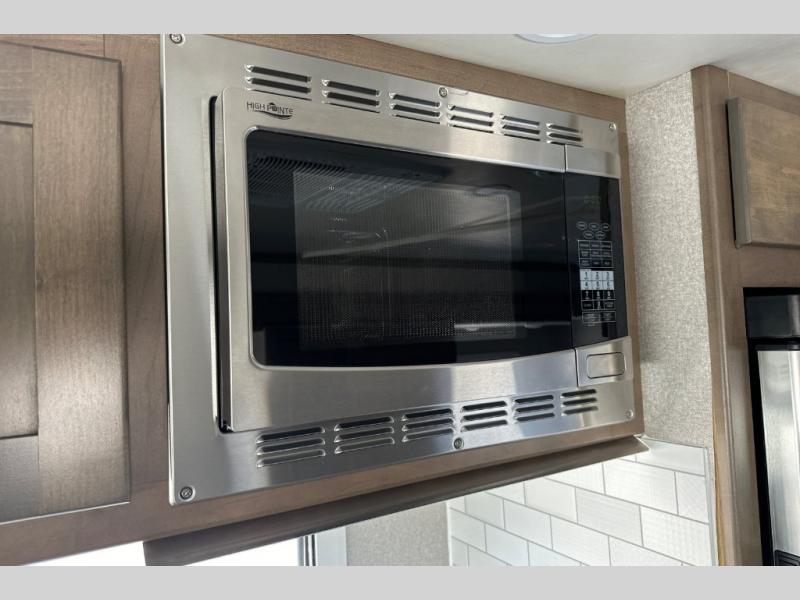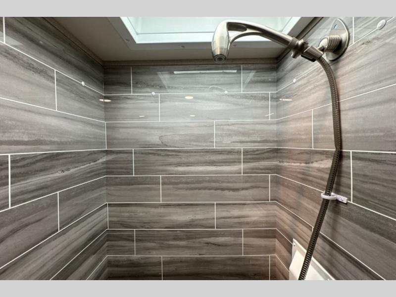 Take this motorhome on your greatest adventures yet! Start each morning feeling well rested after sleeping on the corner queen bed then head to the rear corner bathroom to freshen up in the shower with an Oxygenics body spa RV shower head and a skylight above for added headroom and natural lighting. Now that you're ready for the day, you can grab some eggs from the 6 cu. ft. double door refrigerator and fry them up on the three burner cooktop then enjoy them at the booth dinette. The kitchen also has a countertop extension for more meal prepping space and a convection microwave oven to pop a bag of popcorn before watching your favorite movies on either the living room 32" LED TV or the 32" LED smart TV across from the bed. You could even switch things up by replacing the booth dinette with an optional 3-seat power recliner, and adding a cab over bunk option!