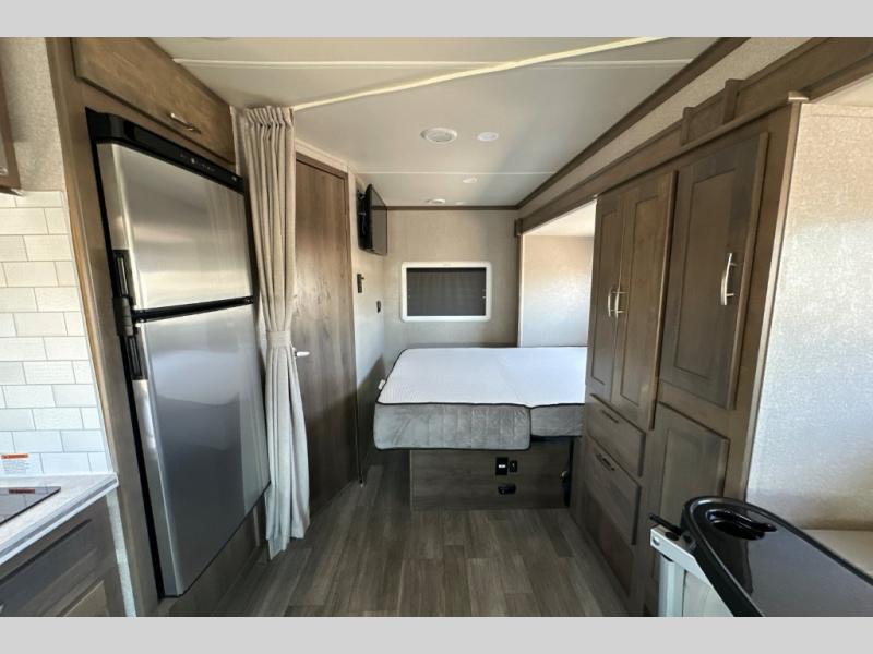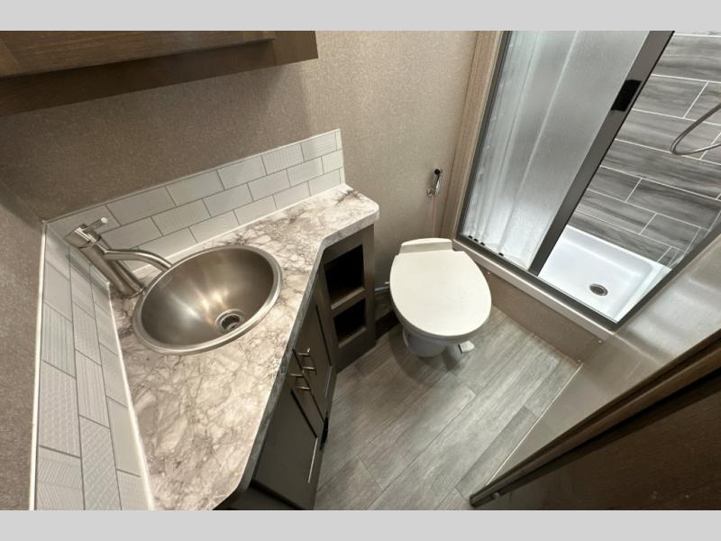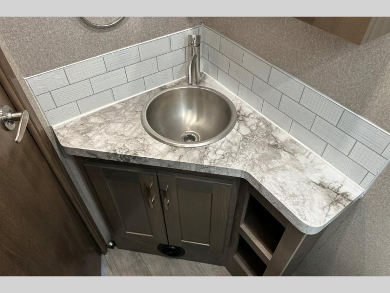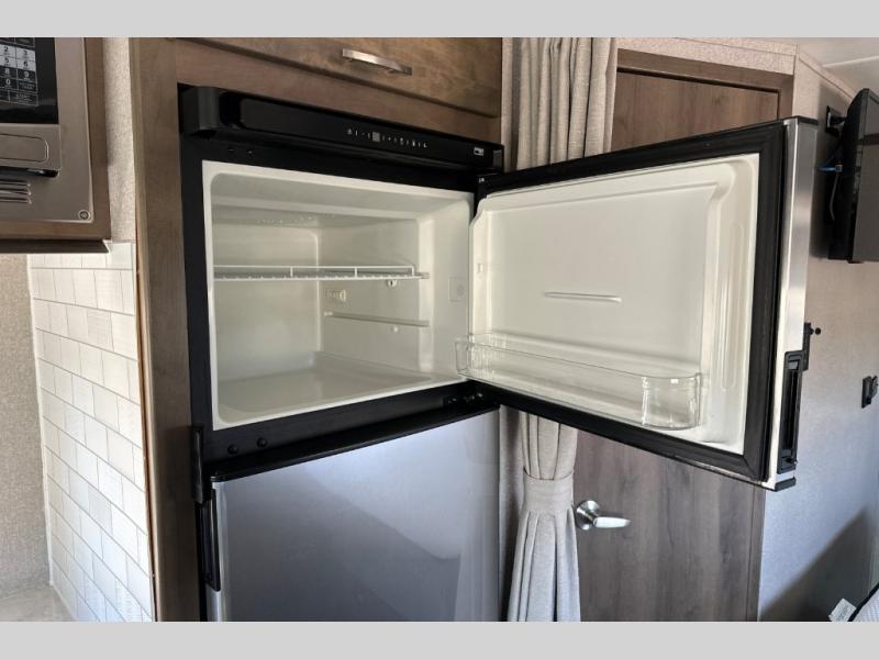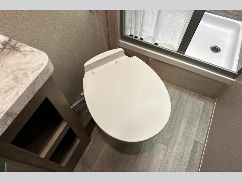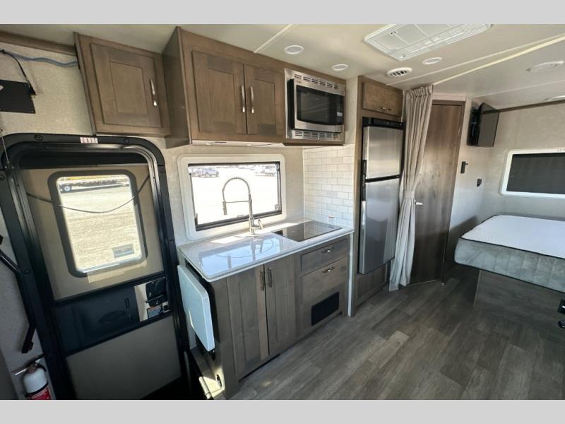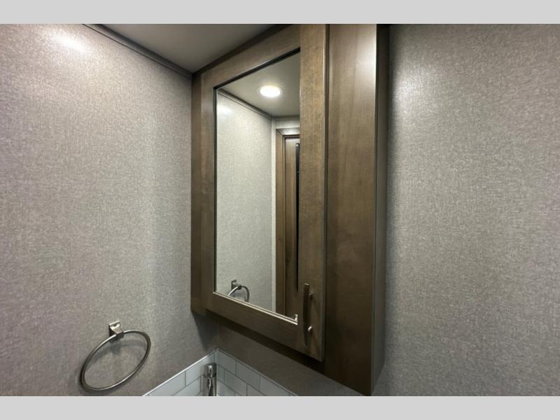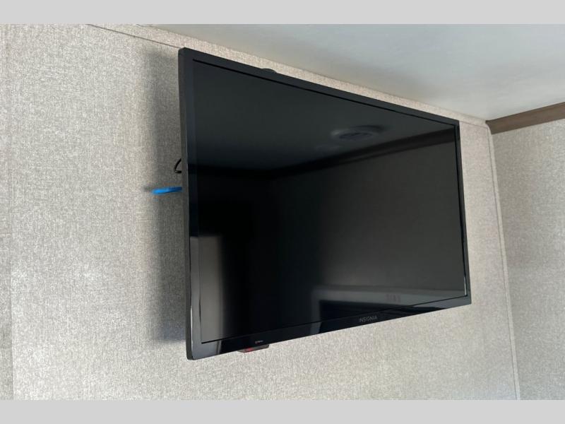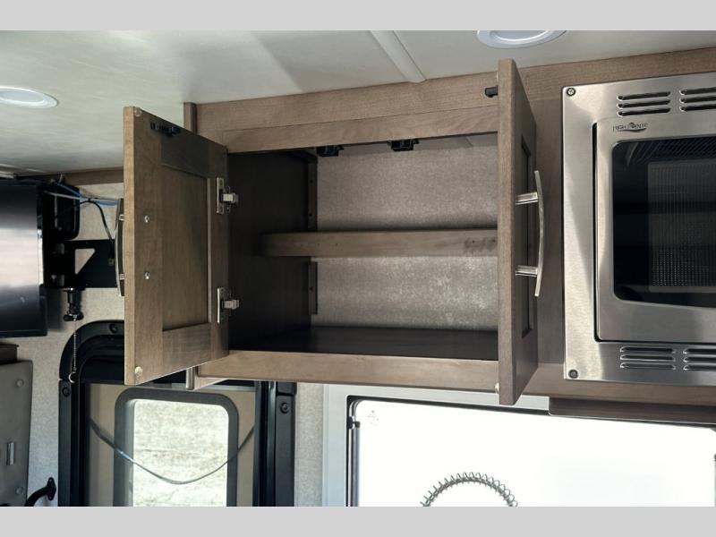 Take this motorhome on your greatest adventures yet! Start each morning feeling well rested after sleeping on the corner queen bed then head to the rear corner bathroom to freshen up in the shower with an Oxygenics body spa RV shower head and a skylight above for added headroom and natural lighting. Now that you're ready for the day, you can grab some eggs from the 6 cu. ft. double door refrigerator and fry them up on the three burner cooktop then enjoy them at the booth dinette. The kitchen also has a countertop extension for more meal prepping space and a convection microwave oven to pop a bag of popcorn before watching your favorite movies on either the living room 32" LED TV or the 32" LED smart TV across from the bed. You could even switch things up by replacing the booth dinette with an optional 3-seat power recliner, and adding a cab over bunk option!