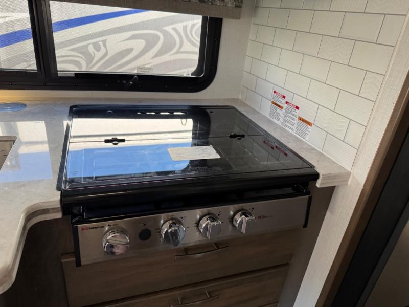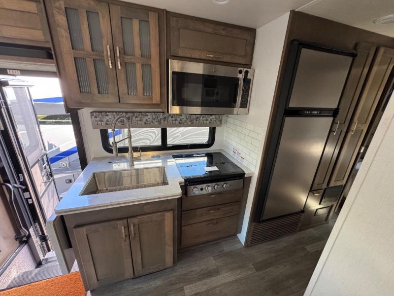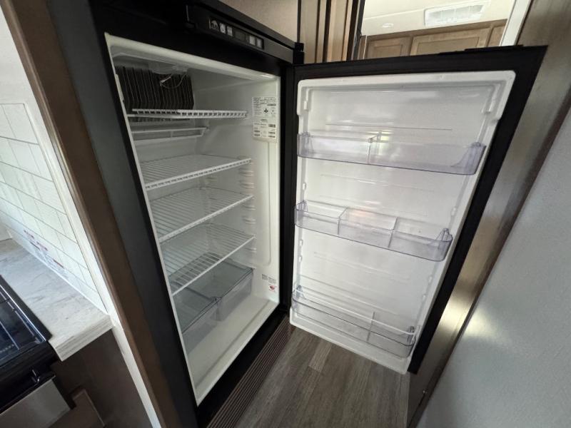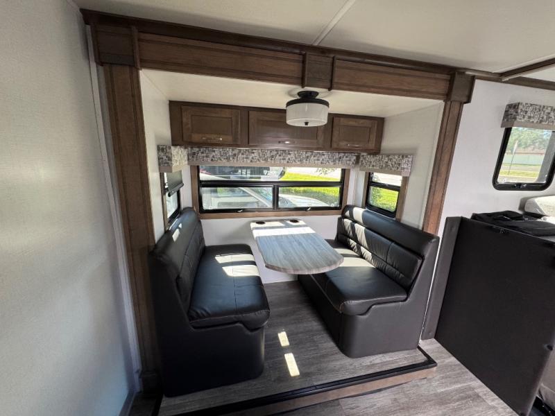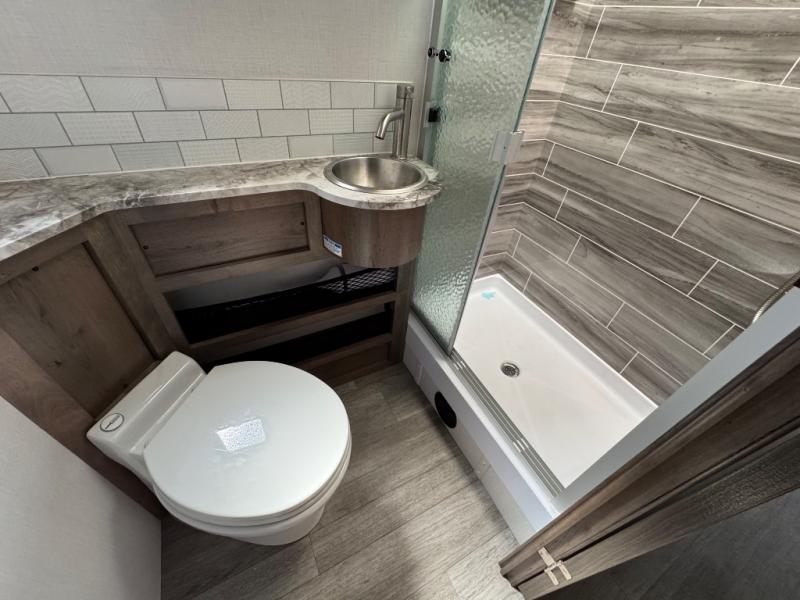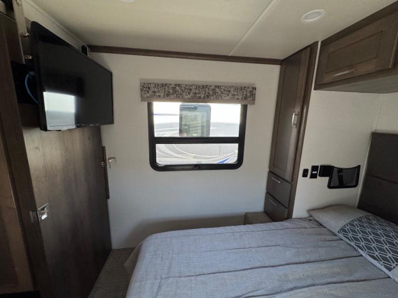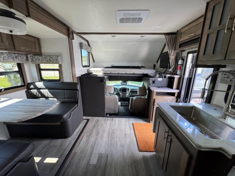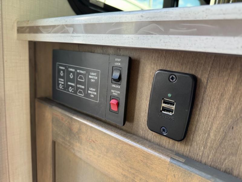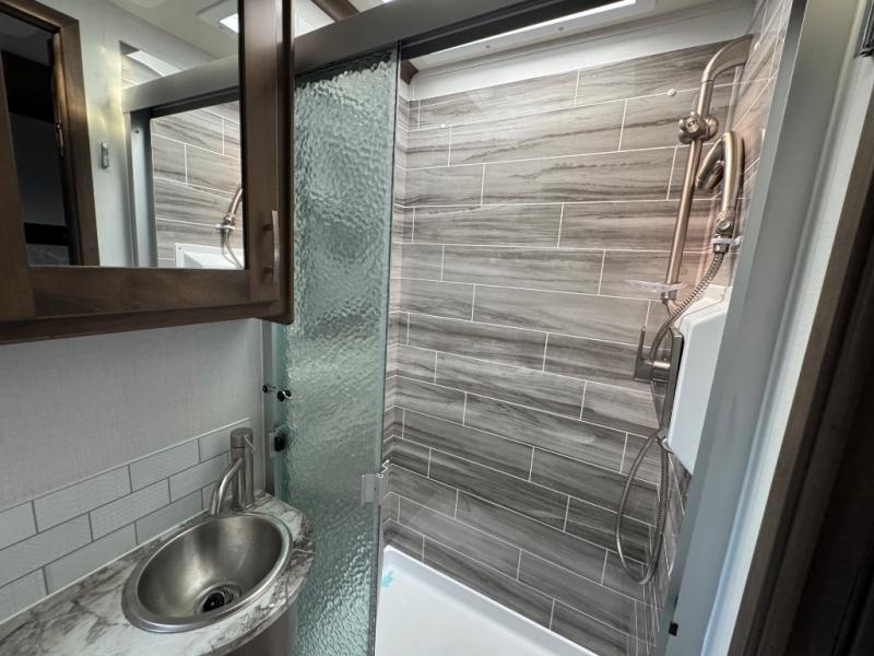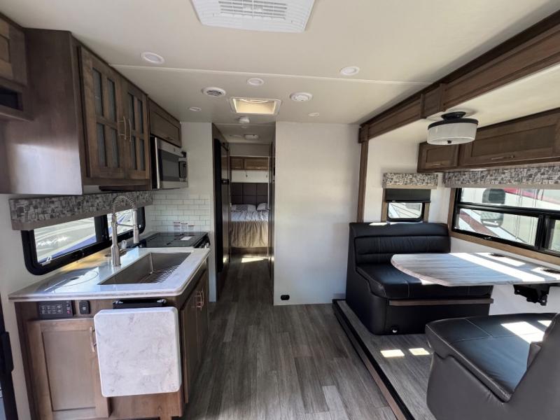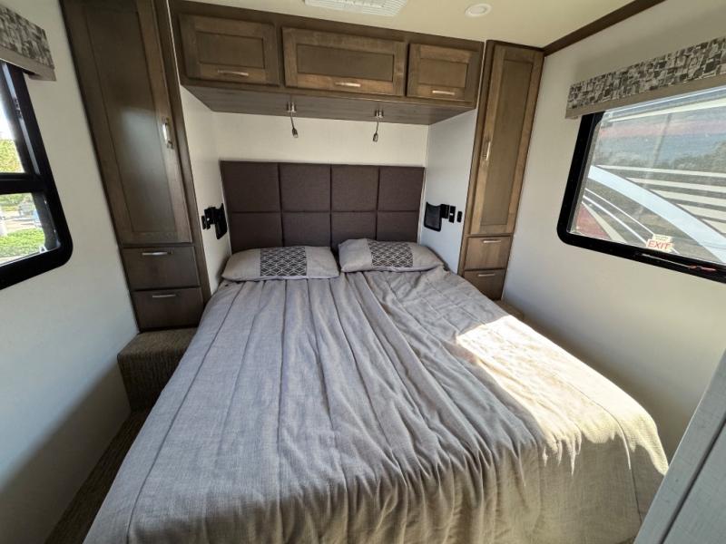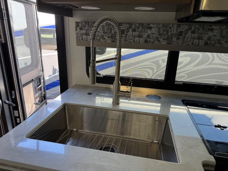 Pick a spot on the map and start traveling there in comfort with this motorhome! The rear private bedroom has a 60" x 75" gel-infused memory foam mattress for a good night's rest, LED reading lights, USB charging ports to charge your electronics while you recharge, and a 32" LED smart TV to watch movies in true comfort. The full bathroom has a designer shower with a skylight above for added head room and natural lighting and an Oxygenics body spa RV shower head for an even better showering experience on the road. The kitchen has everything you could need to prepare delicious home cooked meals including a countertop extension for more meal prepping space, and you can enjoy all of your meals at the booth dinette slide which can also transform into an extra sleeping space!