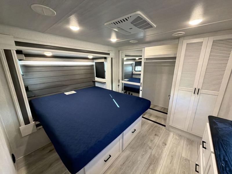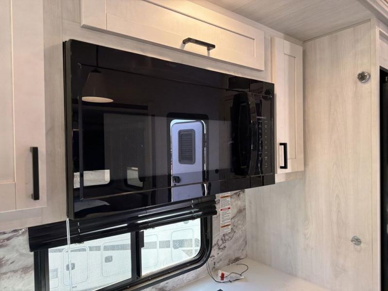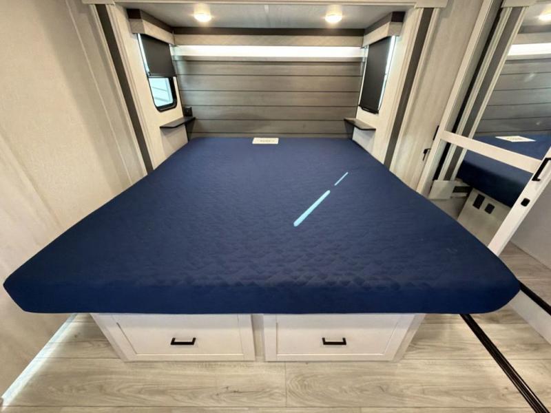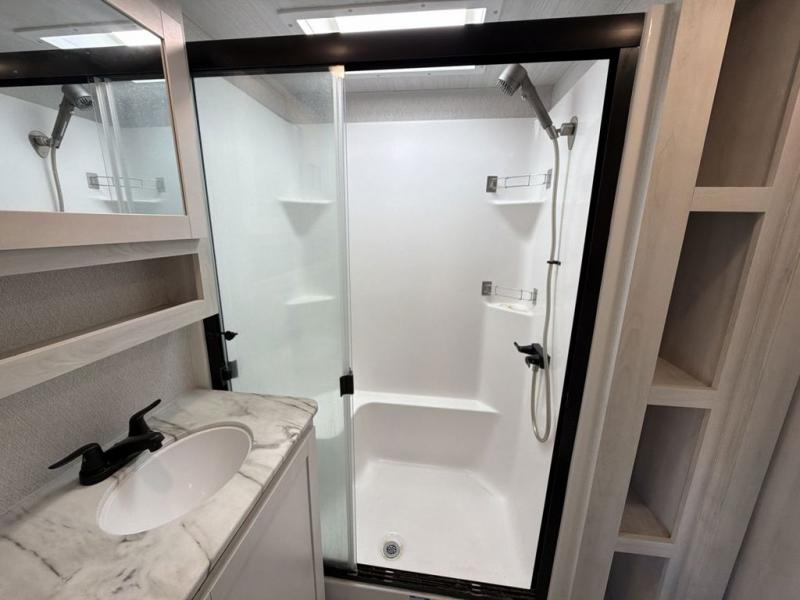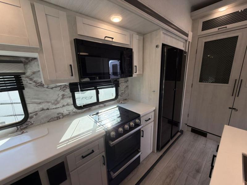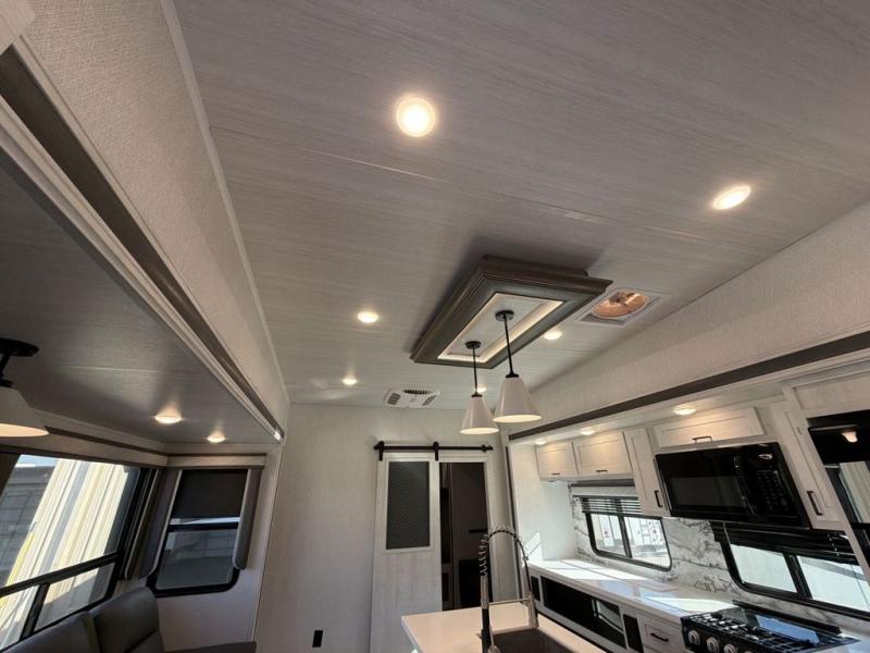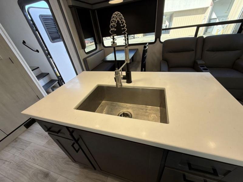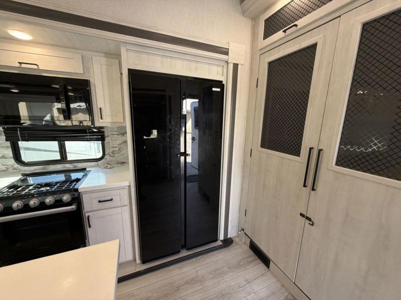 This Ahara fifth wheel is the exact answer to your prayers if you need an RV that provides you with a large private sleeping area for many children! The rear bunkhouse suite has a fold-down bunk, EZ-out sofa, a set of 28" bunks, and a 54" x 72" bunk, so it can easily sleep five. Plus, it also has its very own half bathroom which makes it extremely easy for your kids to use the bathroom at night or get ready in the morning, and the second exterior entry door is also included in this space. You'll have your own master suite to retreat to at the front, and this space includes a king bed slide with drawers under the bed and a private entrance into the main dual-entry bathroom. The chef of your group will love the spacious kitchen with its kitchen island with countertops extensions, a 24" residential oven with a four burner cooktop, a double door pantry and coat closet, plus a 16 cu. ft. 12V French door refrigerator with a double drawer freezer.