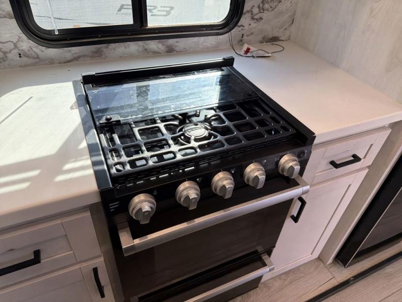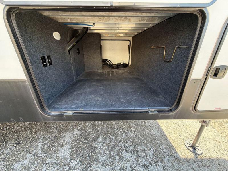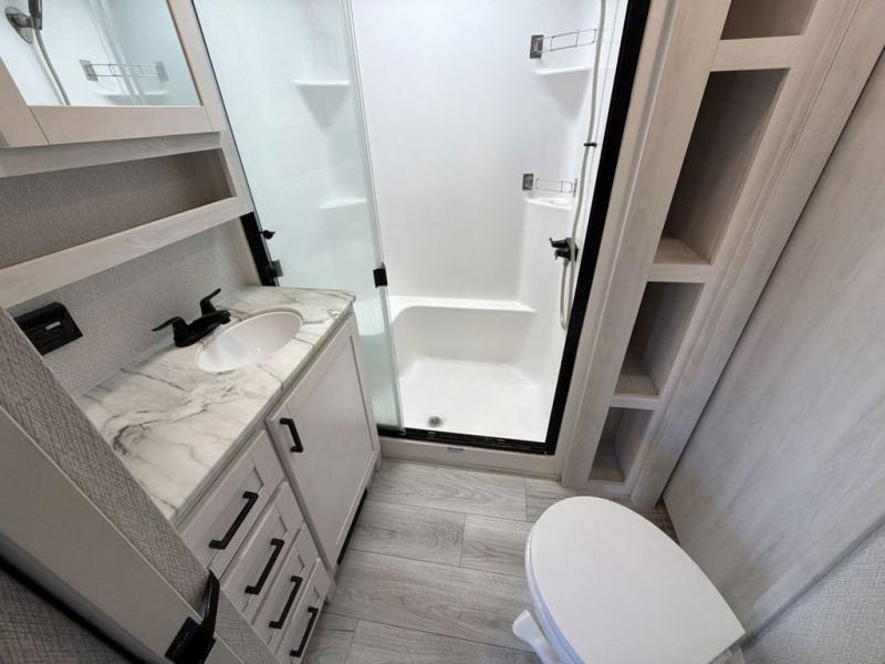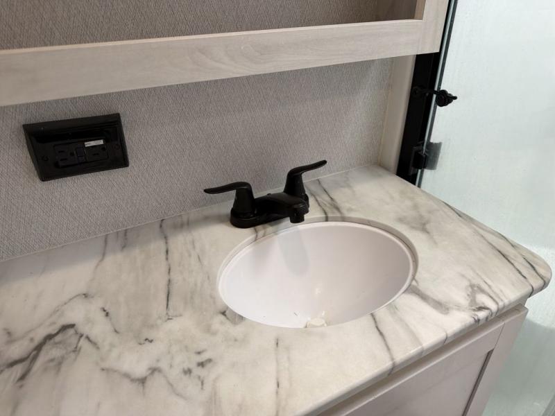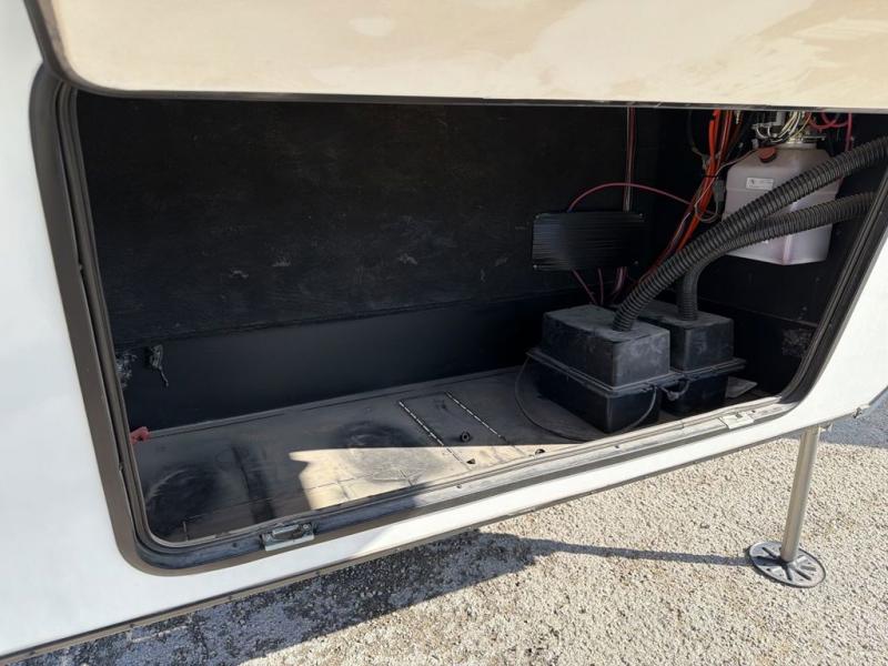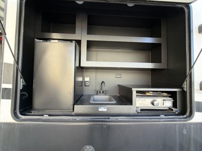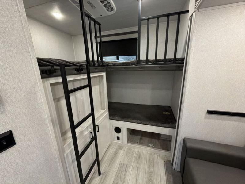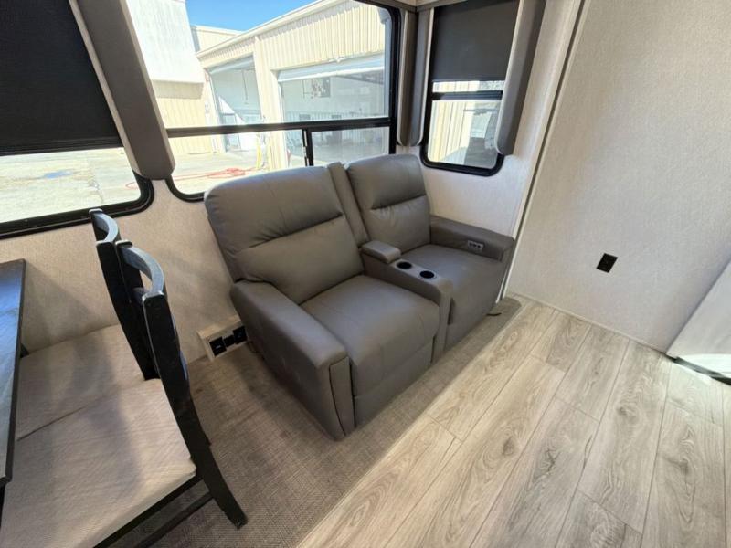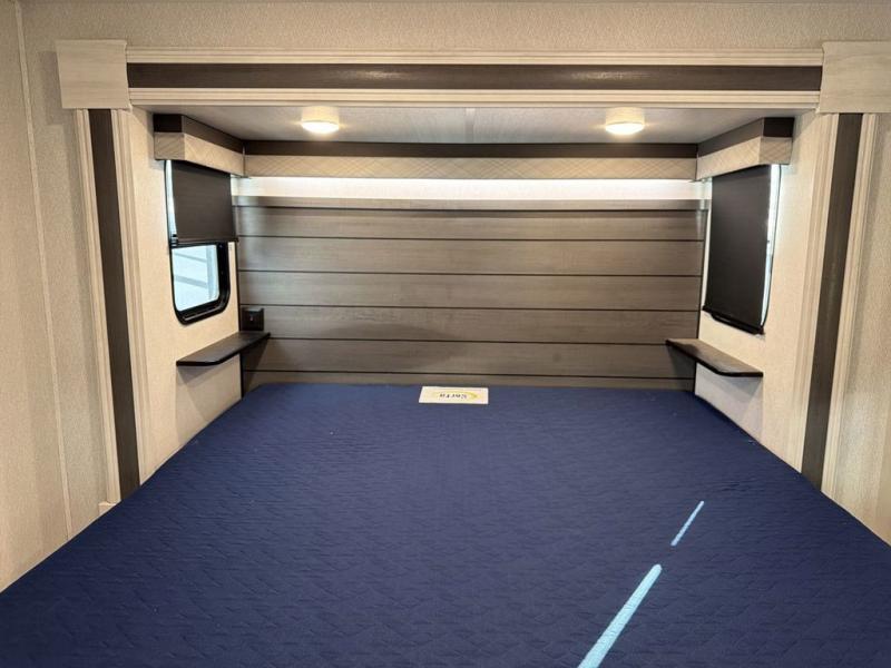 This Ahara fifth wheel is the exact answer to your prayers if you need an RV that provides you with a large private sleeping area for many children! The rear bunkhouse suite has a fold-down bunk, EZ-out sofa, a set of 28" bunks, and a 54" x 72" bunk, so it can easily sleep five. Plus, it also has its very own half bathroom which makes it extremely easy for your kids to use the bathroom at night or get ready in the morning, and the second exterior entry door is also included in this space. You'll have your own master suite to retreat to at the front, and this space includes a king bed slide with drawers under the bed and a private entrance into the main dual-entry bathroom. The chef of your group will love the spacious kitchen with its kitchen island with countertops extensions, a 24" residential oven with a four burner cooktop, a double door pantry and coat closet, plus a 16 cu. ft. 12V French door refrigerator with a double drawer freezer.
