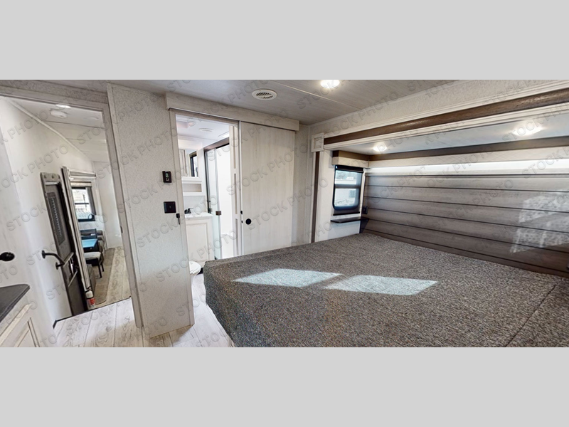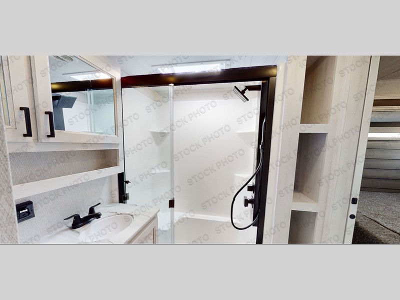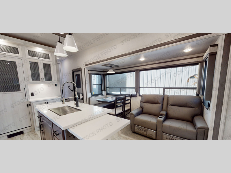 This Ahara fifth wheel is the exact answer to your prayers if you need an RV that provides you with a large private sleeping area for many children! The rear bunkhouse suite has a fold-down bunk, EZ-out sofa, a set of 28" bunks, and a 54" x 72" bunk, so it can easily sleep five. Plus, it also has its very own half bathroom which makes it extremely easy for your kids to use the bathroom at night or get ready in the morning, and the second exterior entry door is also included in this space. You'll have your own master suite to retreat to at the front, and this space includes a king bed slide with drawers under the bed and a private entrance into the main dual-entry bathroom. The chef of your group will love the spacious kitchen with its kitchen island with countertops extensions, a 24" residential oven with a four burner cooktop, a double door pantry and coat closet, plus a 16 cu. ft. 12V French door refrigerator with a double drawer freezer.