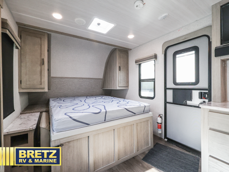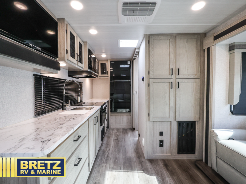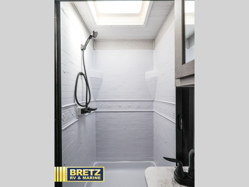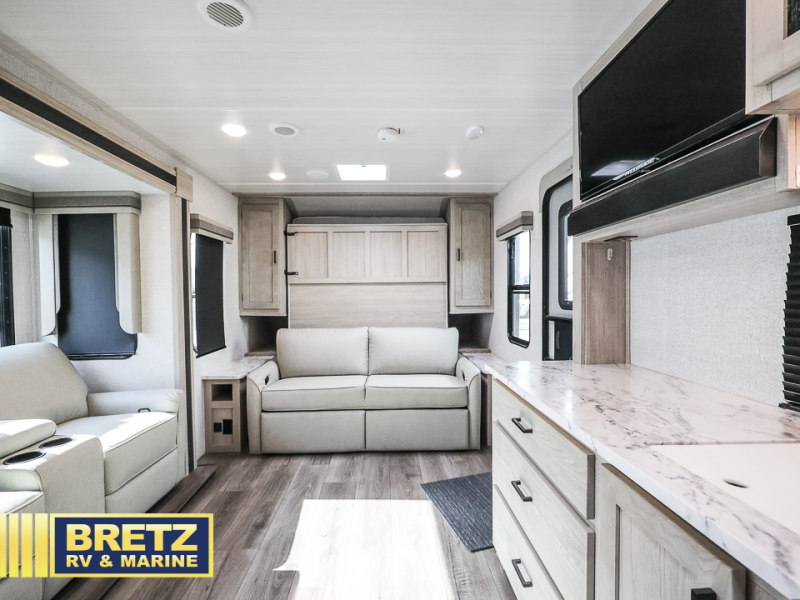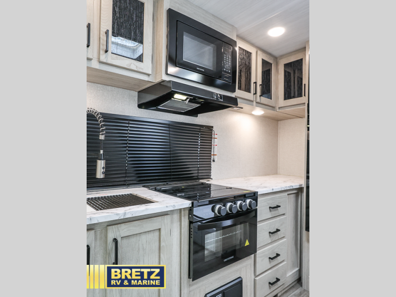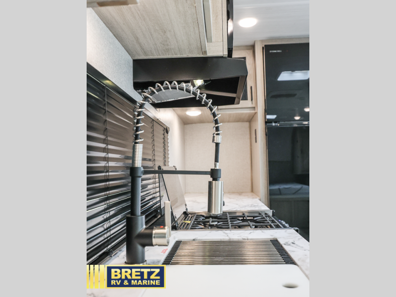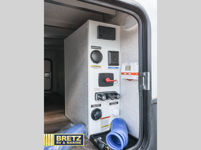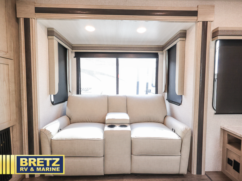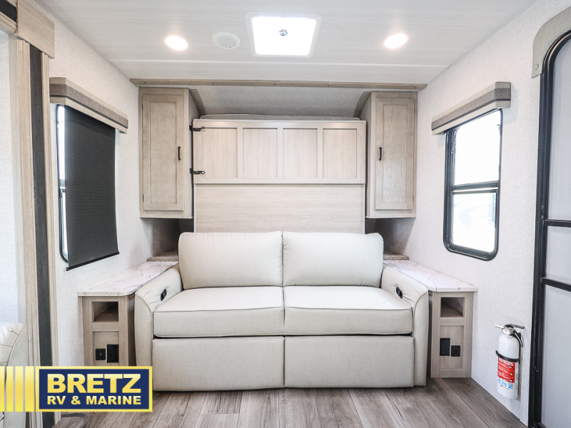 If you're looking for the perfect couple's trailer for weekend getaways you've found it in this Alta model. The queen Murphy bed up front can be folded up in the morning so you can relax on the sofa, or you may just want to enjoy your coffee on the theater seats. Your meals can be prepared on the three burner cooktop or in the microwave oven, and you can dine outdoors under the 16' power awning. This model also includes a universal docking station for an all-in one location for you hookups and utilities. How convenient!