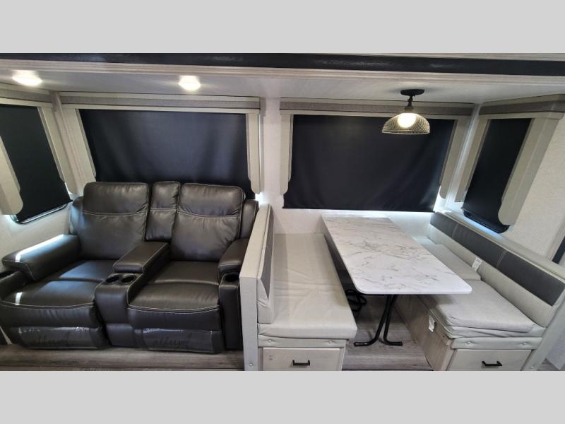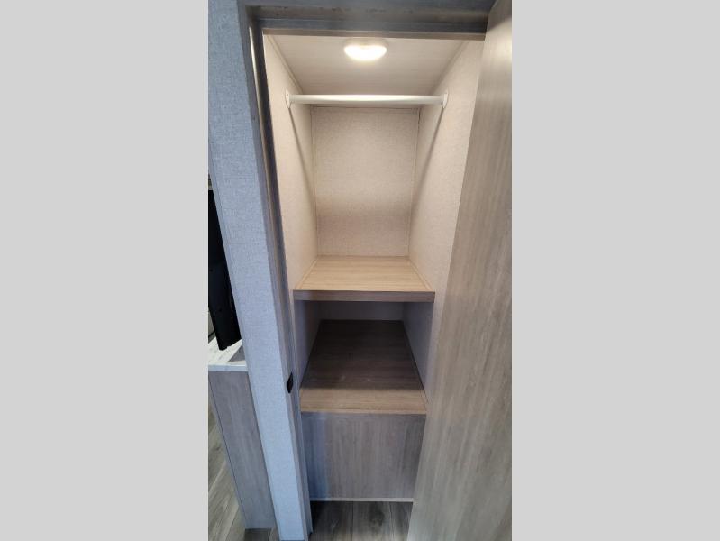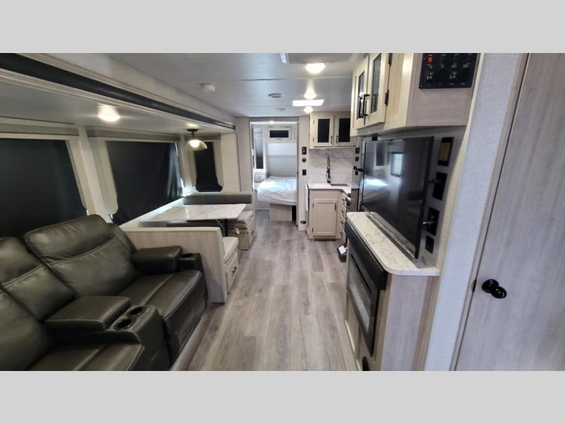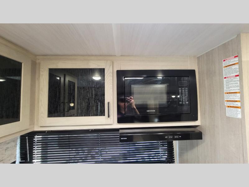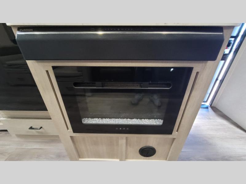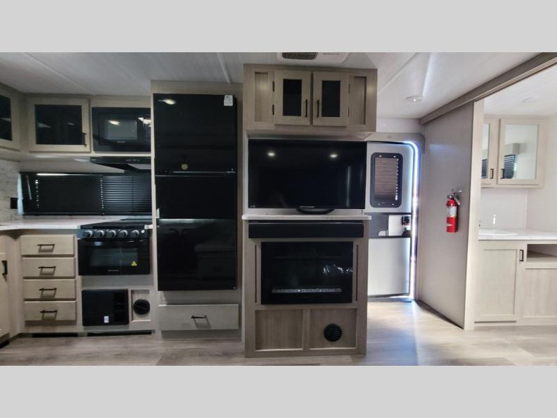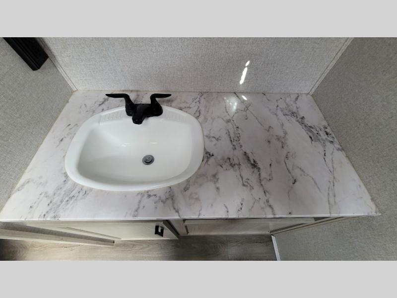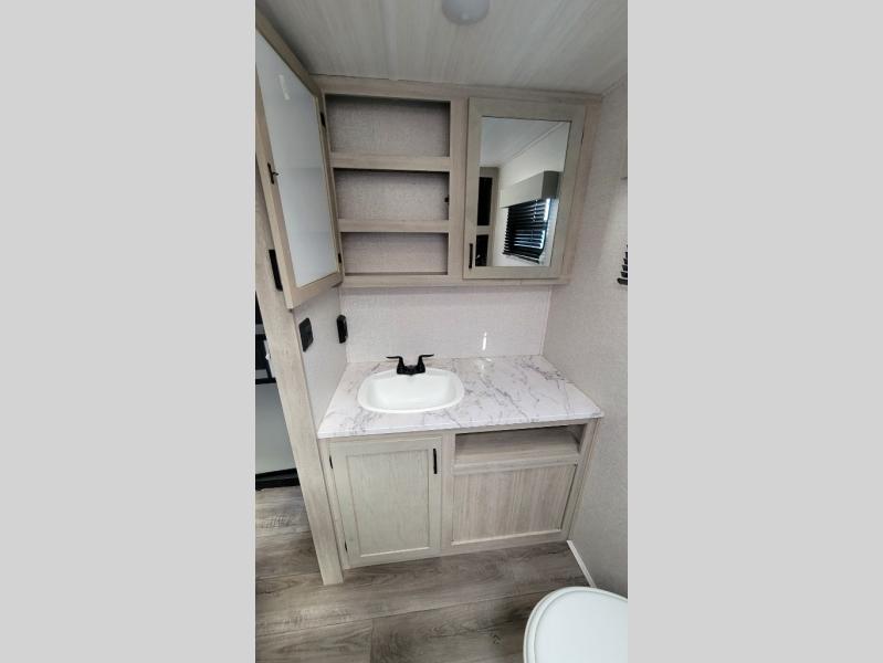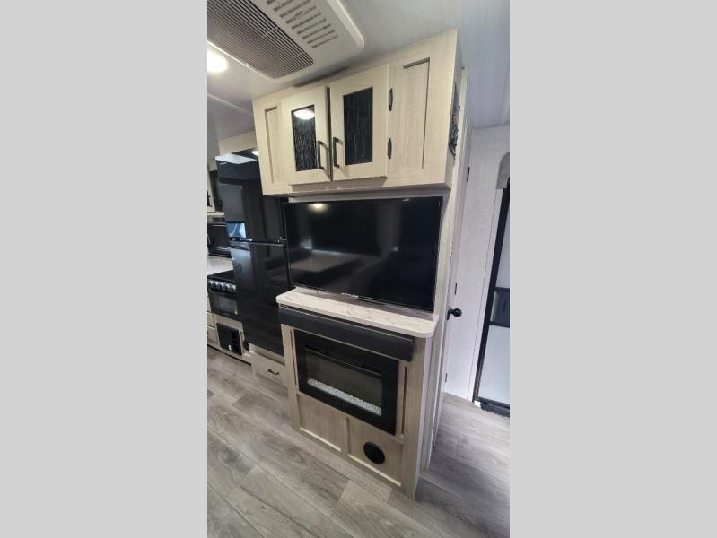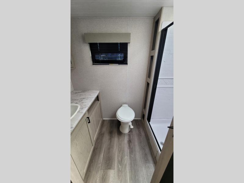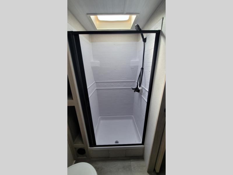 Wow! Check out the spacious full rear bath in this travel trailer for five! You'll appreciate a linen closet here and a shower skylight to let natural light in. Your crew can get comfortable on the tri-fold sofa that sits directly across from the fireplace for a more cozy feel. There is also a booth dinette here with storage space underneath for board games. Head to the kitchen to prepare dinner on the three burner cooktop, and use the countertop extension to cut fresh fruits and vegetables. A front private bedroom with a king bed and dual wardrobes will have you feeling right at home. Start camping today!