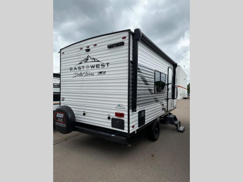 With any Della Terra travel trailers by EAST TO WEST, there is aluminum siding, bowed truss roof rafters, a one-piece seamless DiFlex ll roof, fiberglass insulation throughout, and a fully enclosed and heated underbelly with anti-puncture underbelly allowing you to stay and travel during any climate. The LE Edition value package will provide your family with USA manufactured furniture, seamless countertops (no T-mold), a solid entrance step at the main door, an outside hot and cold shower, plus an 11 cu. ft. dual hinge black glass frost free 12 volt refrigerator for your perishables. A Solera power awning with adjustable legs and LED light strip will also provide you with a great outdoor living area protected from both the sun and rain.