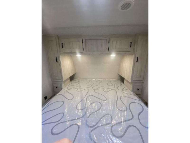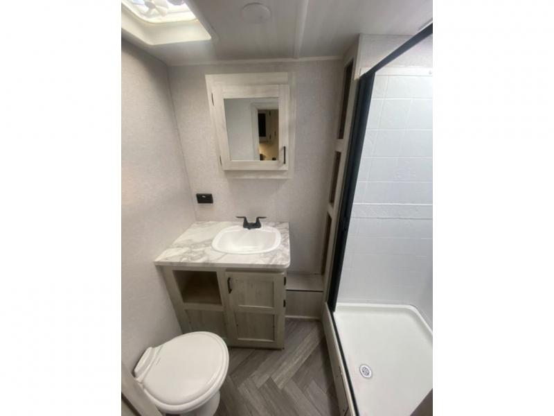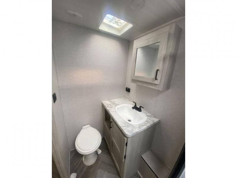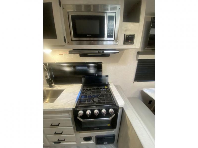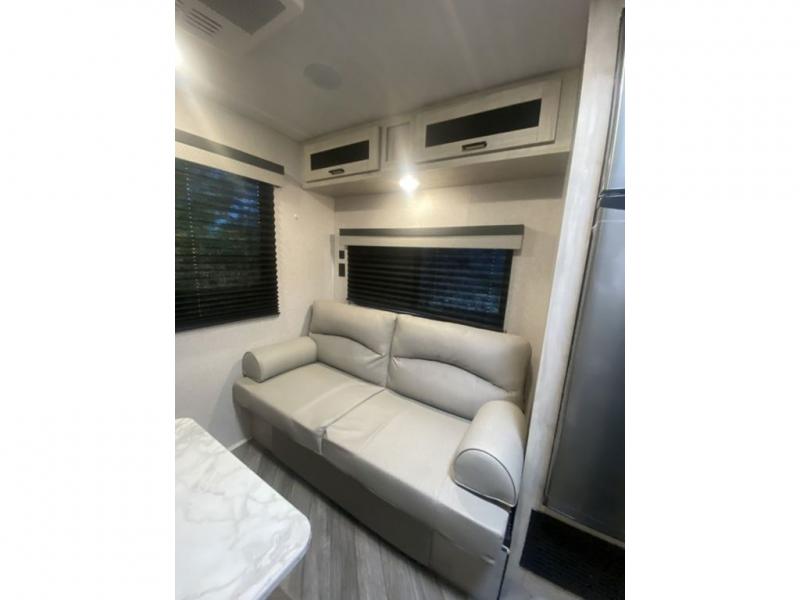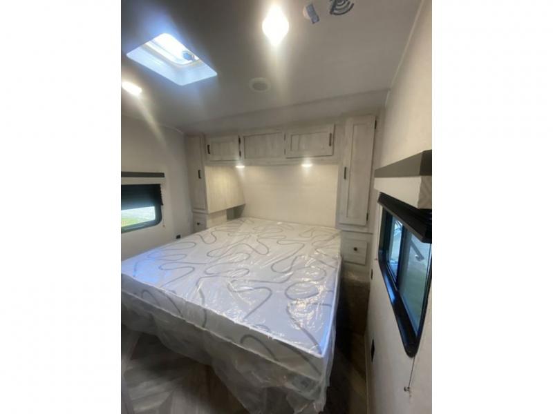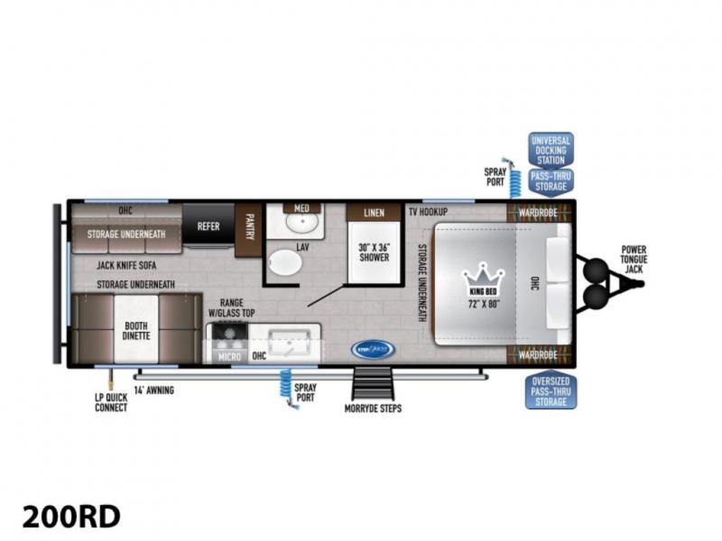 When you enjoy camping, this trailer will never let you forget it! First, you will be able to sleep like a king up front with access to the dual wardrobes to call a side your own, and there is storage underneath the bed for blankets and such, to the full bathroom that allows you to get cleaned up without having to use the campsite restrooms. There are full kitchen amenities to make hot meals including a pantry to store your dry goods and snacks and overhead cabinets for your dishes, plus you can eat at the booth dinette or while relaxing on the jack knife sofa, both also include storage underneath.