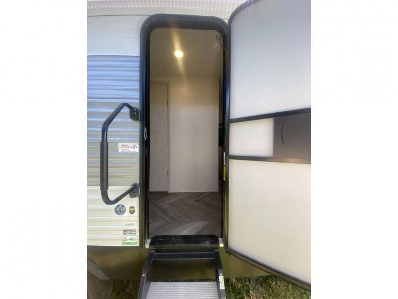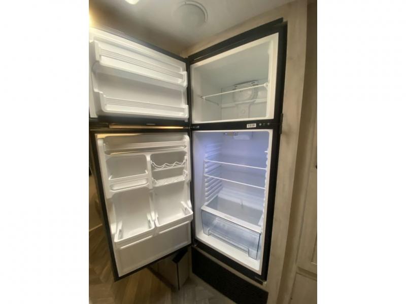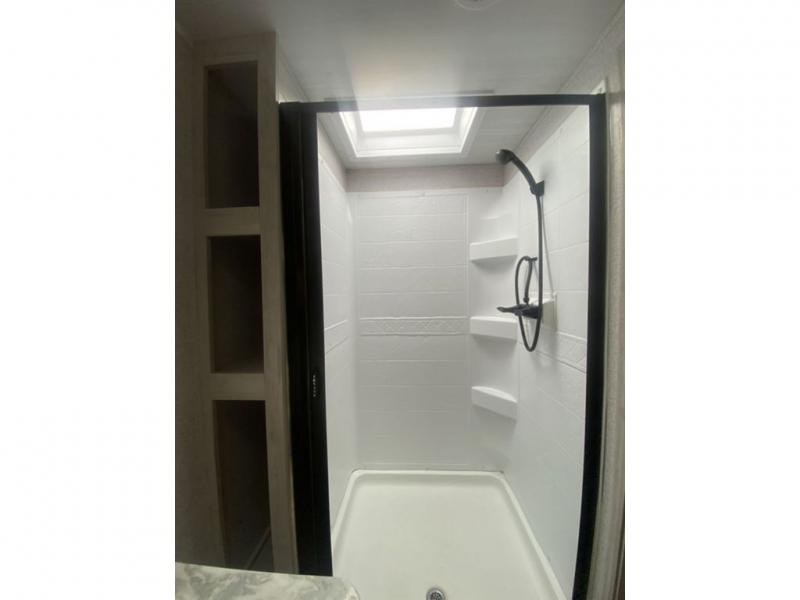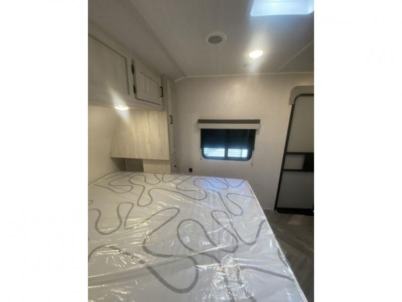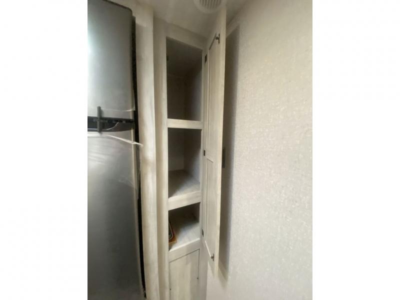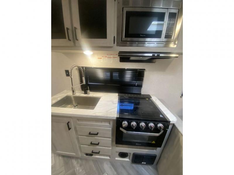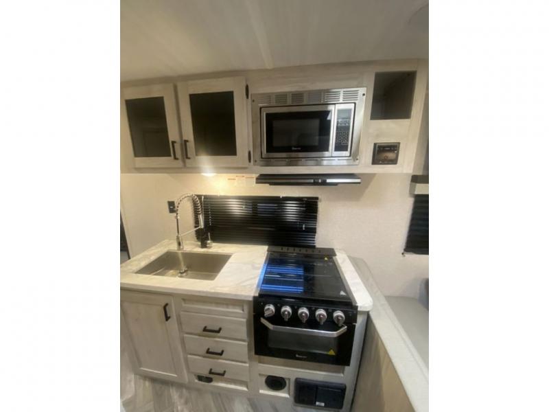 When you enjoy camping, this trailer will never let you forget it! First, you will be able to sleep like a king up front with access to the dual wardrobes to call a side your own, and there is storage underneath the bed for blankets and such, to the full bathroom that allows you to get cleaned up without having to use the campsite restrooms. There are full kitchen amenities to make hot meals including a pantry to store your dry goods and snacks and overhead cabinets for your dishes, plus you can eat at the booth dinette or while relaxing on the jack knife sofa, both also include storage underneath.
