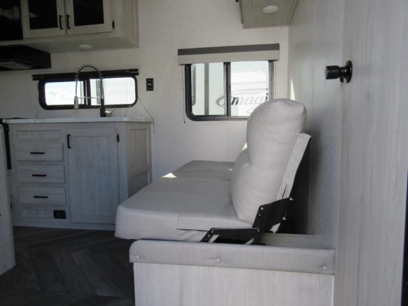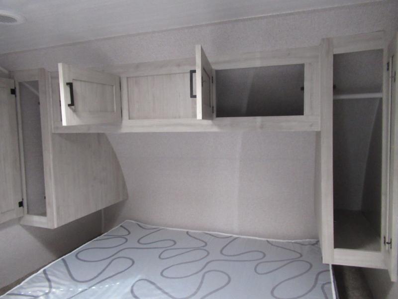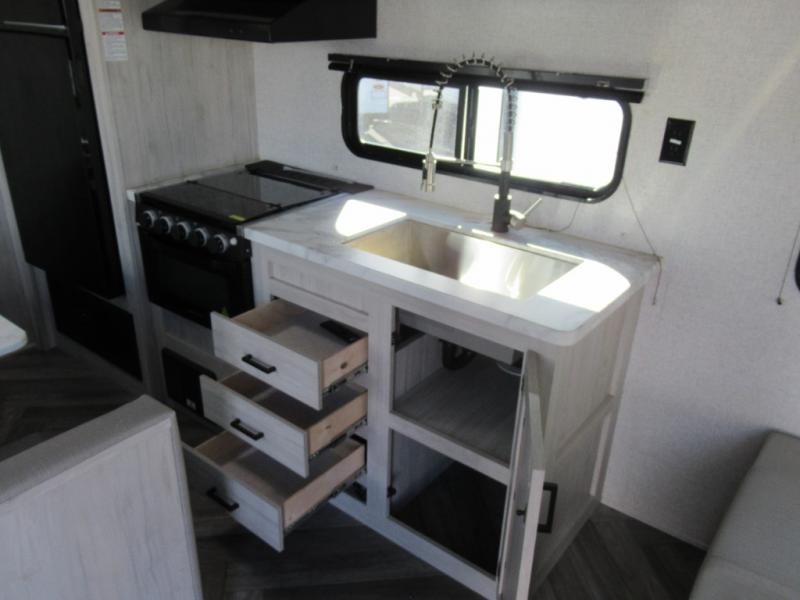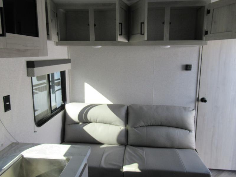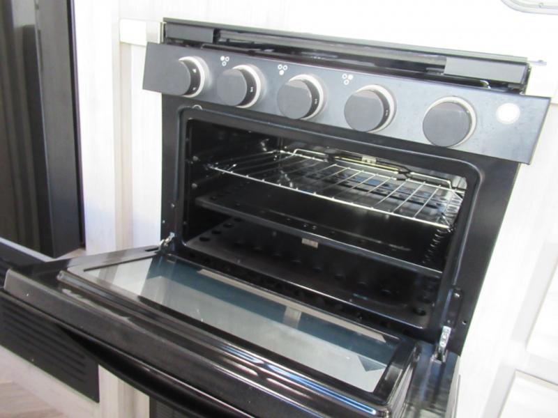 Whether you are a couple or family, this trailer allows you your own privacy in either the front bedroom or the rear bathroom. The king-size bed offers a comfortable nights sleep with plenty of room, and there are dual wardrobes and an overhead cabinet for your belongings. The spacious rear bathroom provides a radius shower, linen storage and a countertop with sink to place your toiletries. The cook will have full kitchen amenities to whip up meals, and four can dine at the booth dinette and three at the jack knife sofa while some might enjoy eating outside under the awning.
