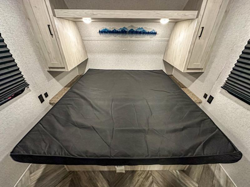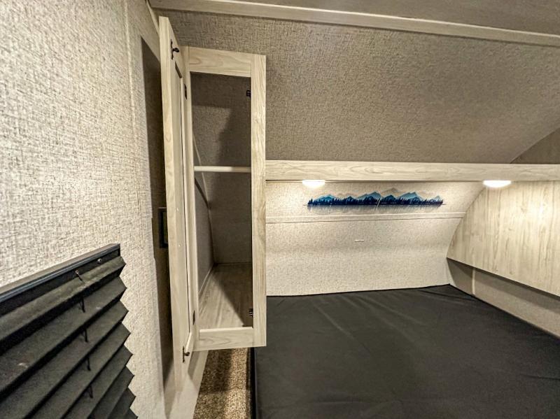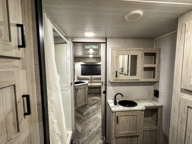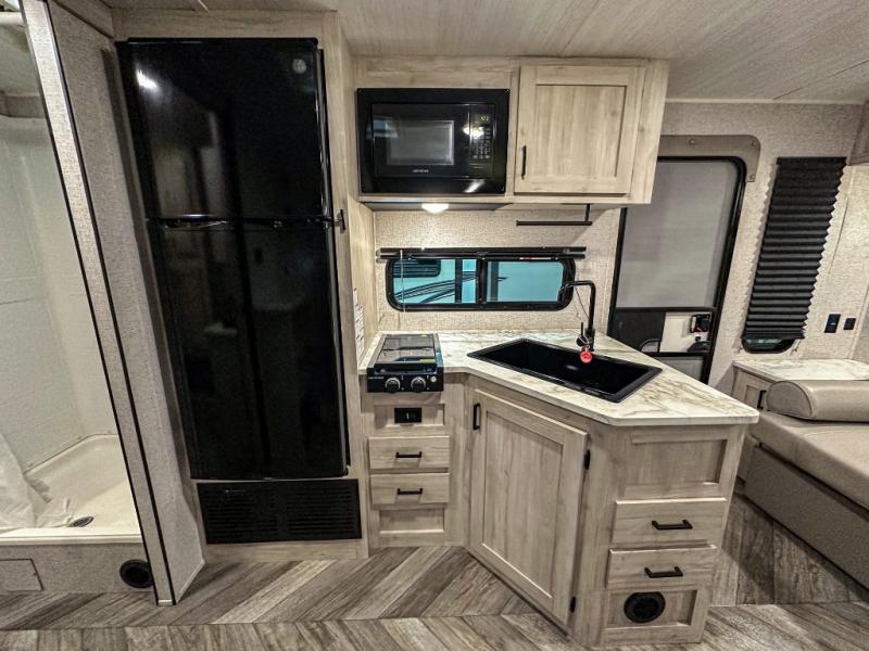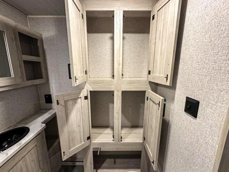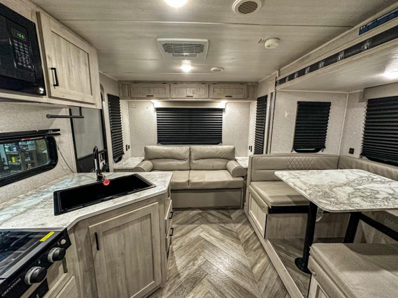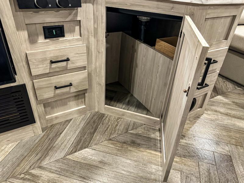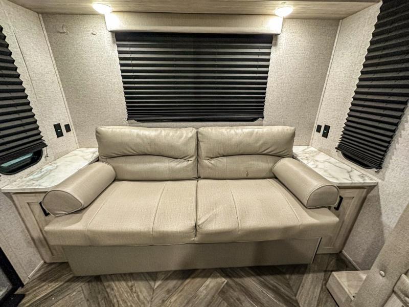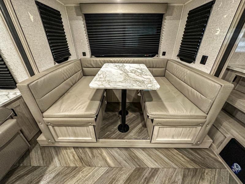A perfect Della Terra LE model for six! There is plenty of seating inside with a large u-shaped dinette slide and a jackknife sofa. The slide allows more walking around space, and there is ample storage beneath both, as well as in overhead cabinets throughout. A spacious kitchen features an angled counter with large sink, plus a two burner stove with glass top to create more counterspace when you are not cooking. A walk-through bath offers a spacious area to get cleaned up featuring a walk-in shower on one side and a toilet with vanity and sink on the other side. Space saving sliding doors make it easily accessible. In front, a private king bed with dual nightstands and wardrobes, plus storage beneath the bed and in overhead cabinets as well. There is a hookup for the TV here as well as another in the living room at the entertainment center so you can enjoy movies and television when inside if you choose to add in either location. A front pass-through storage space provides plenty of room to stow away fishing poles, outdoor games, rugs and outdoor equipment, and so much more!
