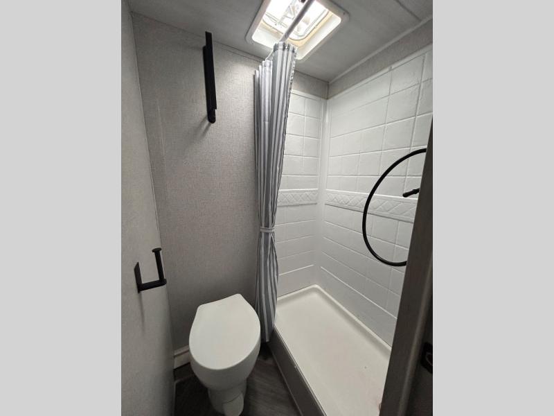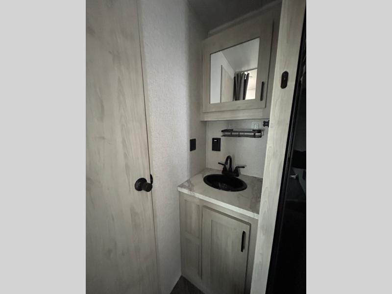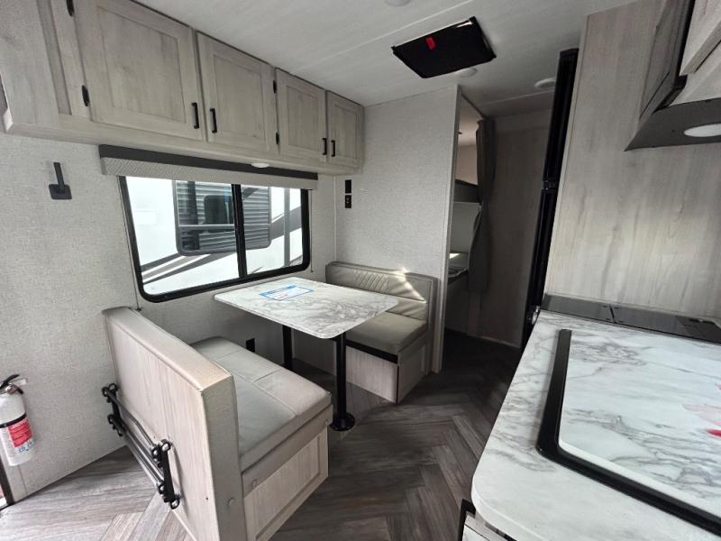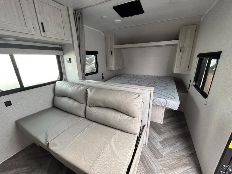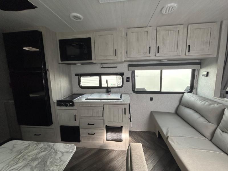 Need sleeping space for ten? This one might be the perfect one for you with 41" x 74" bunks in back, a king bed up front, a jackknife sofa with storage beneath, and a booth dinette that can be transformed into added sleeping space when needed too. This cozy trailer provides everyone a dry place to sleep and relax when inside, and you can all take turns getting cleaned up using the bathroom with a 24" x 40" walk-in shower. A two burner cooktop will allow you to whip up something to eat inside if you don't enjoy cooking over an open fire. There is also a nice 15' patio awning to provide shade and protection from the summer sun or a light rain which gives you even more space to set up outdoor living underneath with camp chairs and even a table if you choose. The exterior pass-through storage space is perfect for outdoor games, fishing poles, and any other camping gear that you might like to bring along. There is even an outside shower so you can rinse off before heading inside to keep the dirt outdoors where it belongs!