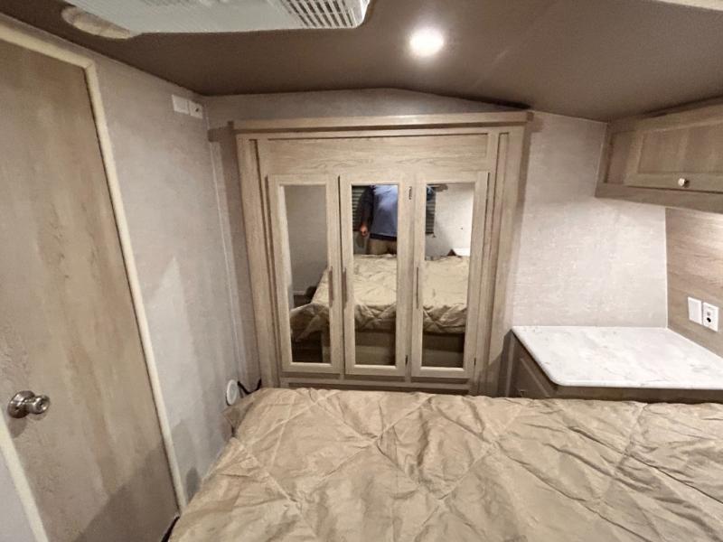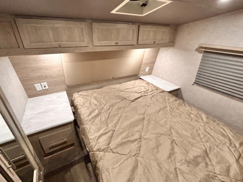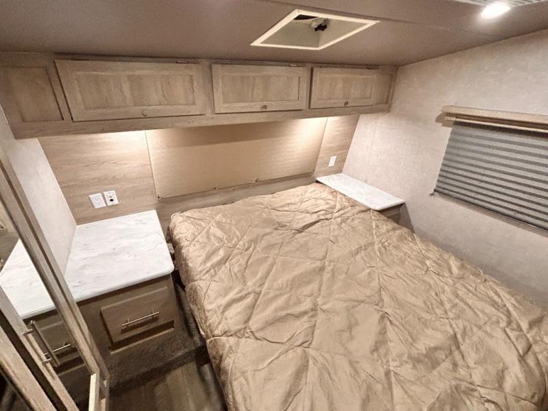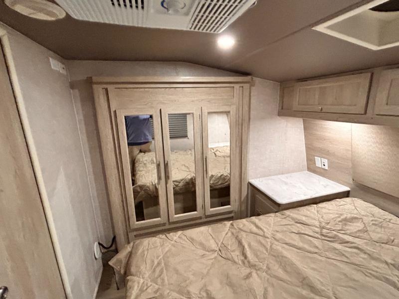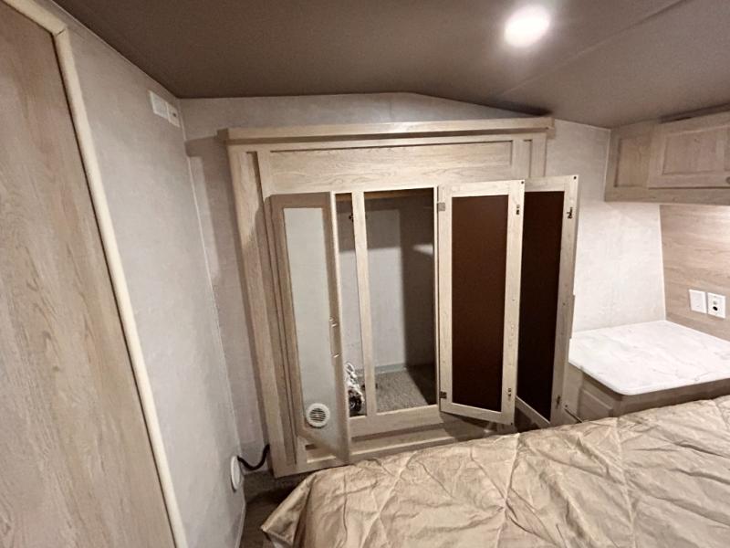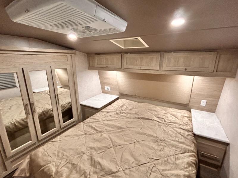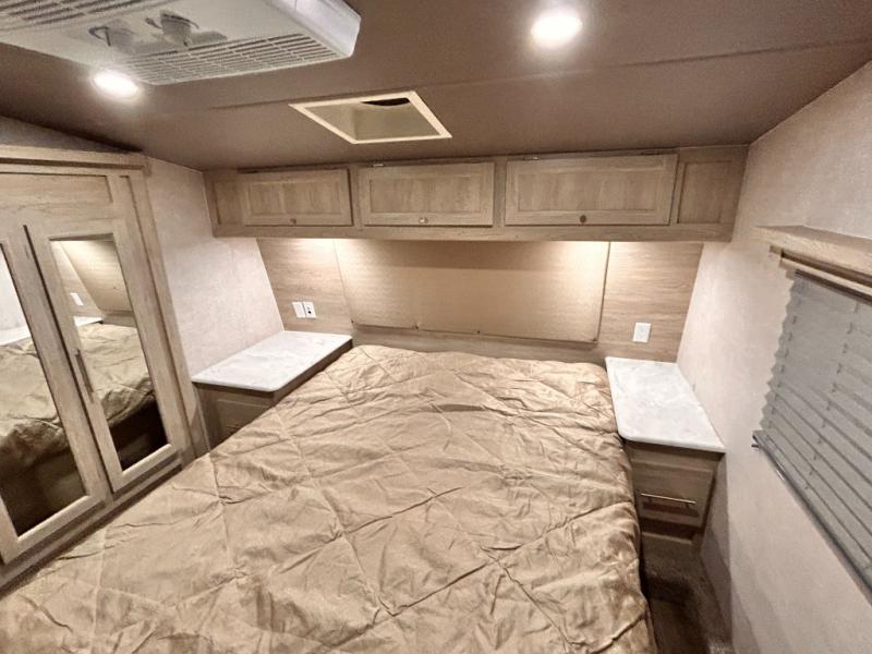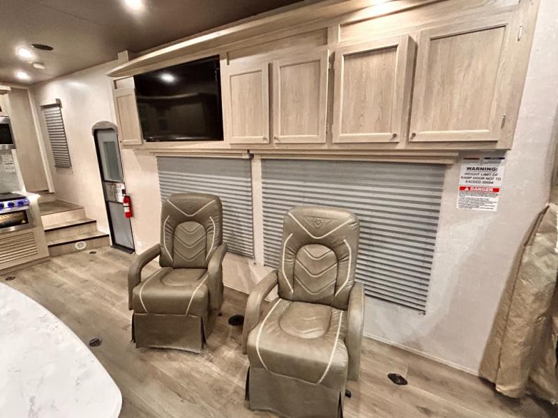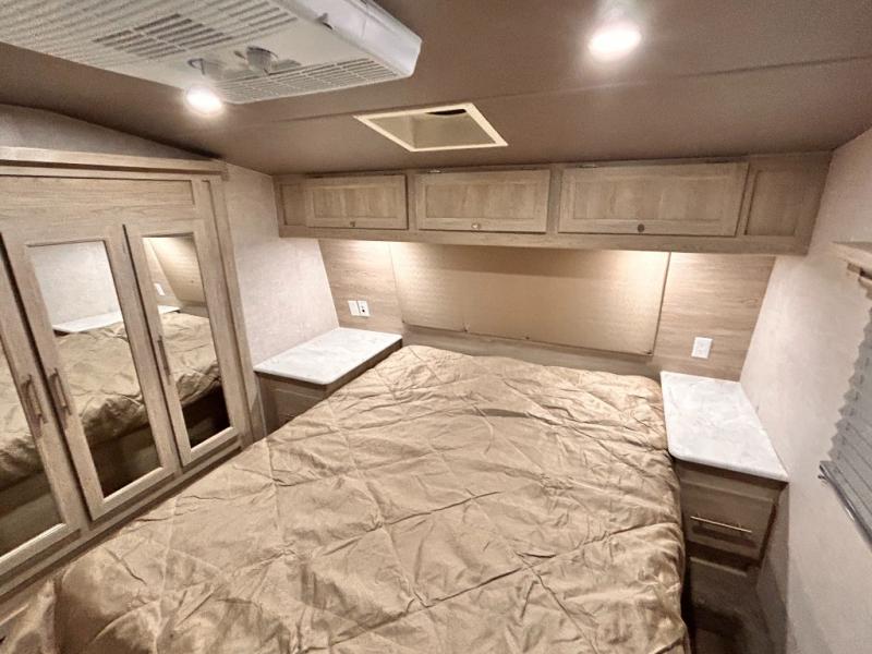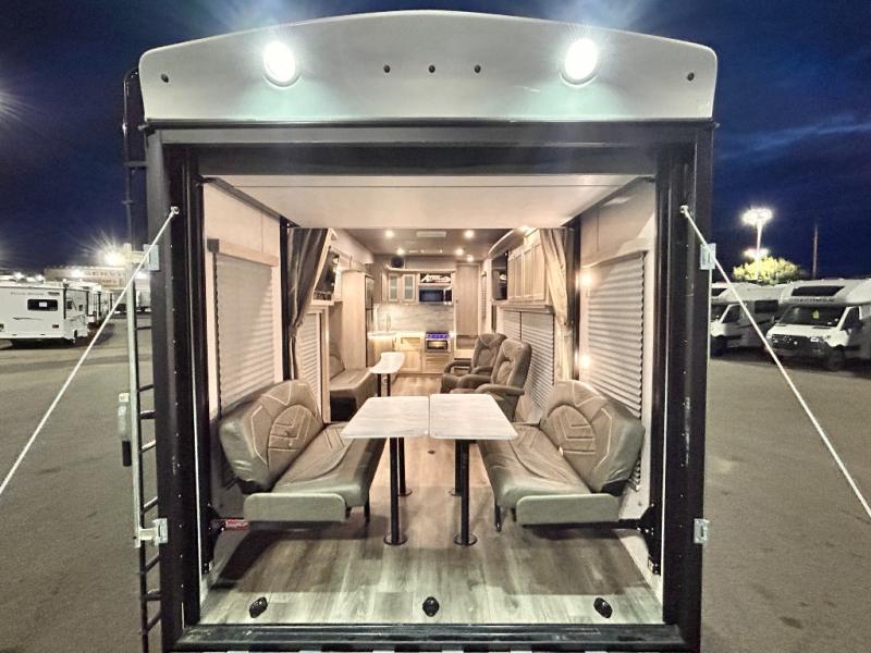 Starting with all the cargo space from 18'10" to 21' 7", you will be able to carry your motorcycles, bicycles or off-road toy to ride the dunes, jump the hills, or enjoy a smooth trail ride. Once back from the ride, someone can make a meal in the L-shaped kitchen which gives them space without having to move when people are walking around to grab a drink from the refrigerator or get to the double entry bathroom. Everyone will enjoy the spacious living area with a slide out that holds the sofa and refrigerator which provides more legroom for the two people sitting in the lounge chairs, and the dinette gives you a dining area, as well as sleeping space under the electric bed. The front bedroom offers a queen bed and storage, but if you would like more storage space then add the optional wardrobe slide.