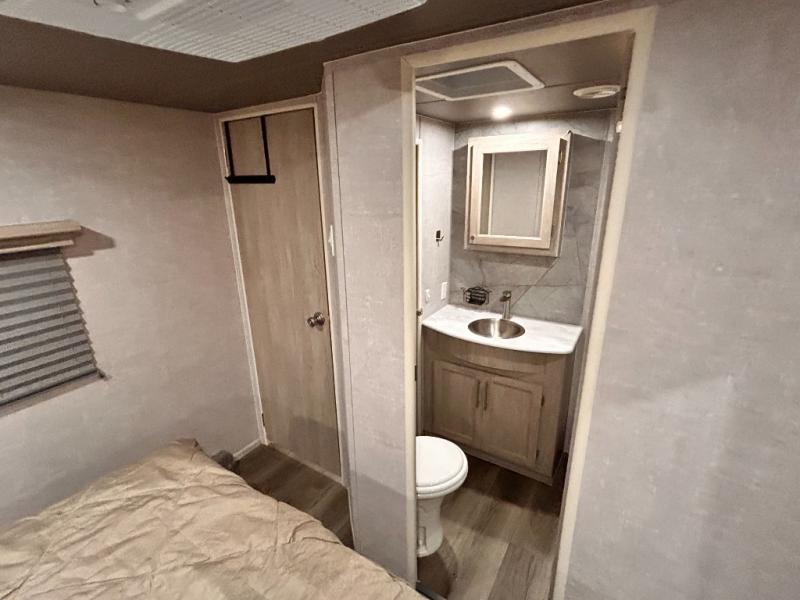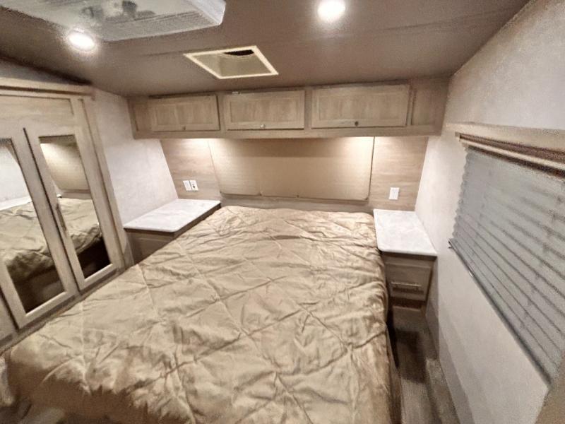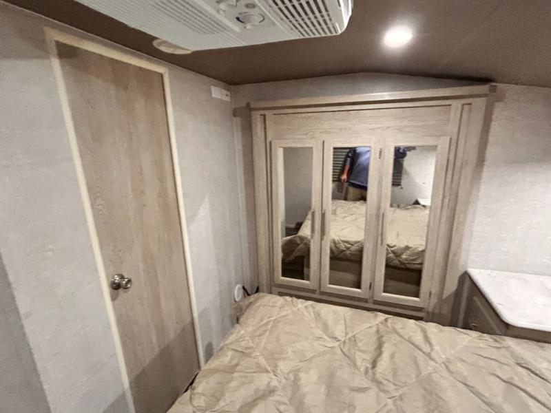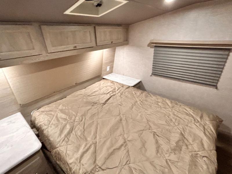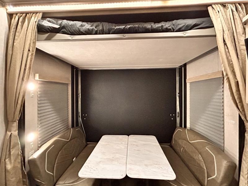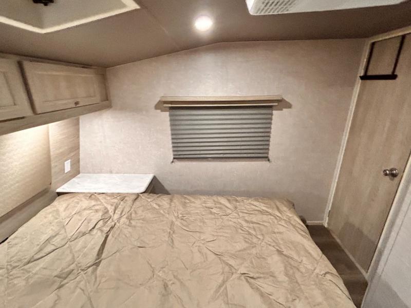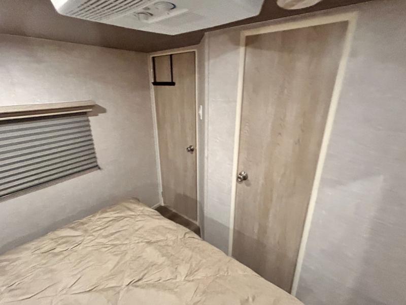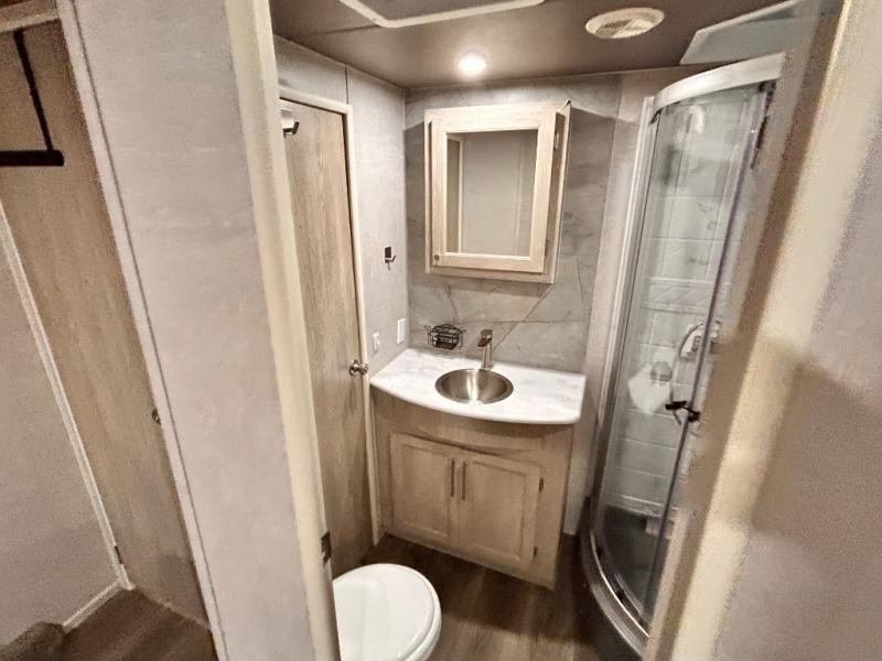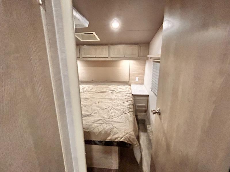Starting with all the cargo space from 18'10" to 21' 7", you will be able to carry your motorcycles, bicycles or off-road toy to ride the dunes, jump the hills, or enjoy a smooth trail ride. Once back from the ride, someone can make a meal in the L-shaped kitchen which gives them space without having to move when people are walking around to grab a drink from the refrigerator or get to the double entry bathroom. Everyone will enjoy the spacious living area with a slide out that holds the sofa and refrigerator which provides more legroom for the two people sitting in the lounge chairs, and the dinette gives you a dining area, as well as sleeping space under the electric bed. The front bedroom offers a queen bed and storage, but if you would like more storage space then add the optional wardrobe slide.