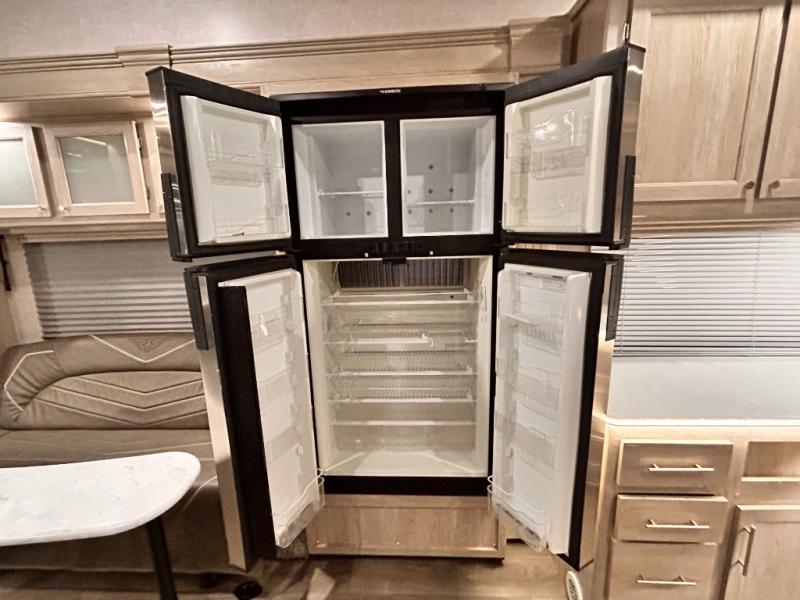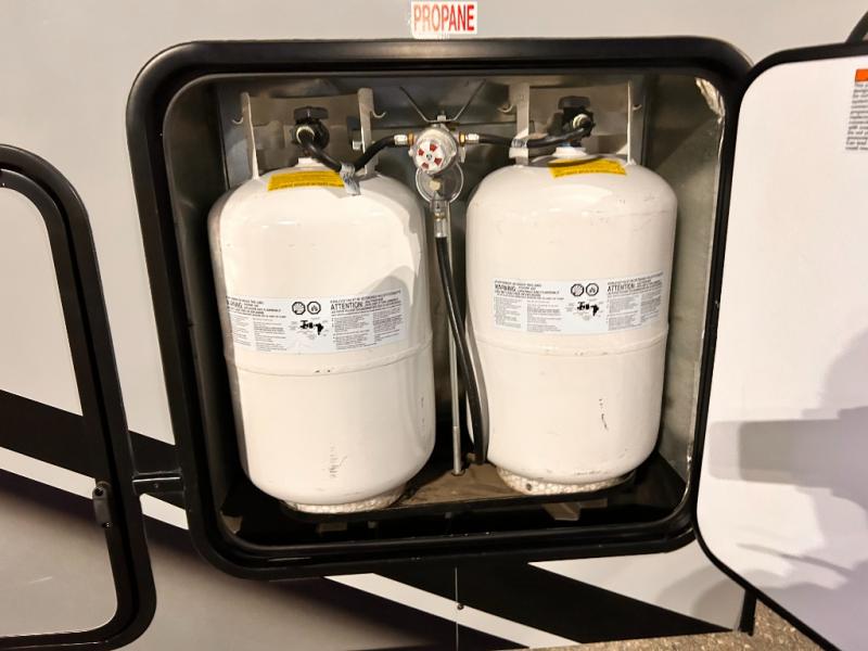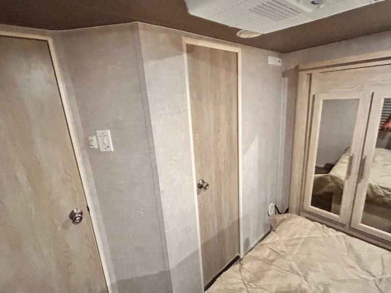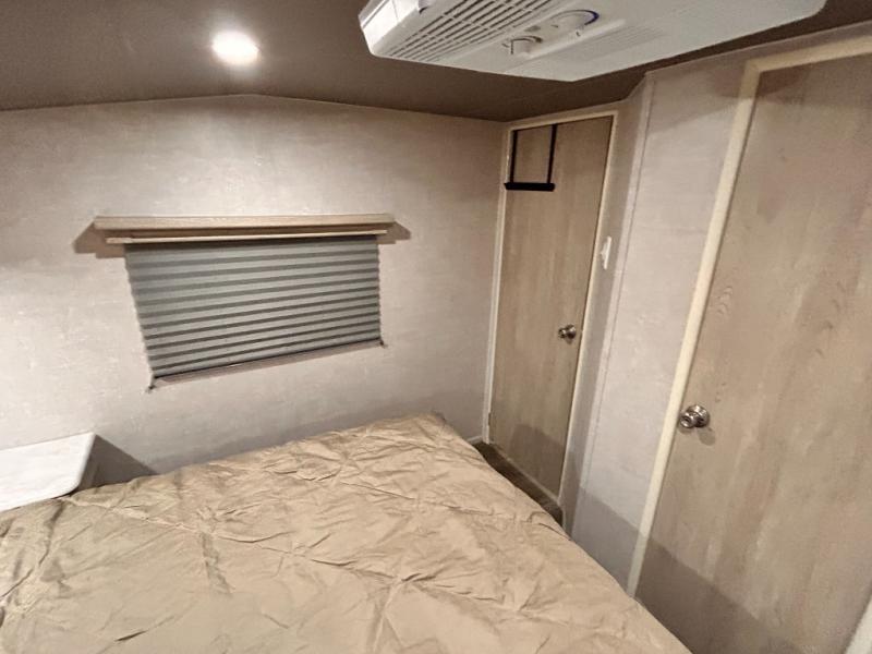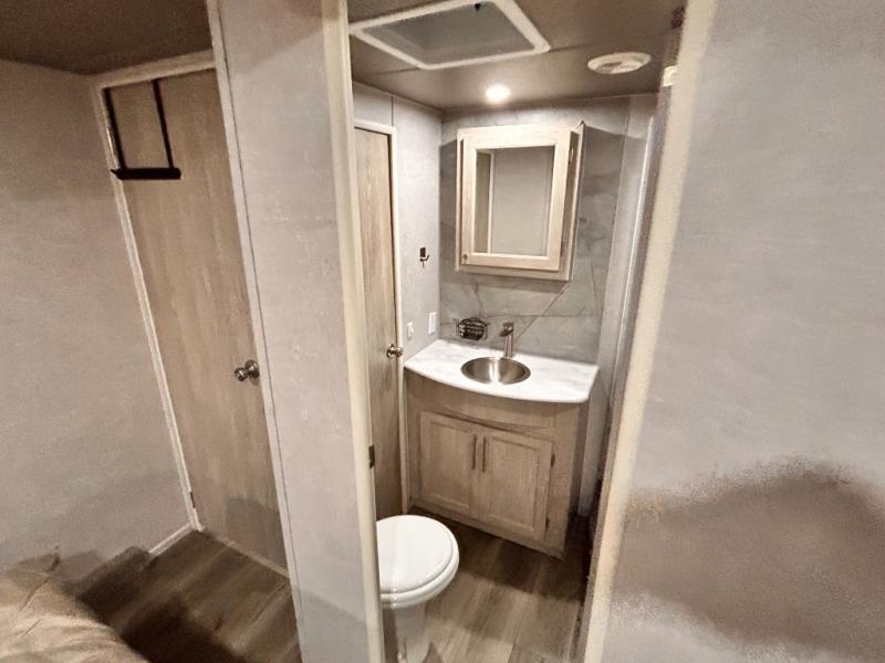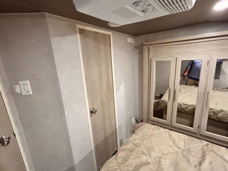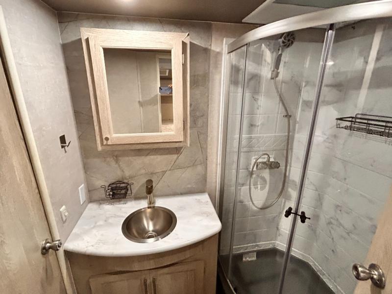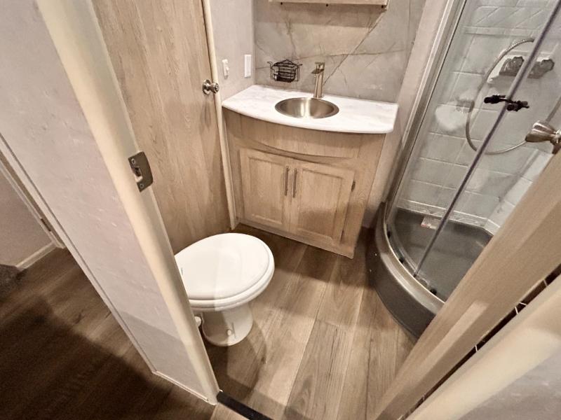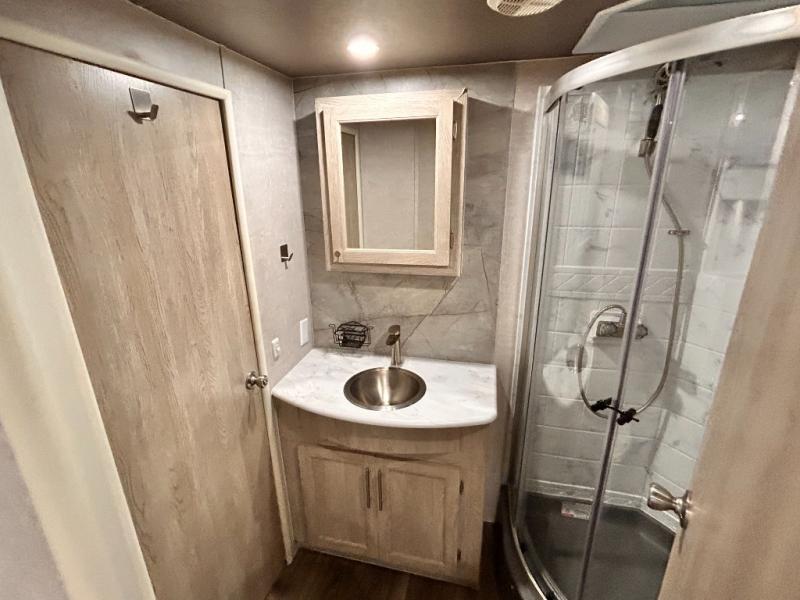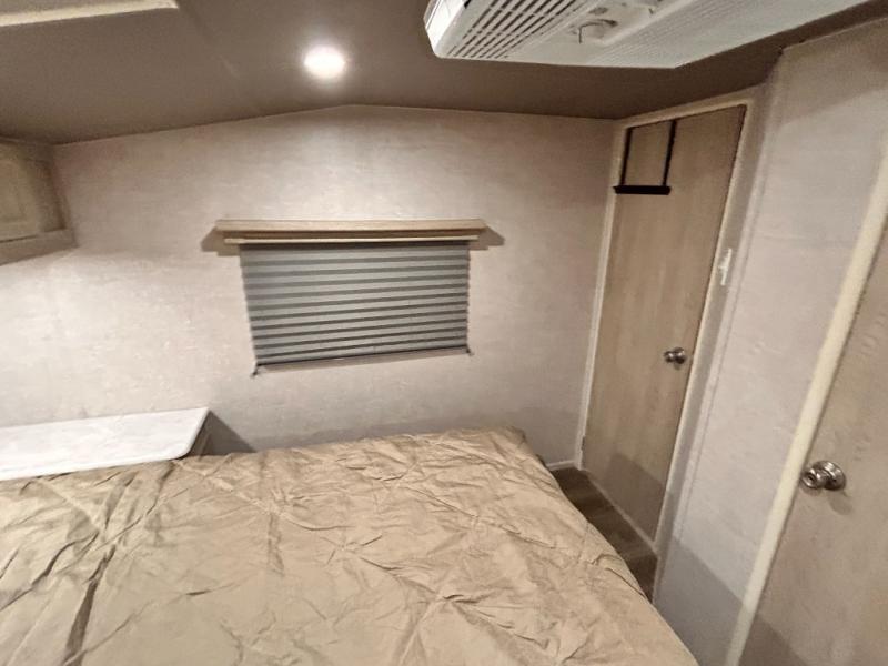 Starting with all the cargo space from 18'10" to 21' 7", you will be able to carry your motorcycles, bicycles or off-road toy to ride the dunes, jump the hills, or enjoy a smooth trail ride. Once back from the ride, someone can make a meal in the L-shaped kitchen which gives them space without having to move when people are walking around to grab a drink from the refrigerator or get to the double entry bathroom. Everyone will enjoy the spacious living area with a slide out that holds the sofa and refrigerator which provides more legroom for the two people sitting in the lounge chairs, and the dinette gives you a dining area, as well as sleeping space under the electric bed. The front bedroom offers a queen bed and storage, but if you would like more storage space then add the optional wardrobe slide.