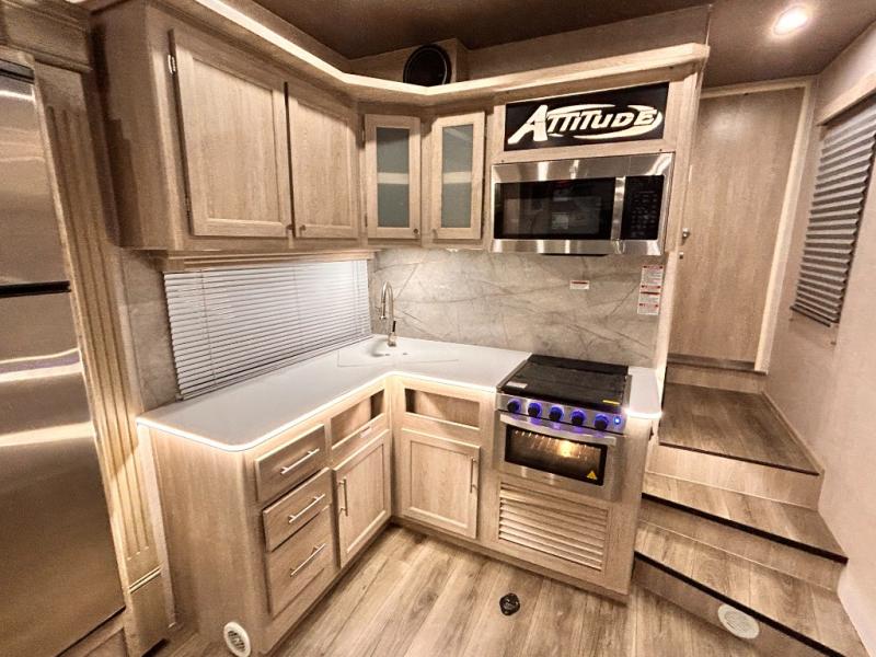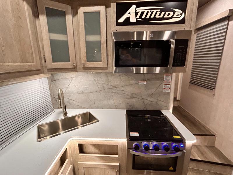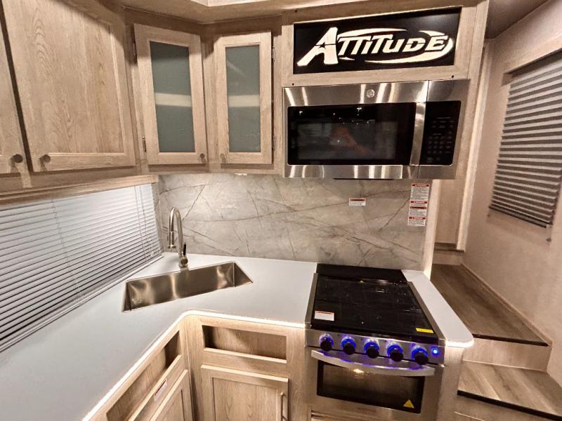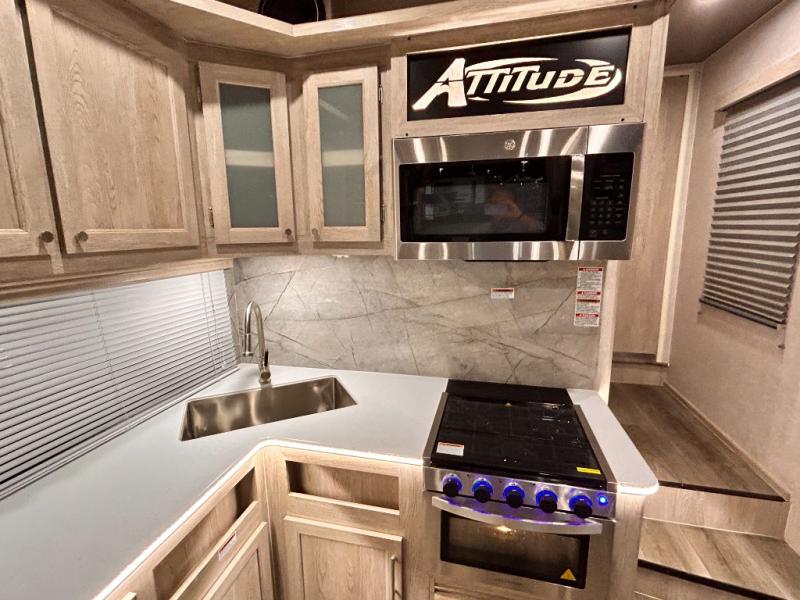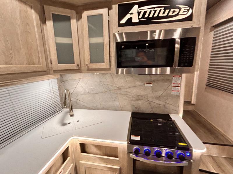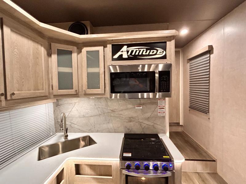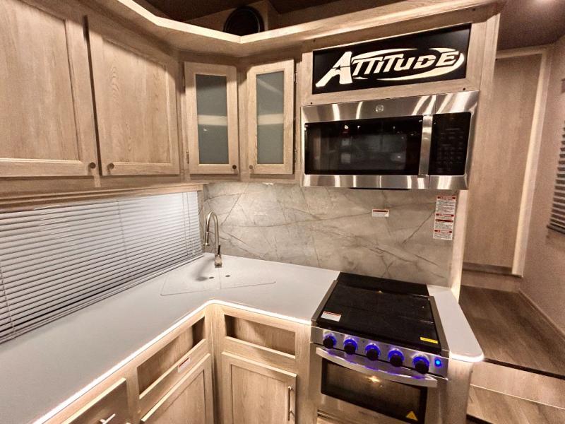 With each Eclipse Attitude Wide Lite toy hauler you begin with a powder coated chassis with laminated, aluminum framed fiberglass sidewalls and fiberglass caps with the front cap having an LED light, and a decked walk-on roof. The 100 AMP lithium LiFePO4 battery/330 watt solar panel, the 40 gallon fuel station, and the 4.0K Onan generator with transfer switch will keep everything up and running when you venture off-grid. The interior offers several colors to choose from to customize your toy hauler, LED lights with a dimmer, versatile sleeping accommodations, and a lighted solid surface galley top. The Hi Rez LED lights, the curbside under glow LED lighting and the Hi Def exterior graphics offer the attitude you are looking for! Make your selection today!