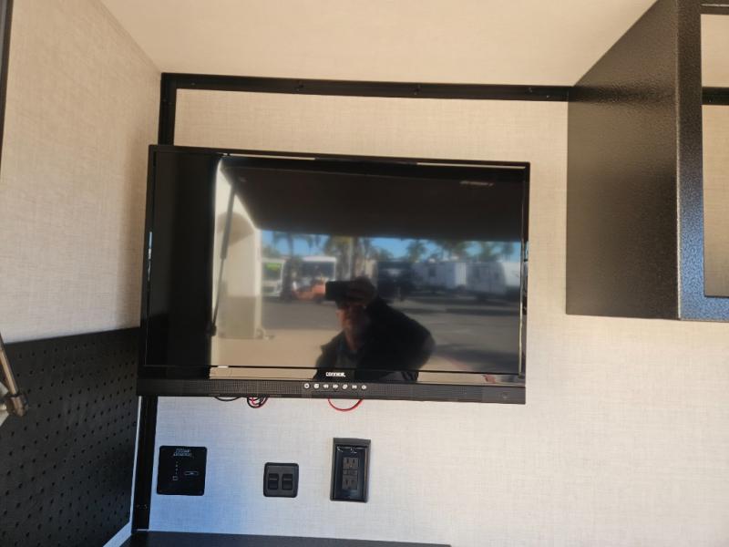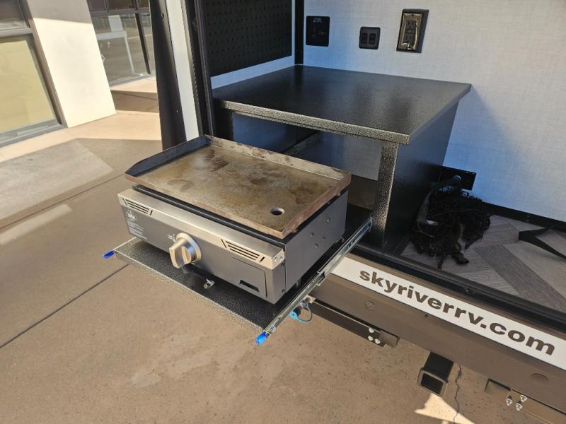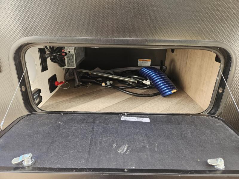 If you desire camping in the woods with your favorite person then you need this travel trailer! You can rest up each night on the futon sofa with an overhead shelf and nightstand nearby to set your glass of water. There is also a wardrobe to keep your clothes looking nice and a mobile desk/table to get some work done or eat a meal that you prepared with the rear outdoor kitchen. You even have a Camco DC 12V/AC 110V portable 75- liter refrigerator/cooler/freezer to keep your perishables fresh and a 12V HDTV with a built-in Bluetooth soundbar AV system to crank up the tunes while you cook. The front exterior not only has a lockable gear box, but also a pass-through storage area for all of your camping essentials!