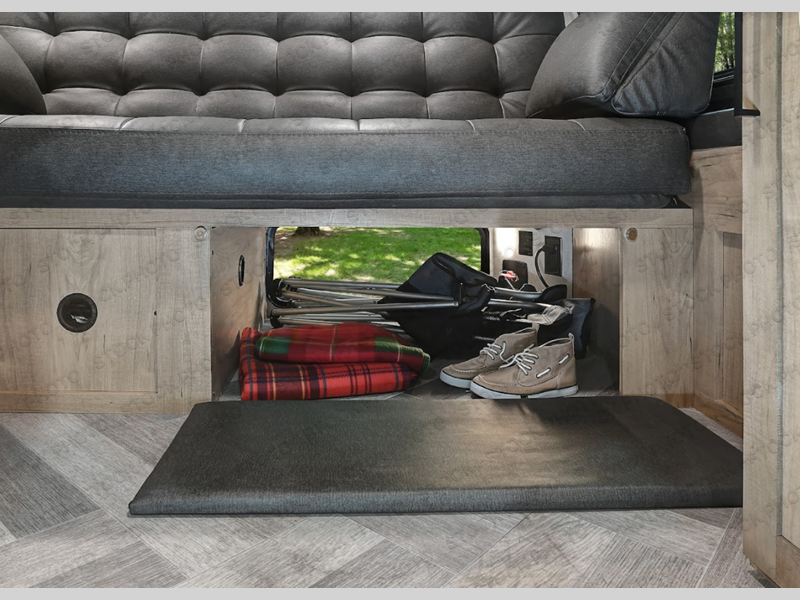 If you desire camping in the woods with your favorite person then you need this travel trailer! You can rest up each night on the futon sofa with an overhead shelf and nightstand nearby to set your glass of water. There is also a wardrobe to keep your clothes looking nice and a mobile desk/table to get some work done or eat a meal that you prepared with the rear outdoor kitchen. You even have a Camco DC 12V/AC 110V portable 75- liter refrigerator/cooler/freezer to keep your perishables fresh and a 12V HDTV with a built-in Bluetooth soundbar AV system to crank up the tunes while you cook. The front exterior not only has a lockable gear box, but also a pass-through storage area for all of your camping essentials!
