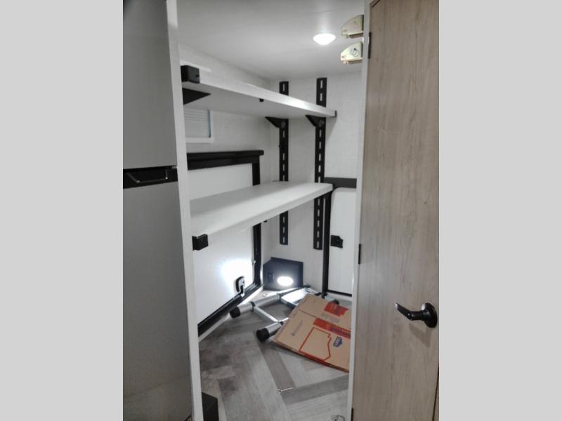 This unique travel trailer offers versatile living! Starting with the front Murphy bed that has a 60" x 80" queen bed to lay your head on at night and can convert into a sofa for seating during the day with a nightstand and a 12V HDTV/AV system to watch your favorite movies in bed. Create your best home cooked meals with the two burner cooktop and 12V refrigerator then enjoy them at the jackknife sofa slide with a removable table. Behind the sofa are dual storage cubbies and it can also convert into an extra sleeping space. The repositionable Embertack E-track bunk/storage system has a 74" x 46" cargo space for your items and a storage locker door to access them from the exterior. You can enjoy twin bunks or convert them to double-size bunks to sleep two to four. The exterior also has a kayak/bike storage door, front pass-through storage area, and a 2" accessory receiver!
