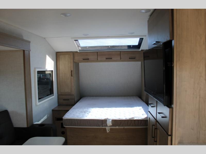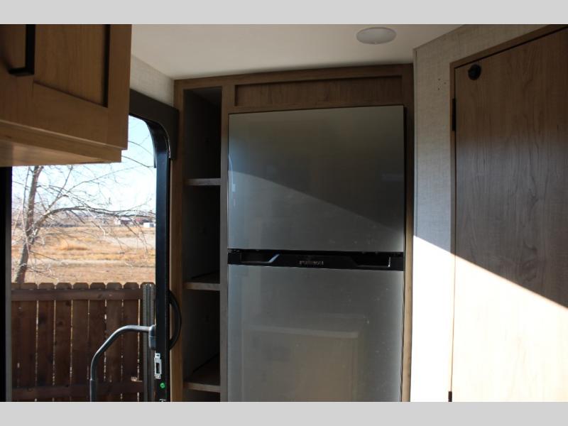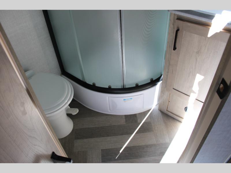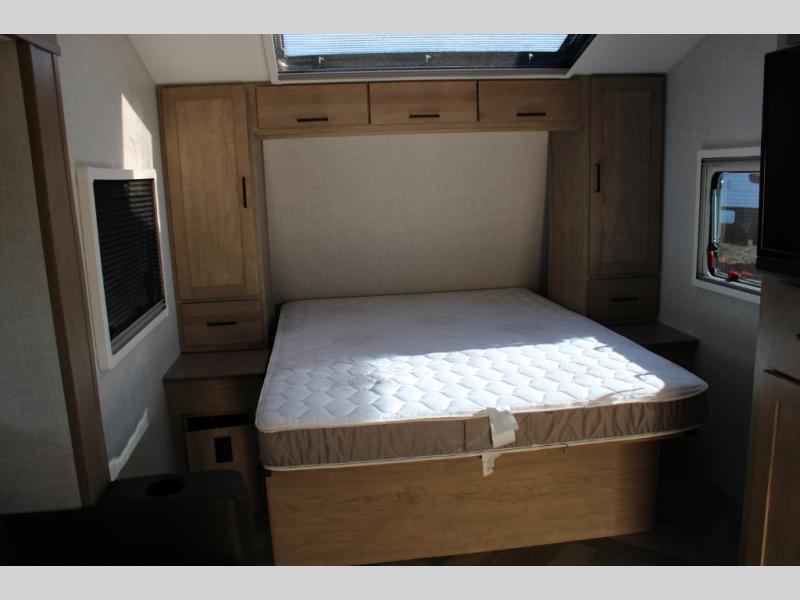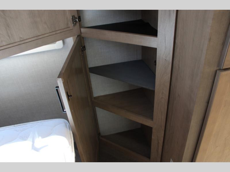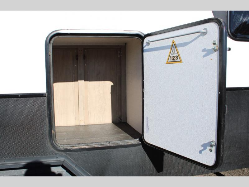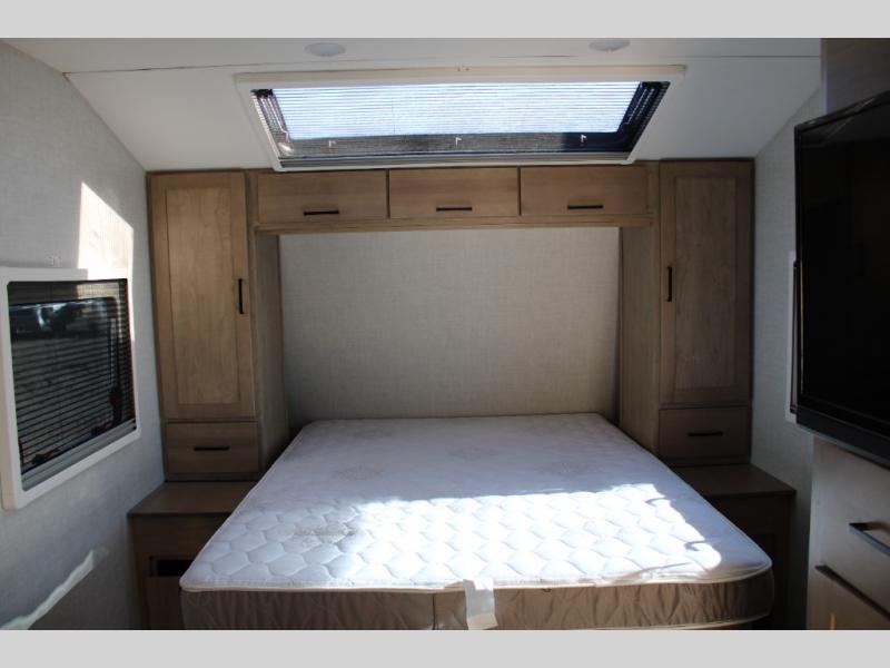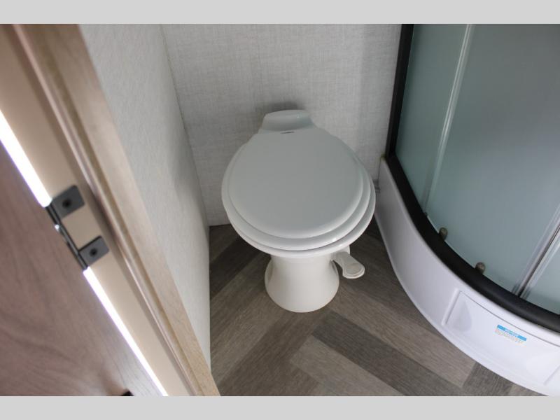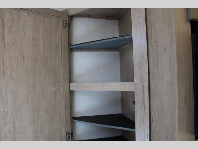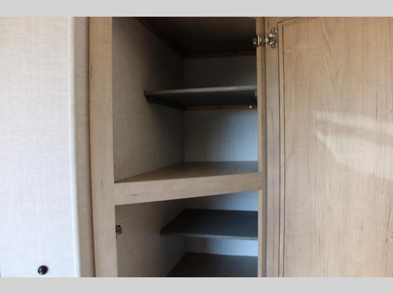 Head to your favorite campgrounds in this travel trailer! It features a front queen bed to lay your head on at night with nightstands and wardrobes on either side, plus an additional wardrobe and another hidden wardrobe behind the 12V HDTV/AV system on hinge. Prepare your best home cooked meals with the two burner cooktop and enjoy them at the jackknife sofa slide with a removable table. Behind the sofa are dual storage cubbies to keep your items out of the way too. With two pantries, you can bring all of your favorite snacks. You also have a rear corner bathroom with a 32" radius shower to rinse the sand out of your hair after a fun day at the beach!