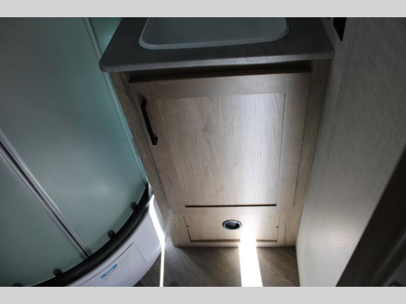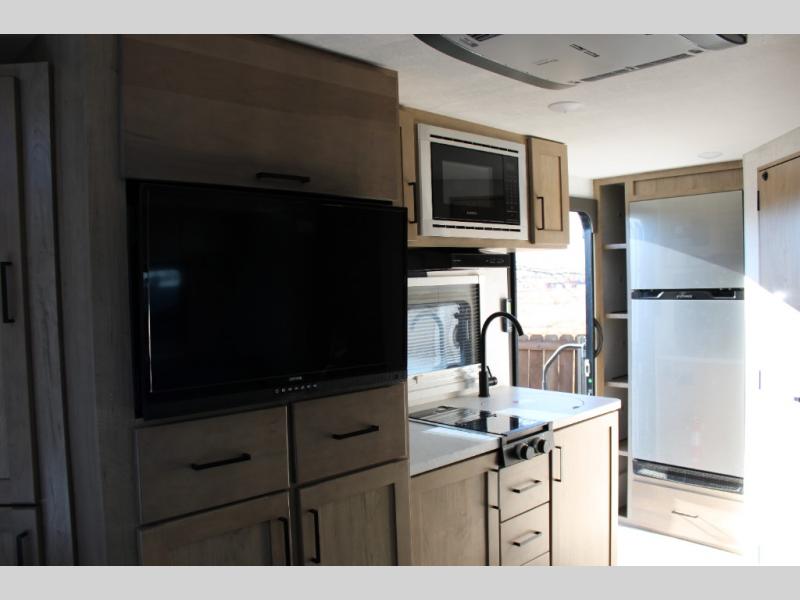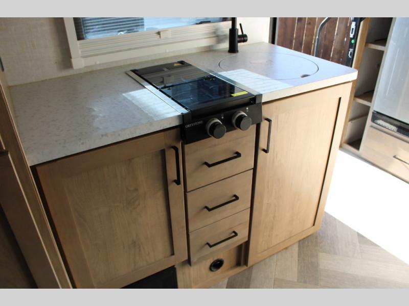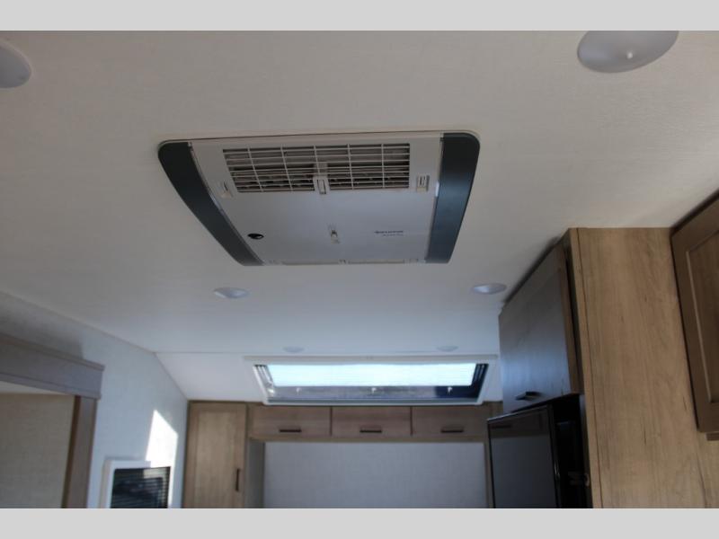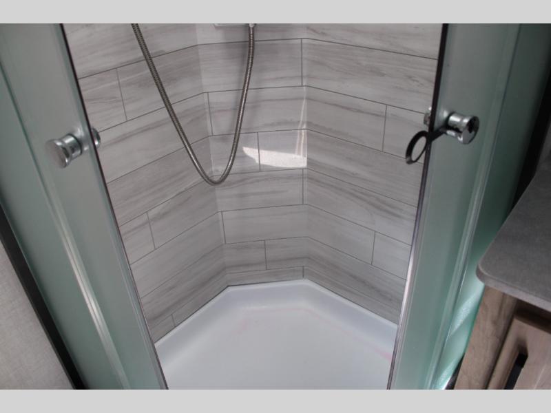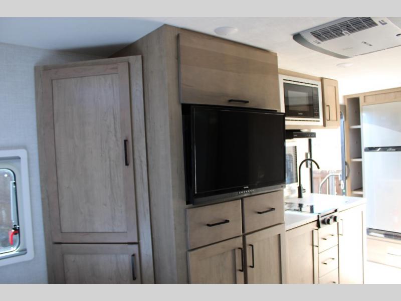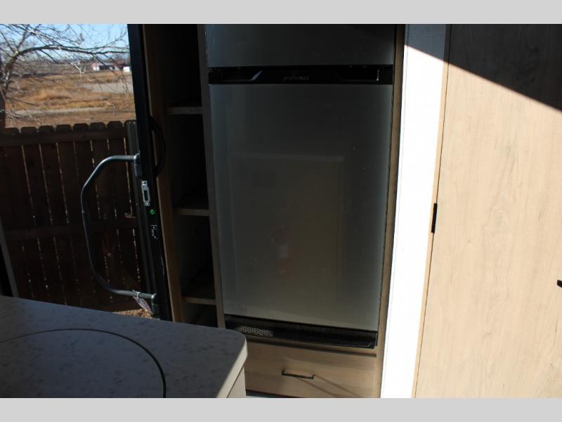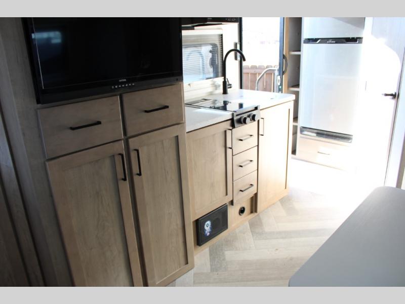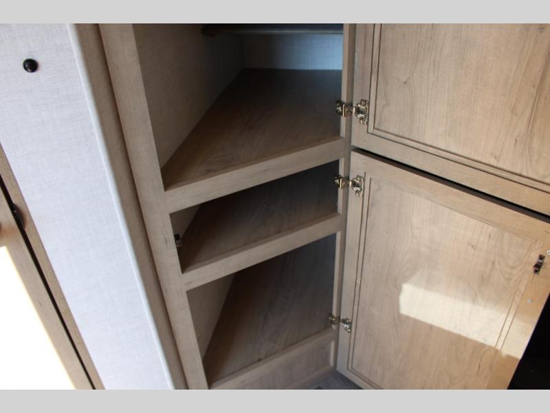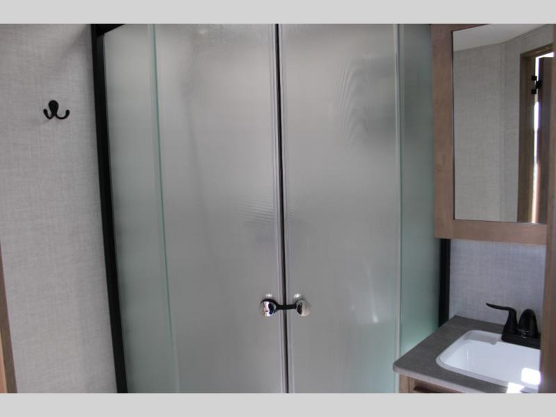 Head to your favorite campgrounds in this travel trailer! It features a front queen bed to lay your head on at night with nightstands and wardrobes on either side, plus an additional wardrobe and another hidden wardrobe behind the 12V HDTV/AV system on hinge. Prepare your best home cooked meals with the two burner cooktop and enjoy them at the jackknife sofa slide with a removable table. Behind the sofa are dual storage cubbies to keep your items out of the way too. With two pantries, you can bring all of your favorite snacks. You also have a rear corner bathroom with a 32" radius shower to rinse the sand out of your hair after a fun day at the beach!