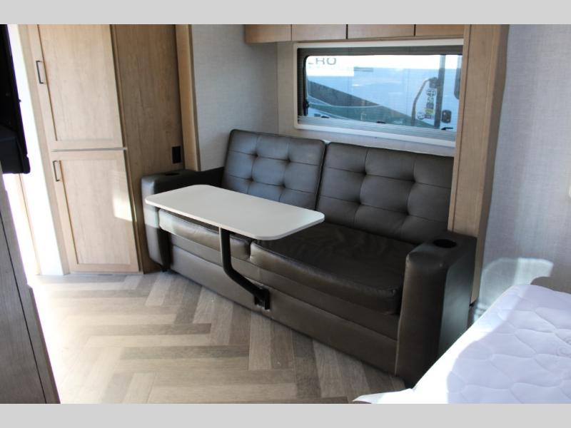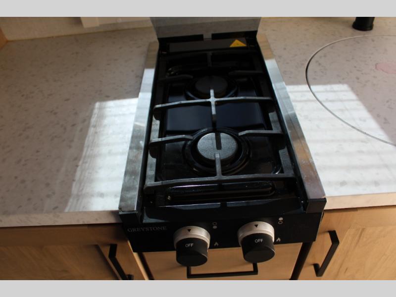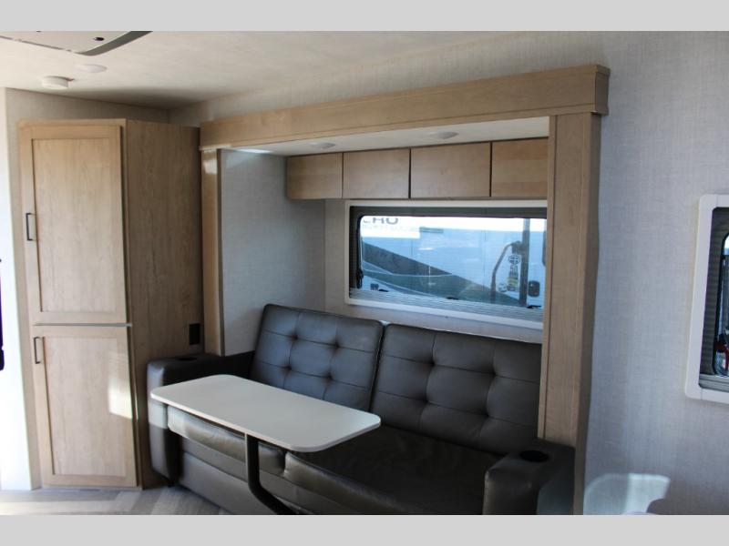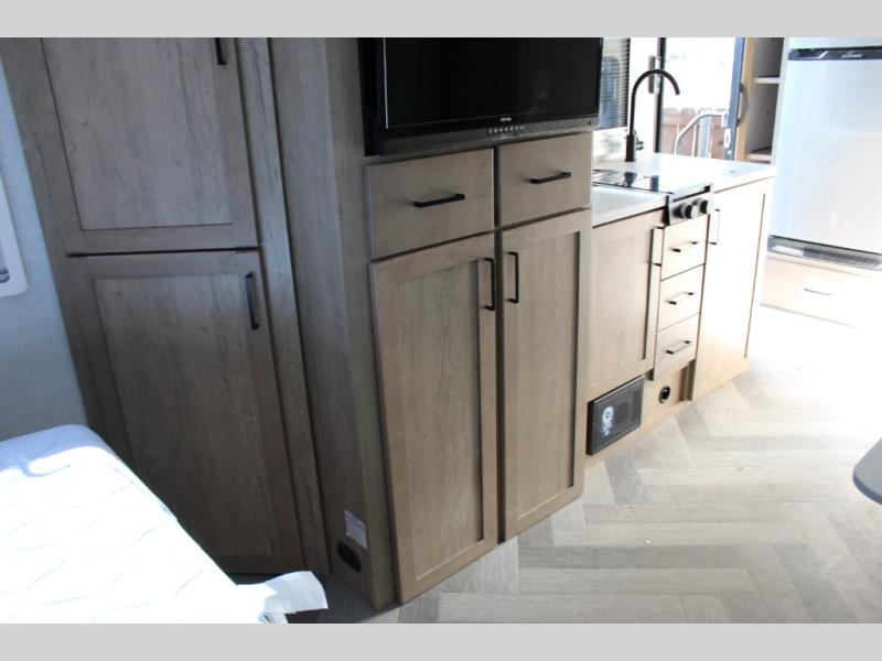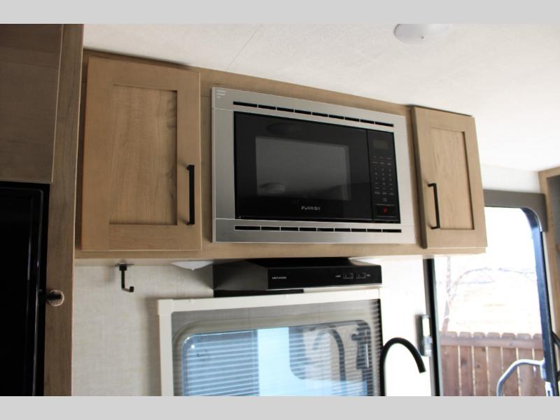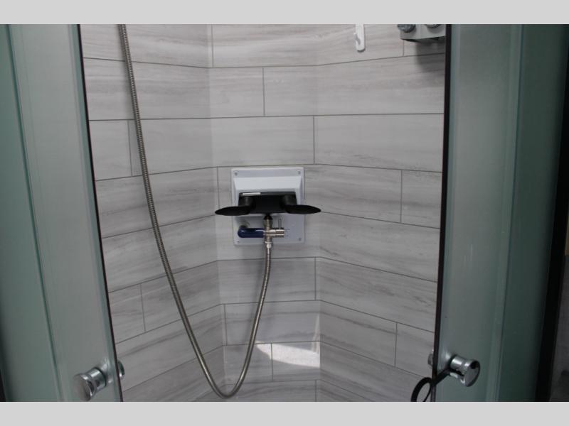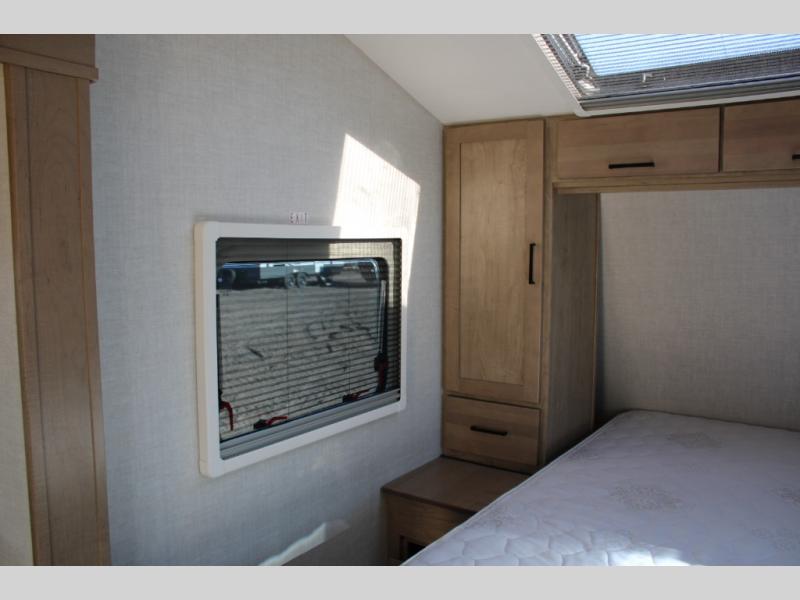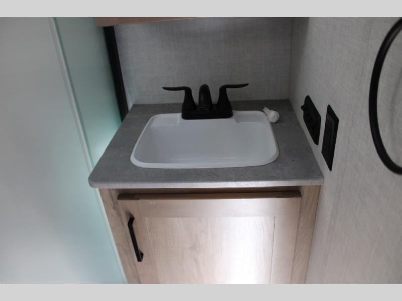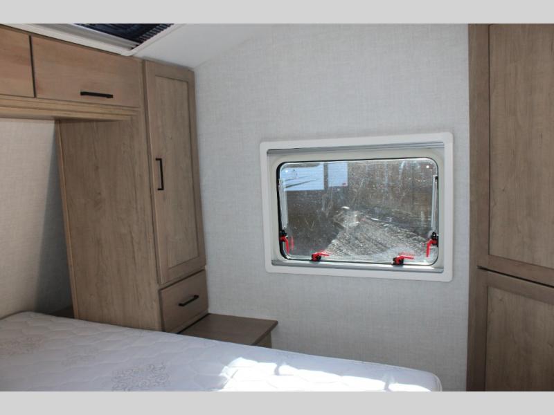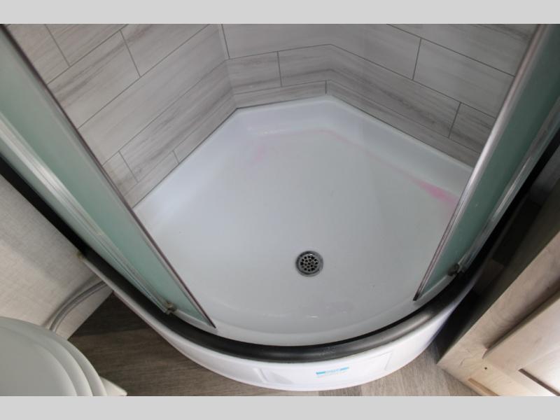 Head to your favorite campgrounds in this travel trailer! It features a front queen bed to lay your head on at night with nightstands and wardrobes on either side, plus an additional wardrobe and another hidden wardrobe behind the 12V HDTV/AV system on hinge. Prepare your best home cooked meals with the two burner cooktop and enjoy them at the jackknife sofa slide with a removable table. Behind the sofa are dual storage cubbies to keep your items out of the way too. With two pantries, you can bring all of your favorite snacks. You also have a rear corner bathroom with a 32" radius shower to rinse the sand out of your hair after a fun day at the beach!