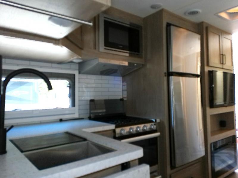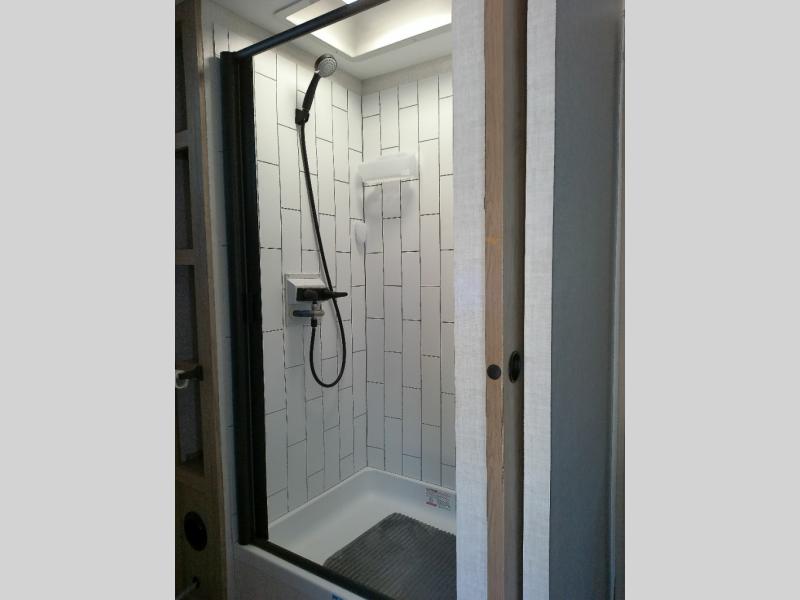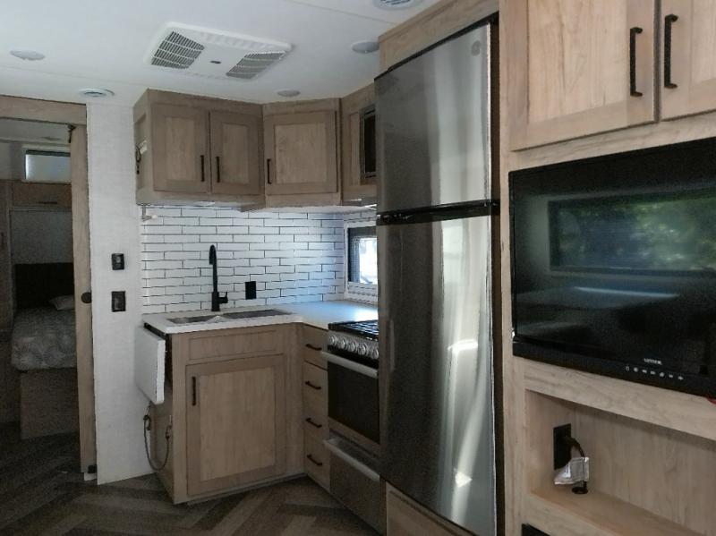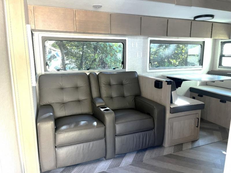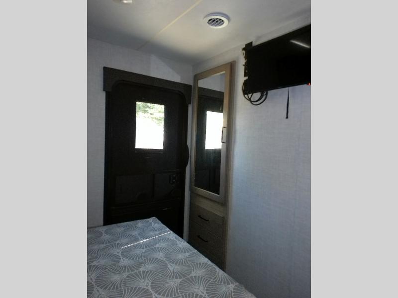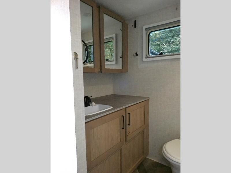 You won't want to camp any other way once you step inside this travel trailer! The front private bedroom will have you feeling right at home with the queen bed that has nightstands on either side and a "Stargazer" skylight above it, plus there is one of the dual entry doors to the unit so you can easily slip out for an early morning walk. After you get back, you can grab some eggs from the 12V refrigerator and fry them up on the three burner cooktop then eat them at the legless dinette or you can switch it out for an optional free standing table and chairs. The theater seating is directly across from the 12V LED HDTV and can also be switched out for an optional hide-a-bed sofa. Clean up in the full bathroom with the 30" x 36" shower after a fun filled day outdoors!