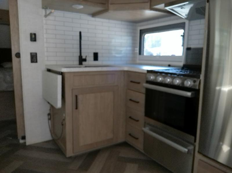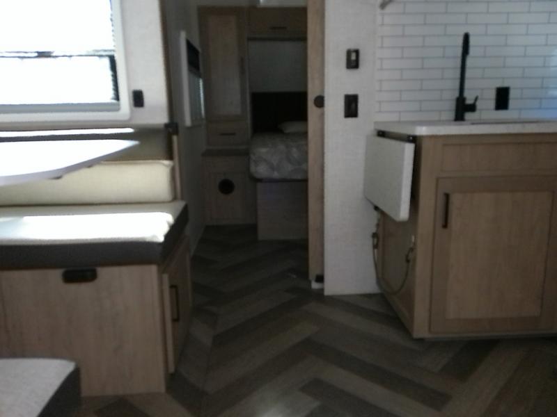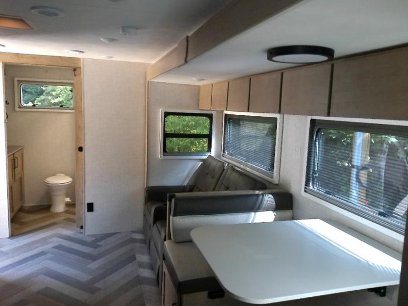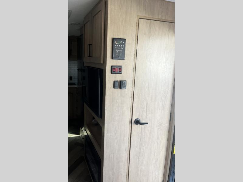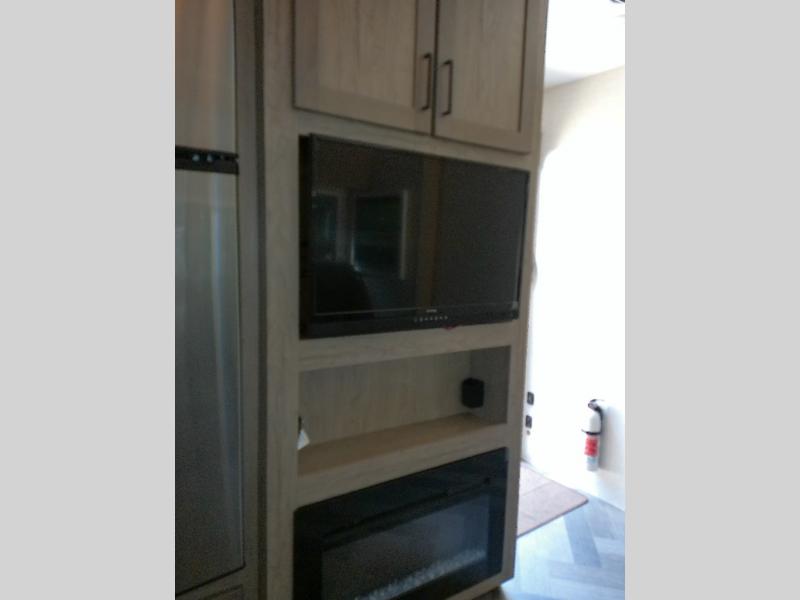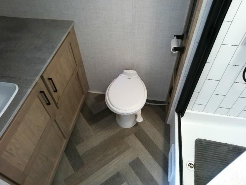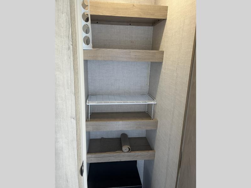 You won't want to camp any other way once you step inside this travel trailer! The front private bedroom will have you feeling right at home with the queen bed that has nightstands on either side and a "Stargazer" skylight above it, plus there is one of the dual entry doors to the unit so you can easily slip out for an early morning walk. After you get back, you can grab some eggs from the 12V refrigerator and fry them up on the three burner cooktop then eat them at the legless dinette or you can switch it out for an optional free standing table and chairs. The theater seating is directly across from the 12V LED HDTV and can also be switched out for an optional hide-a-bed sofa. Clean up in the full bathroom with the 30" x 36" shower after a fun filled day outdoors!