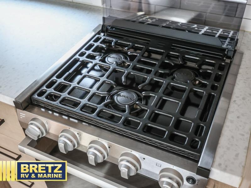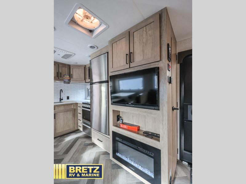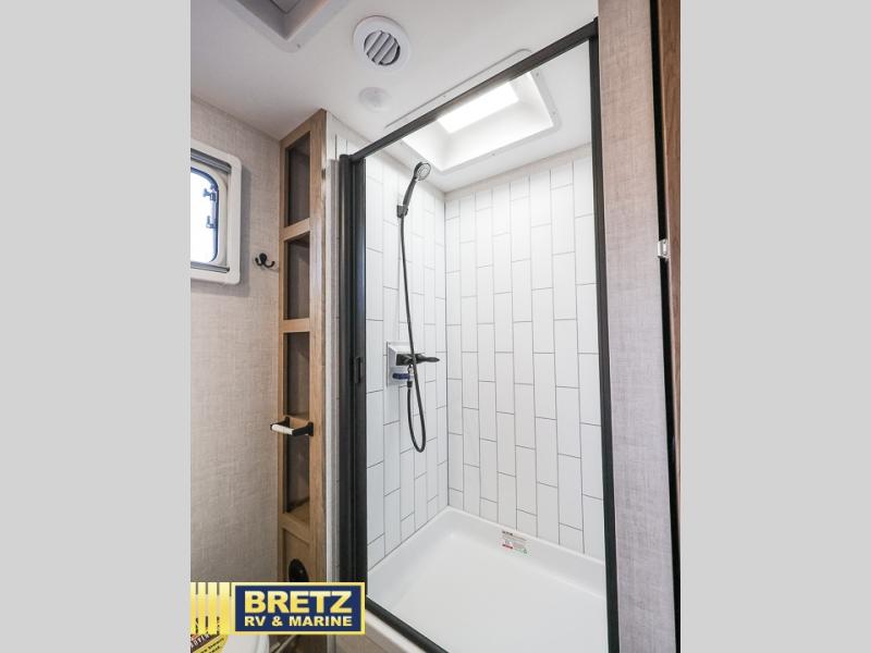 You won't want to camp any other way once you step inside this travel trailer! The front private bedroom will have you feeling right at home with the queen bed that has nightstands on either side and a "Stargazer" skylight above it, plus there is one of the dual entry doors to the unit so you can easily slip out for an early morning walk. After you get back, you can grab some eggs from the 12V refrigerator and fry them up on the three burner cooktop then eat them at the legless dinette or you can switch it out for an optional free standing table and chairs. The theater seating is directly across from the 12V LED HDTV and can also be switched out for an optional hide-a-bed sofa. Clean up in the full bathroom with the 30" x 36" shower after a fun filled day outdoors!