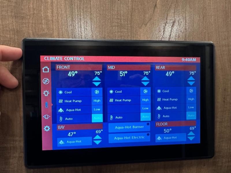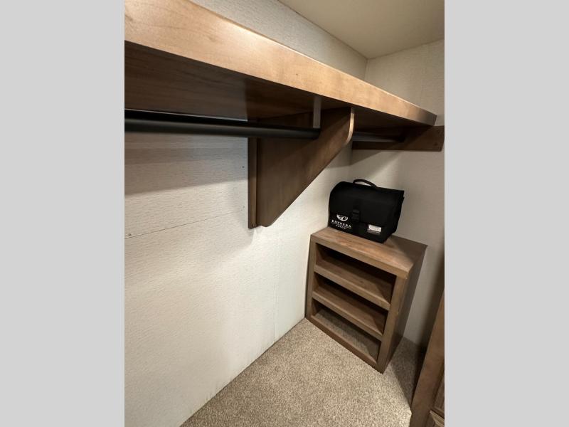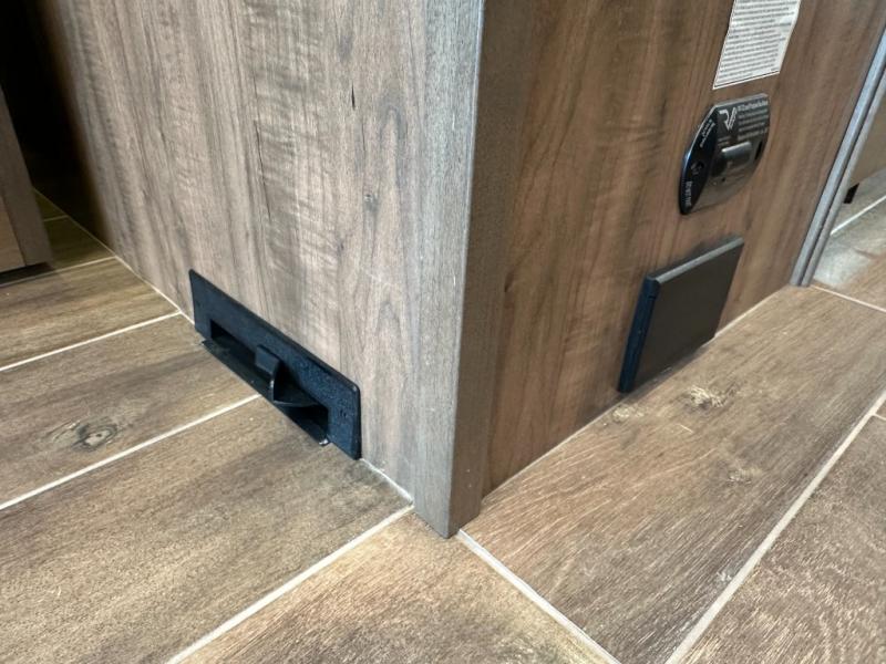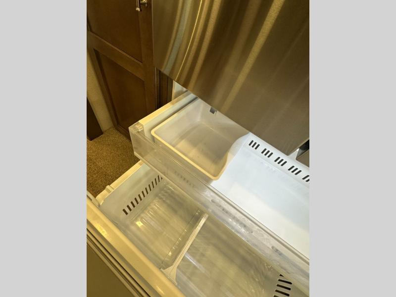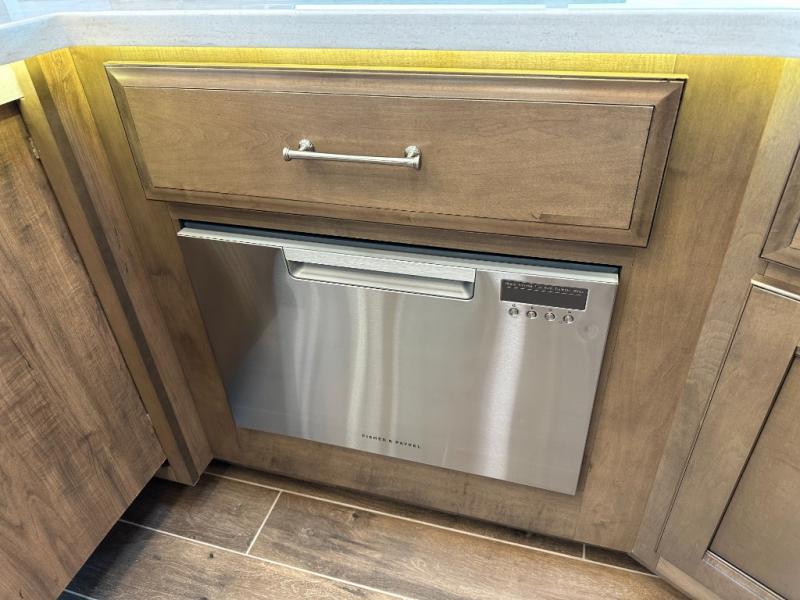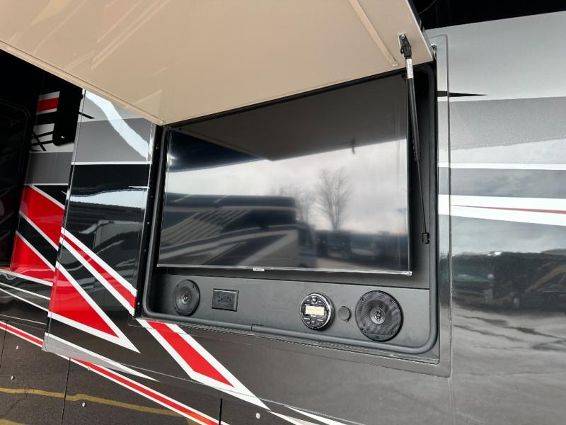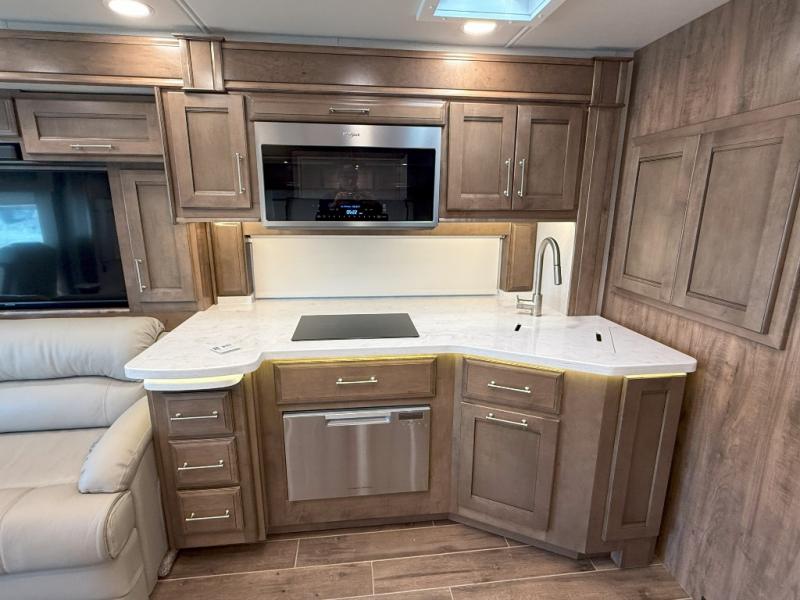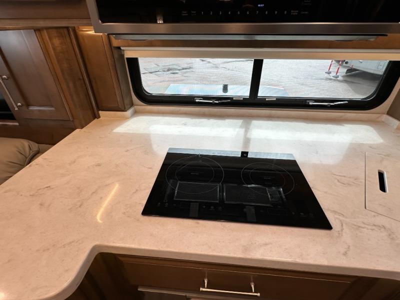 If you're looking for more space for your things, you're going to love this coach with a large walk-in closet in the rear bathroom! There are two storage cabinets in the closet, plus a separate washer and dryer for convenience. The master bedroom includes a king bed slide out for comfort, and any guests you have can sleep on the hide-a-bed sofa in the main living area. You'll also find power theater seating here across from the 50" TV on lift, plus a free-standing dinette table. This Aspire kitchen includes everything you need to make home cooked meals each day, including a two burner induction cooktop, a convection microwave, plus a stainless steel residential refrigerator for perishables. After your meal is cleaned up, you may want to head outdoors to relax under the power awnings and enjoy the outside entertainment center with a 43" TV!