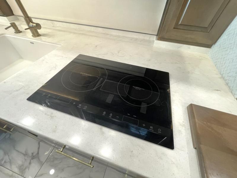 Residential kitchen with induction cooktop, convection microwave, hutch, and pantry