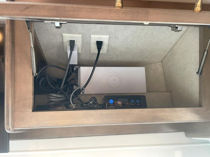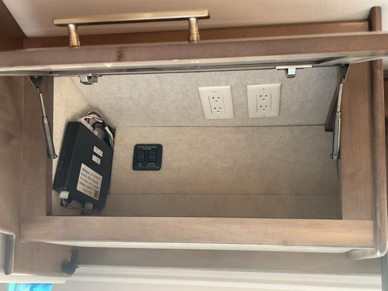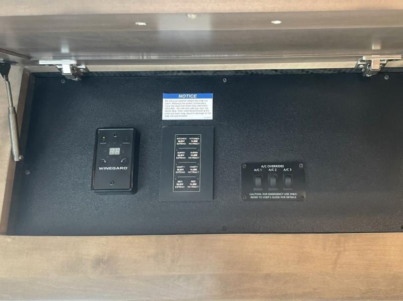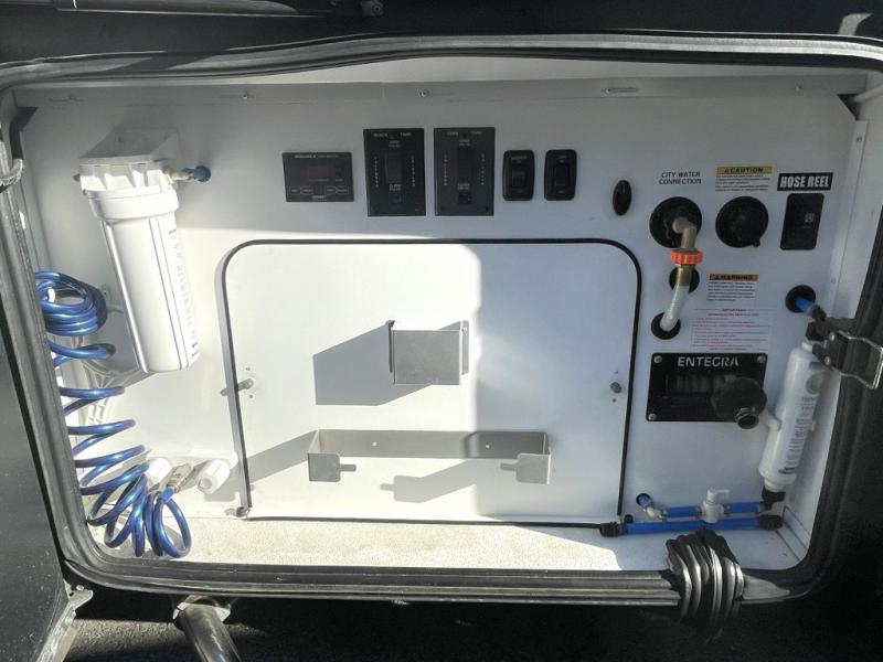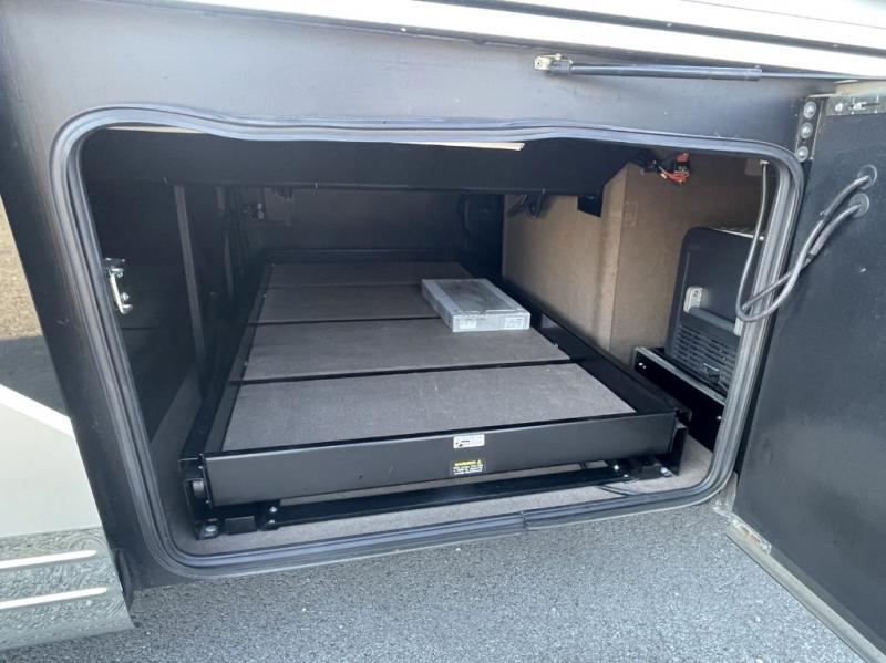 Heated exterior utility center and two power slide-out storage trays