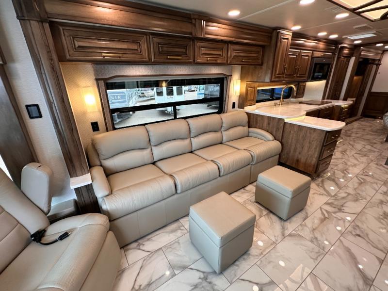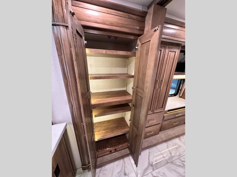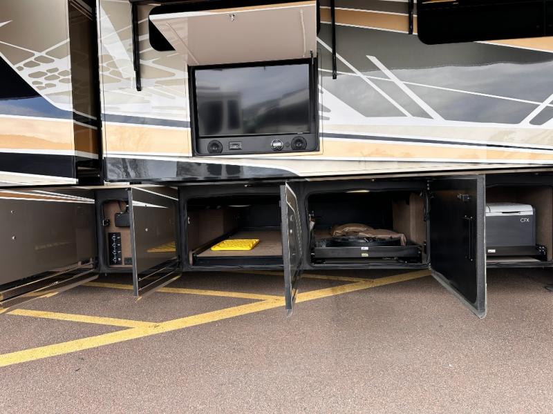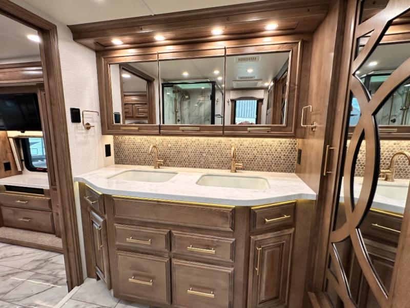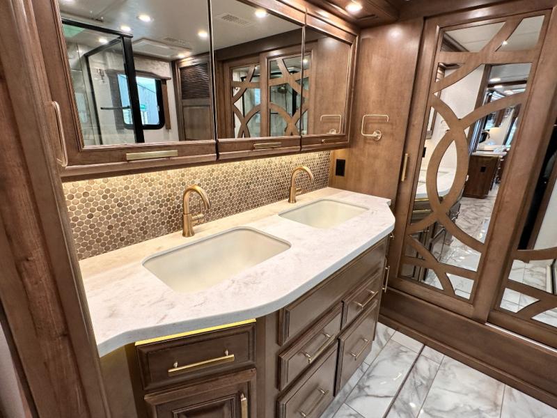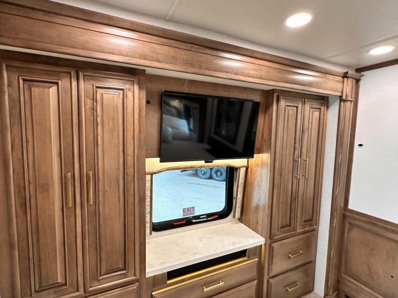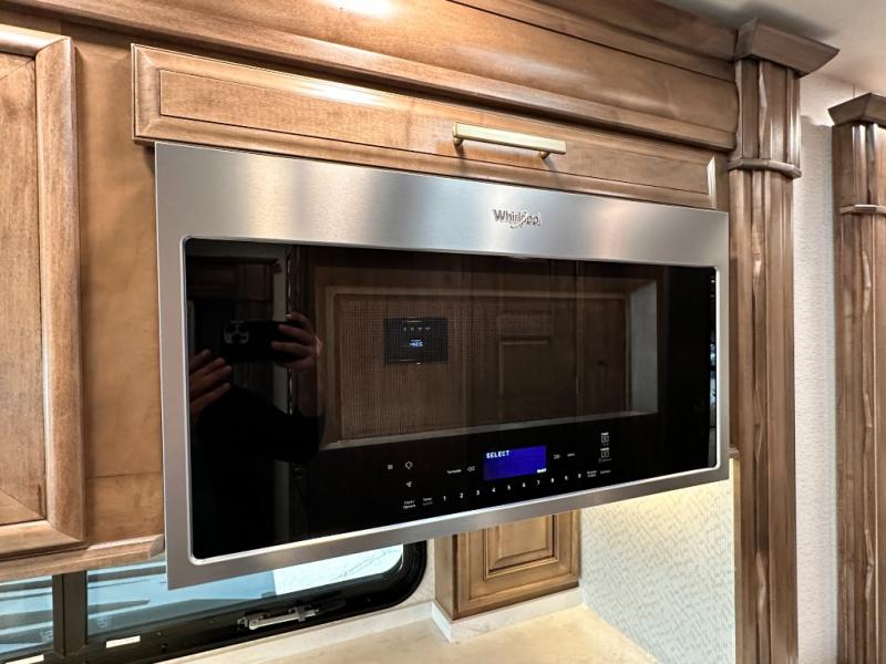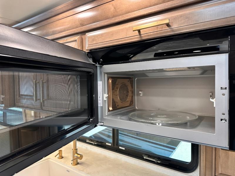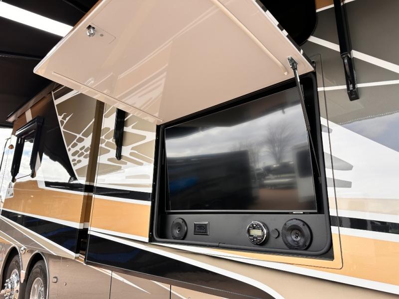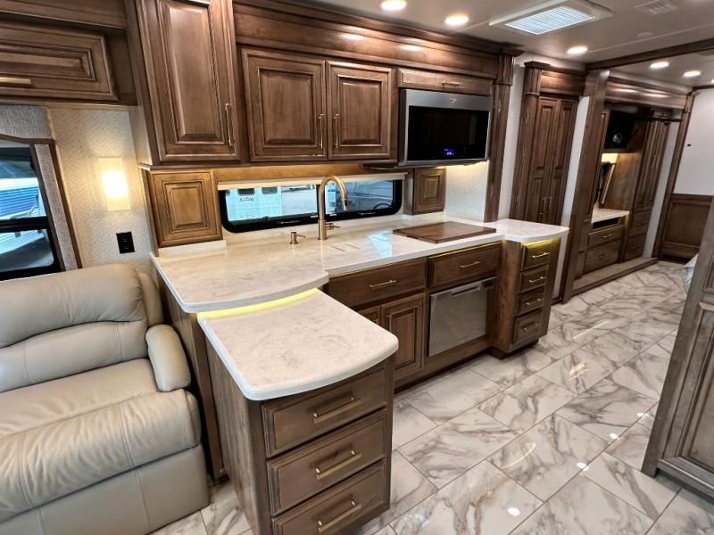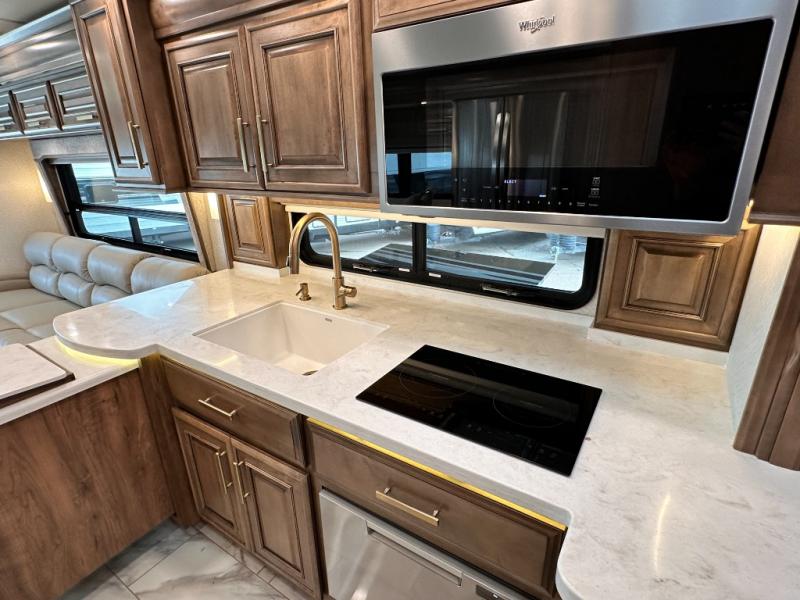 This luxury coach is perfect for trips across the states or for staying close to home. Your crew can relax on the 100" 3-seat power reclining sofa, or dine together at the free-standing dinette. You will stay entertained throughout your trip with four TV's; a 32" overhead, a 50" in the living area, a 32" in the bedroom, and a 43" exterior TV! This Cornerstone kitchen will be one of your favorite features with an induction cooktop, a convection microwave, a residential refrigerator, plus a hutch for extra storage space. Having a bath and a half onboard is sure to come in handy when traveling with more friends or family, plus the full rear bath includes dual bath sinks for even more convenience. And don't worry about storage because this coach has you covered. There is a kitchen pantry, dual bedroom wardrobes, plenty of overhead cabinets, plus a large bathroom wardrobe, complete with a separate washer and dryer!