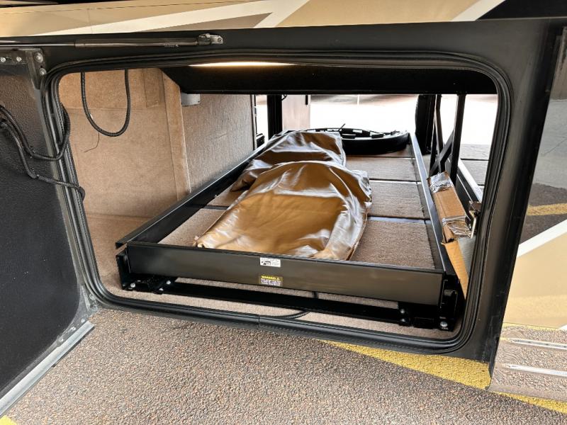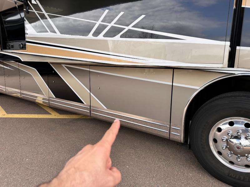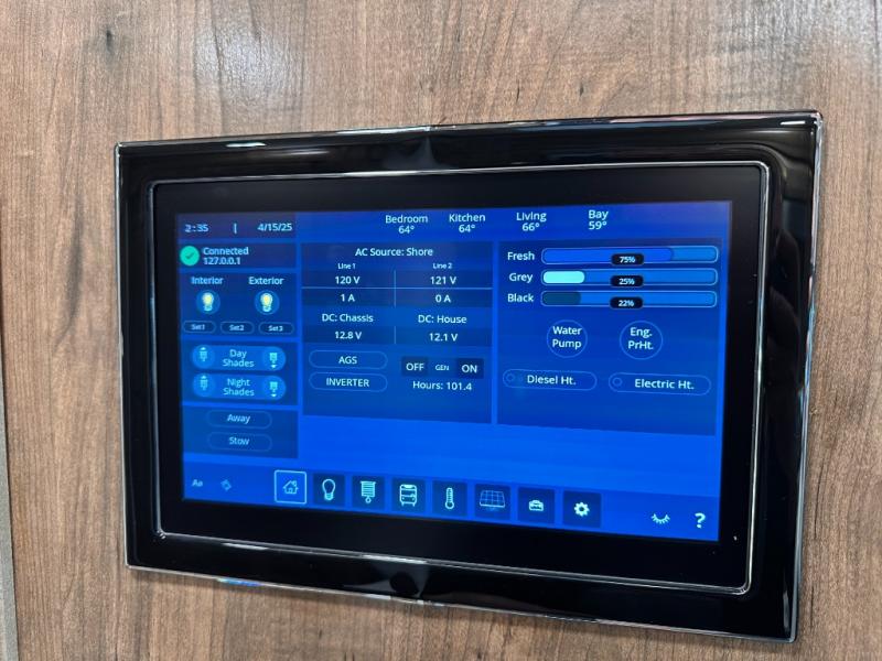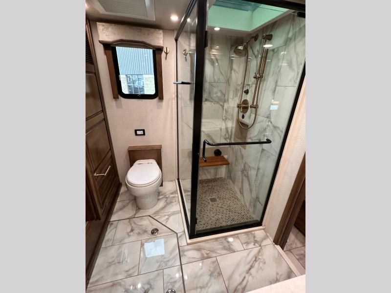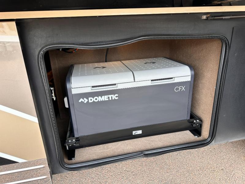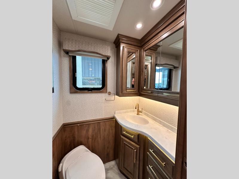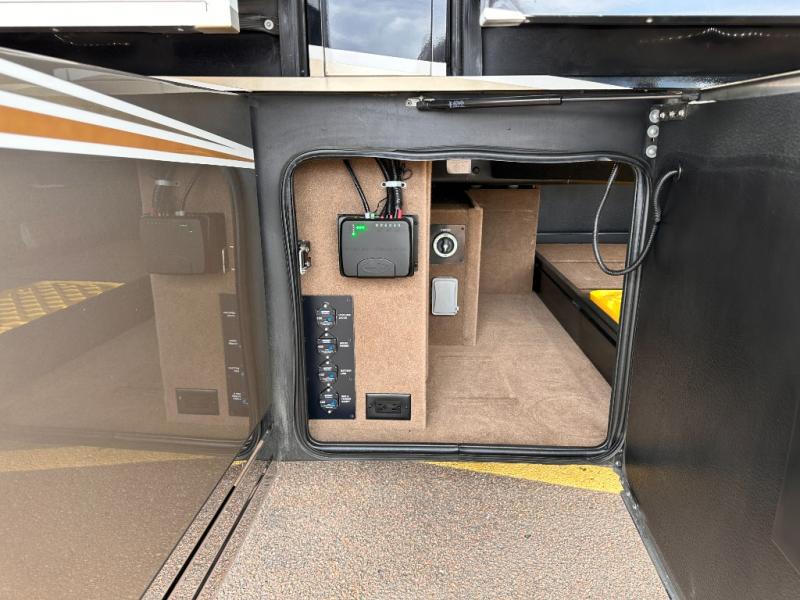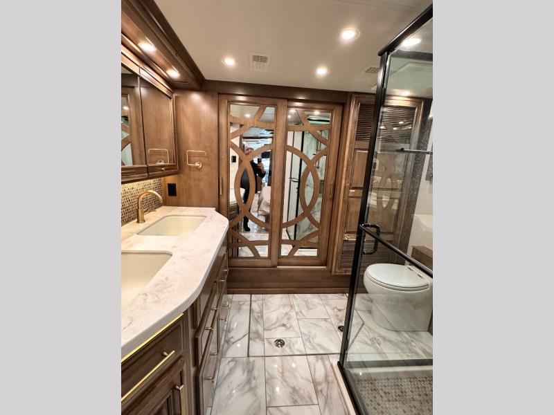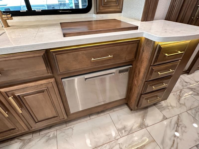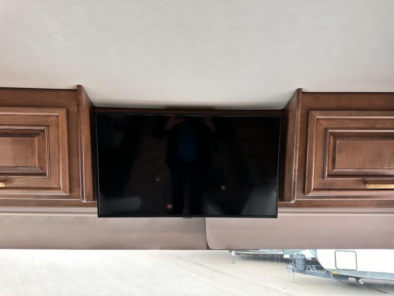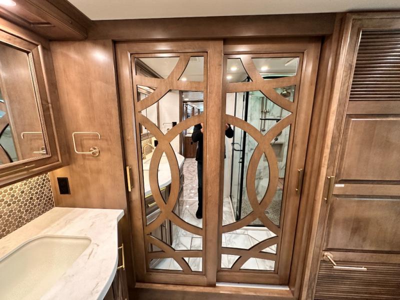 This luxury coach is perfect for trips across the states or for staying close to home. Your crew can relax on the 100" 3-seat power reclining sofa, or dine together at the free-standing dinette. You will stay entertained throughout your trip with four TV's; a 32" overhead, a 50" in the living area, a 32" in the bedroom, and a 43" exterior TV! This Cornerstone kitchen will be one of your favorite features with an induction cooktop, a convection microwave, a residential refrigerator, plus a hutch for extra storage space. Having a bath and a half onboard is sure to come in handy when traveling with more friends or family, plus the full rear bath includes dual bath sinks for even more convenience. And don't worry about storage because this coach has you covered. There is a kitchen pantry, dual bedroom wardrobes, plenty of overhead cabinets, plus a large bathroom wardrobe, complete with a separate washer and dryer!