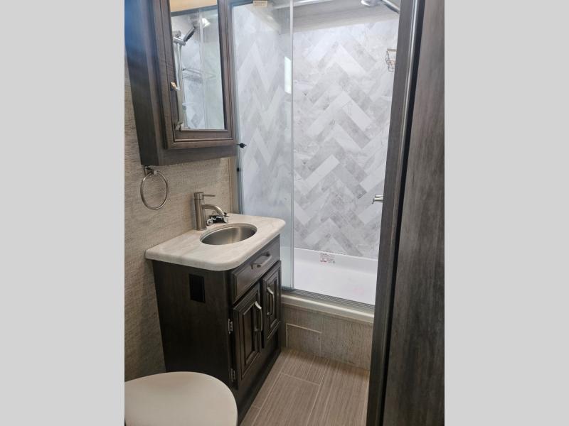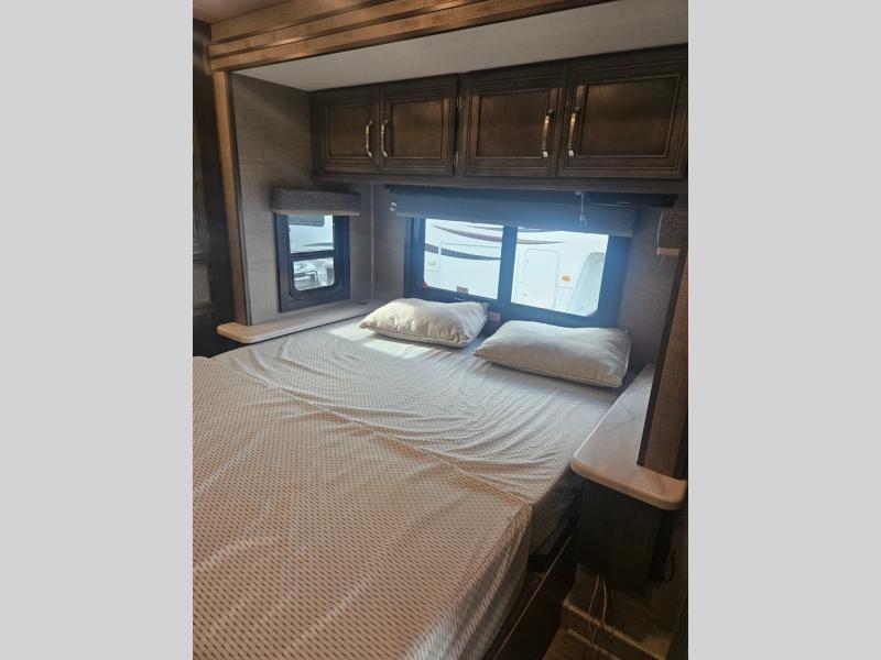 You can bring a few guests to join in on the fun with this motorhome! The bunk over cab and 66" x 76" king bed offer comfortable places to sleep, plus you can transform the booth dinette and the sofa into extra sleeping spaces if needed. Everyone can freshen up each morning with the 30" x 36" shower in the rear corner bathroom, and keep their bellies full with a three burner cooktop and residential microwave. There is even a countertop extension to make meal prepping easier. Take the fun outside and watch movies on the exterior LED HD Smart TV while staying protected by the 18' electric awning with LED lights!