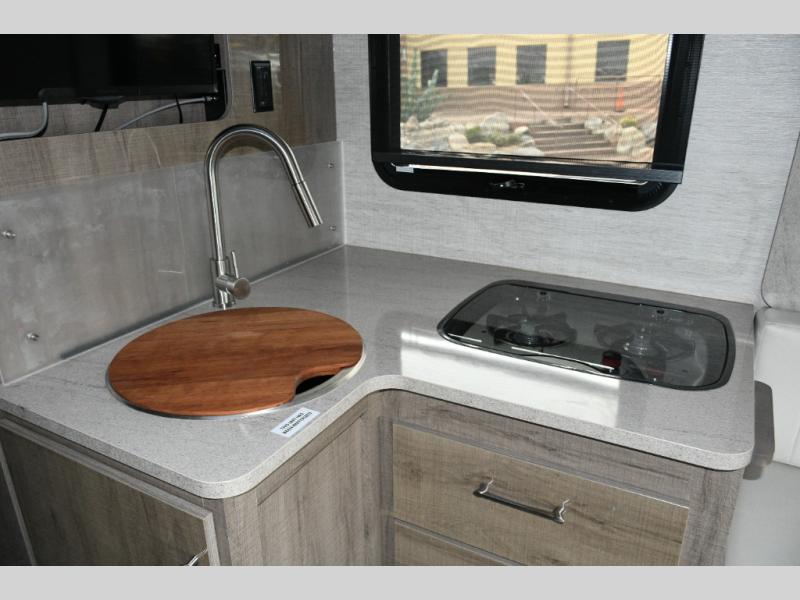 Kitchen with two-burner cooktop, stainless steel sink with cover/cutting board, and convection microwave