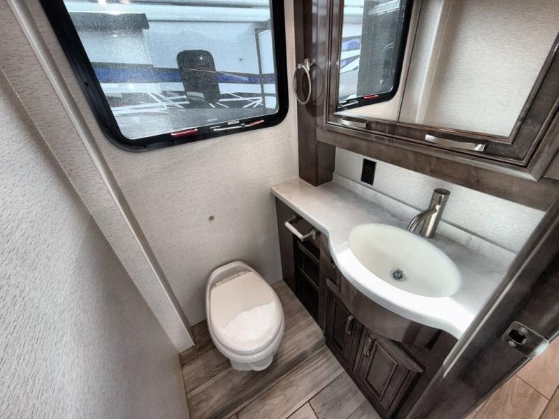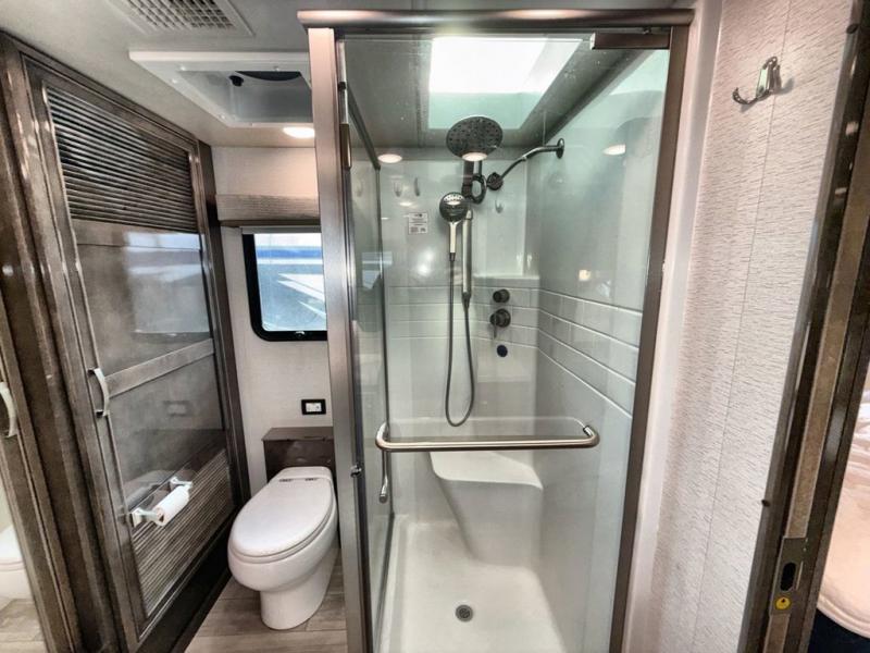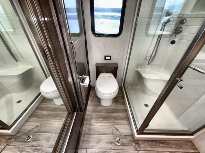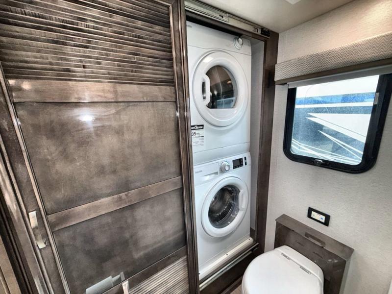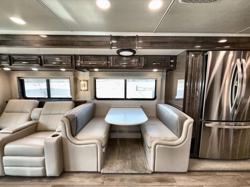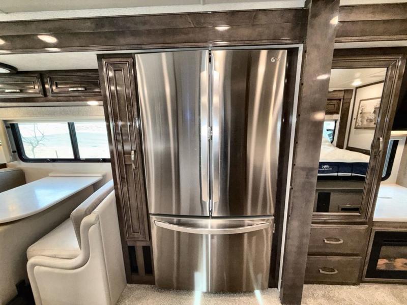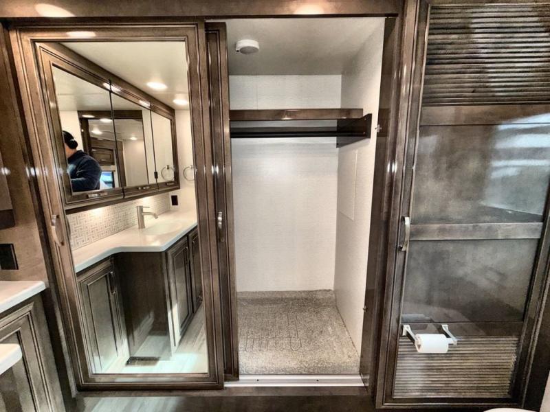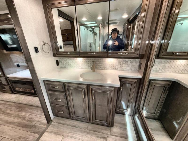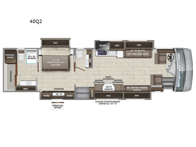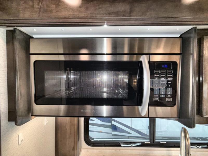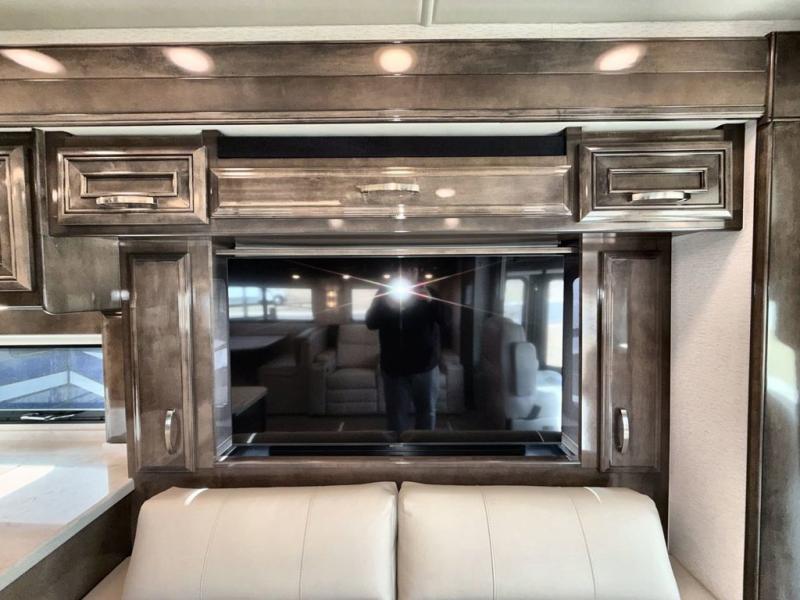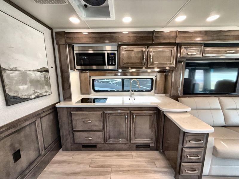 Are you ready for relaxing vacations with up-scale appointments? Look no further than this coach with a bath and a half, triple slides, and power theater seating for your comfort. The booth dinette includes seating expansions and a table expansion to sit more people, plus there is a hide-a-bed sofa for even more seating and sleeping space. A stainless steel residential refrigerator comes standard in the kitchen, as well as a convection microwave, a two burner induction cooktop, and a pantry for dry goods. You will find your own power head lift king bed slide in the master bedroom, and you can choose the optional bedroom fireplace to make this space more cozy. Having a separate washer and dryer on board will make traveling easier than ever, and you'll never go bored with four TV's included in this unit.
