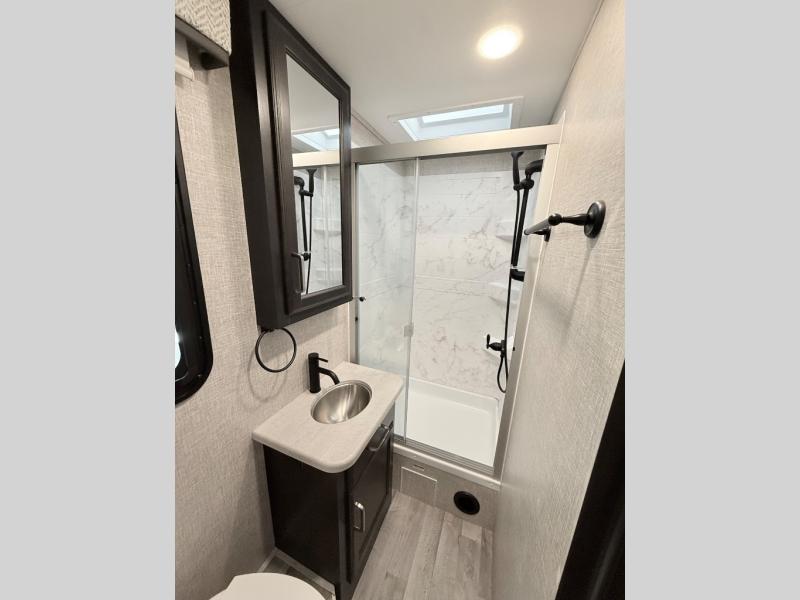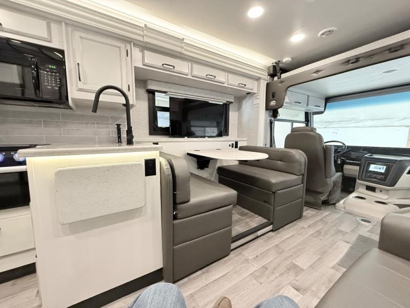You'll love spending time with your favorite people in this Vision Class A gas motorhome! You can roam freely while inside thanks to the two slides, and the main living area has a booth dinette and 68" jack-knife sofa for relaxing. You can also turn these pieces of furniture into beds at night, and if you add the optional drop-down bunk above the cab, you'll have even more sleeping space. In between the two cab seats you'll find a removable cockpit table so that you can keep some snacks next to you as you travel. The rear private bedroom features an RV king bed within one of the slides so that you can get to the wardrobe, and a full bathroom is right there next to the bedroom for easy access to enjoy a refreshing shower.