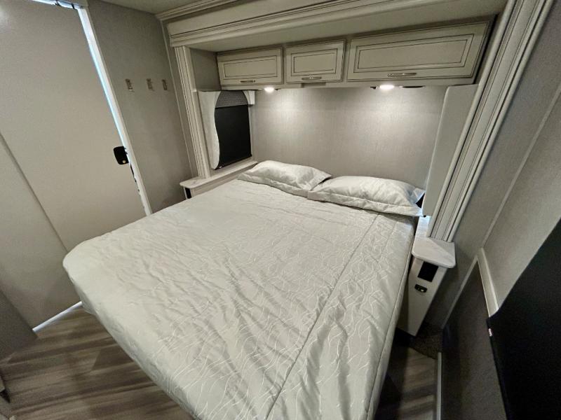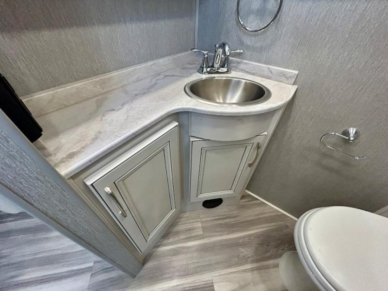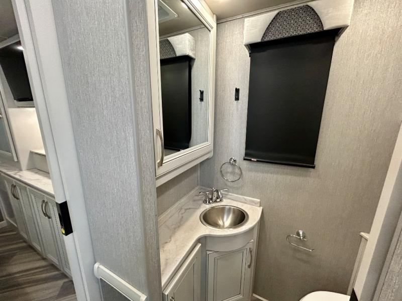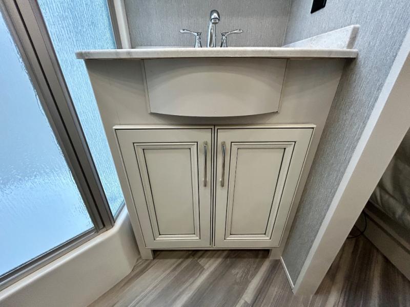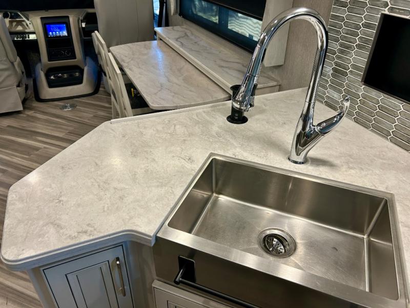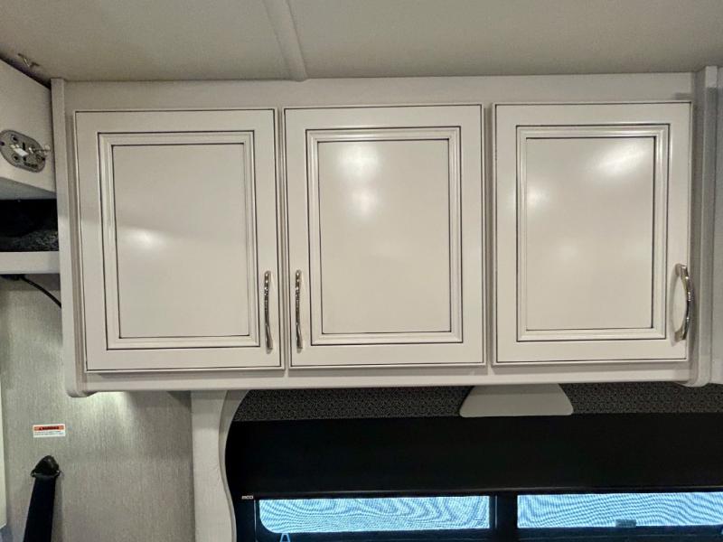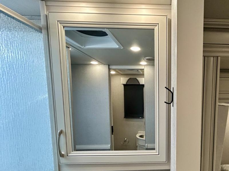 Looking for a spacious RV with a mid-coach entry, four distinct areas, and offers a way to work while on the road plus be able to host a dinner party for friends and family? This Bounder gives you all that and so much more like a stainless steel farmhouse sink, a solid surface top in the galley, and full extension drawer guides with latches, plus full amenities to make any meals including a convection microwave and residential refrigerator. The split bathroom is super convenient when trying to get ready in the mornings. One person can be washing their hands in the private sink and toilet room while another person can be using the second sink beside the neo-angled shower. Yet you can also close two sliding doors to make this one big bathroom for yourself. And the multi-purpose Adapt-table dinette allows you to work or eat breakfast for two, and you can easily swing the table out vertically to host four. The rear bedroom offers a slide out king bed, plus plenty of storage and an LED TV to watch before falling asleep. If you like to host overnight guests, the jack knife sofa is available.