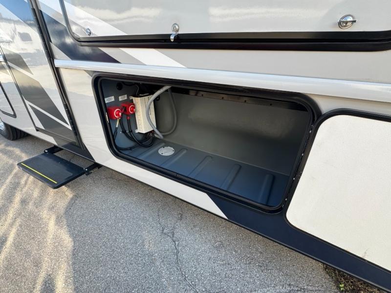 Step up your camping game by adding the Fleetwood Flair Class A gas motorhome to the line-up! The 7.3L 350HP engine with 468 LB/FT of torque forms the base, and the 8,000-LB towing capacity gives you the chance to bring a car with your coach. On the exterior you'll find an automotive, bonded one-piece windshield, exterior-mounted sideview cameras, and an exterior LED TV. The interior is decked out with a Sony dash radio, an all-new electronic instrument panel, a digital dash, and reclining/swivel cab chairs. There is also a workstation at the automotive-style dash, and the Bluetooth coach system in the bedroom has exterior speakers for fun party nights.