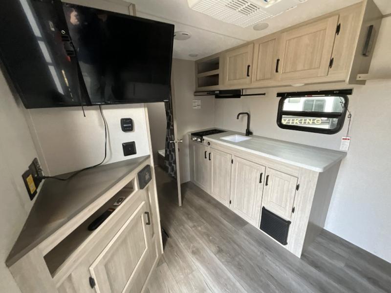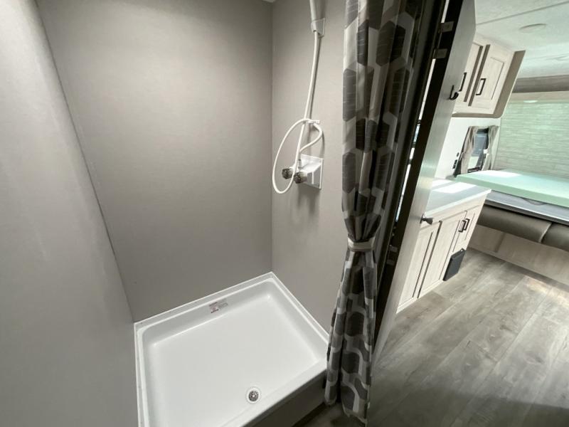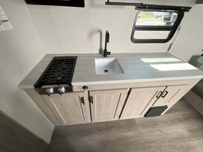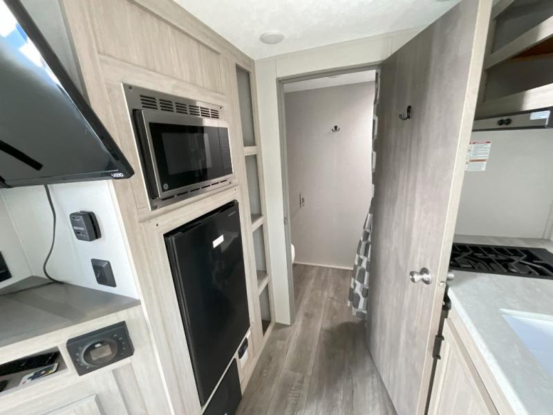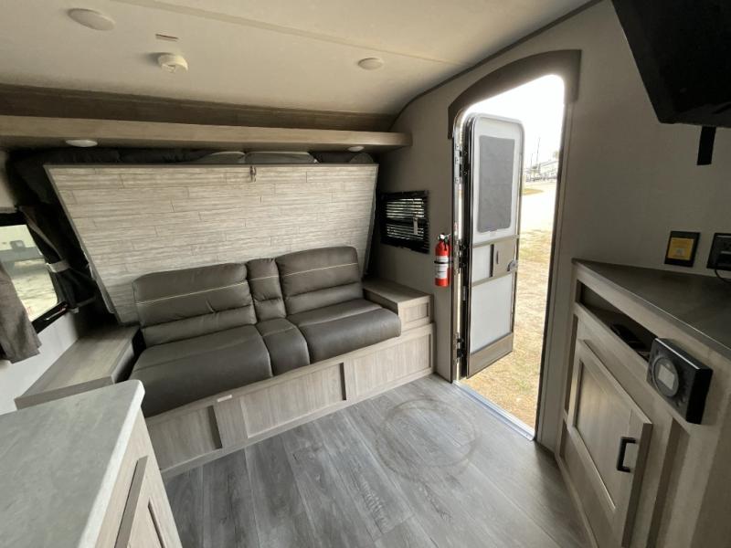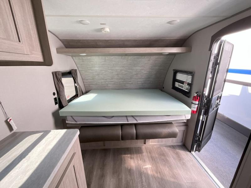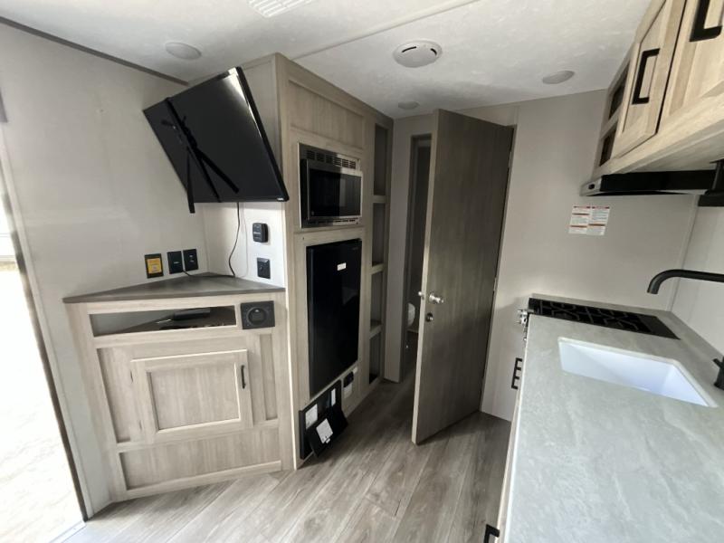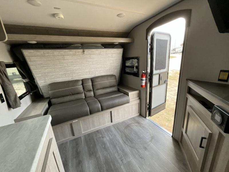 This value price point Aurora Light allows you versatility as you camp! You can sleep comfortably each night on the Murphy bed up front, then fold it away in the morning to relax on the sofa. There are dual nightstands for your things, plus overhead storage. This Aurora kitchen includes a 12V 10 cu. ft. refrigerator, a two burner cooktop, plus a microwave oven to easily make meals each day, and the full rear bath will come in handy after a day at the lake. After dinner, relax on the sofa, or head outdoors to relax under the 10' awning!