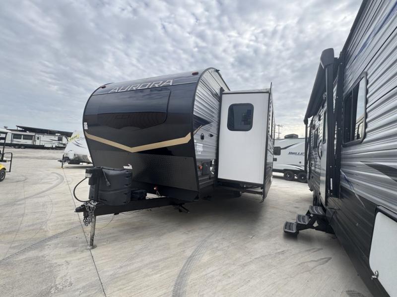 Comfortability, usability, and quality is what you will find in each one of these Forest River Aurora travel trailers or toy haulers! They are designed with a superior build and packed full with industry leading, functional, and distinctive standard features. SolidStep entrance steps and an XL swing arm grab handle help you to safely enter and exit the unit. The diamond plate rock guard will protect your unit from road debris and the nitrogen filled radial tires, which keep their pressure longer, offer better fuel economy. You will also find upgraded JBL Elite exterior speakers outside, a Carefree awning with multicolor lights and remote, plus flush mount baggage doors for easy packing. The interiors are beautifully designed with a deep undermount farm style sink, stainless steel appliances, and linoleum flooring throughout which will be easy to clean. Come find your favorite model today!
