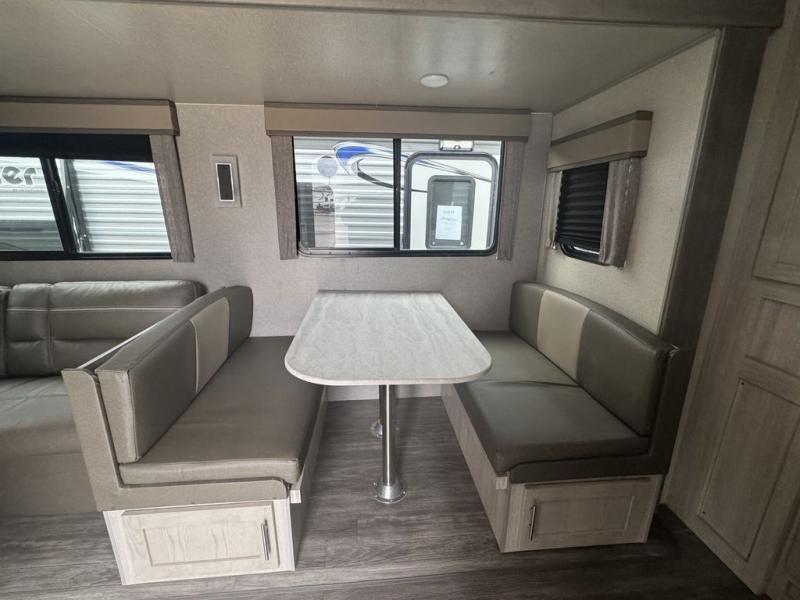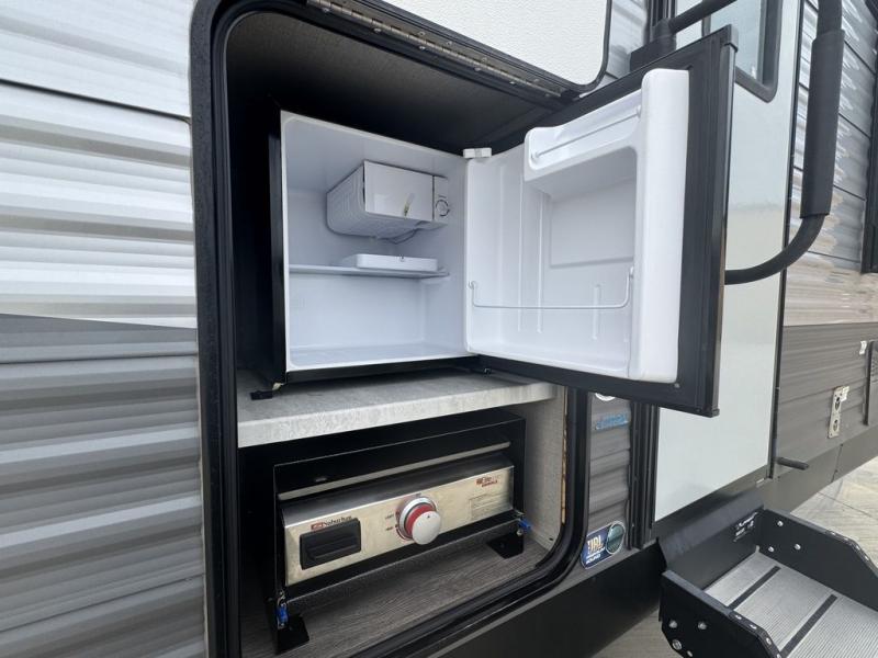 You're going to love every minute spent in this travel trailer with double slide outs and double entry doors. The front kitchen includes ample counter space to prep and cook meals, plus there are two pantries for storage space. Your crew can get comfortable on the 70" sofa or play a game at the booth dinette. There is also an entertainment center with a 39" flat screen LED TV for movie night, or you might head outdoors to relax under the 18' awning. The exterior camper kitchen here includes a griddle and a mini refrigerator the chef of your group is sure to love. When it's time to call it a night, head to the rear master bedroom that includes a queen bed slide out, a large wardrobe, plus your own entrance into the dual entry bath!