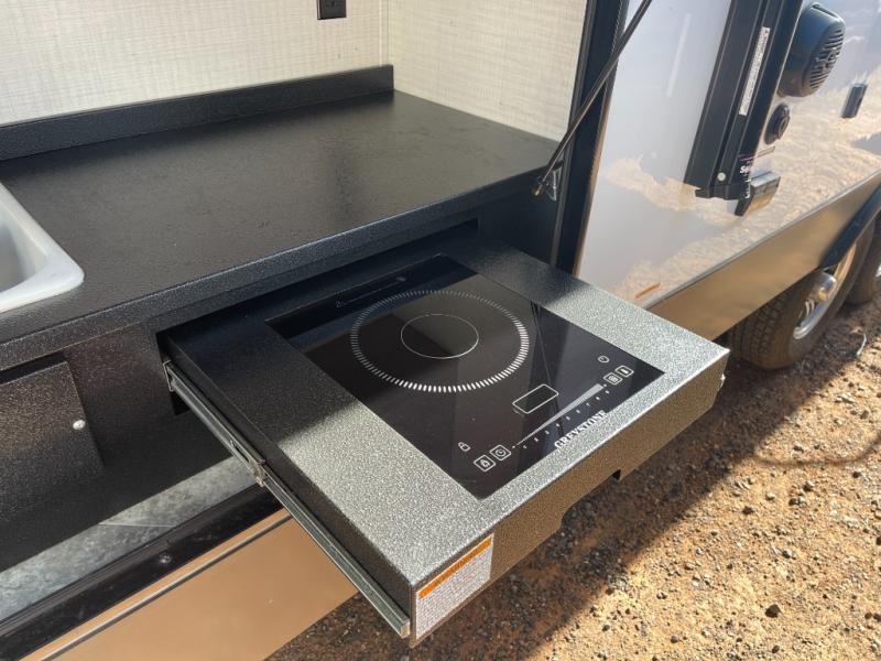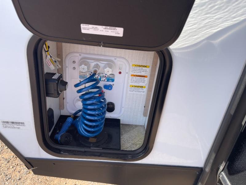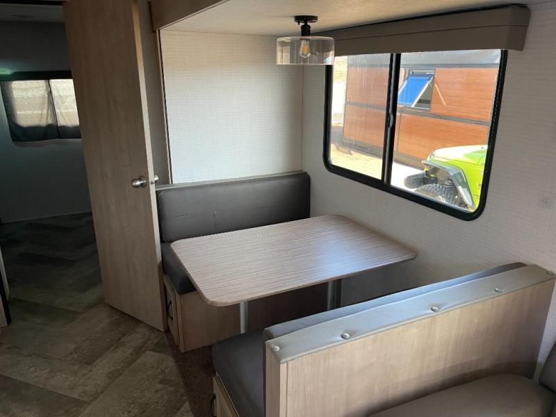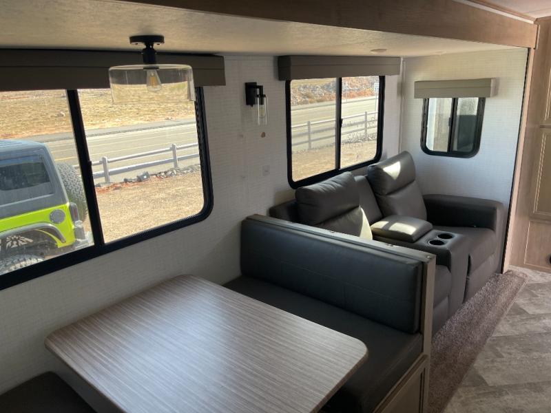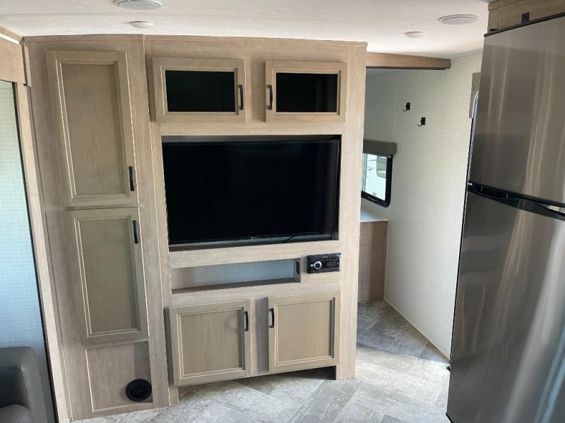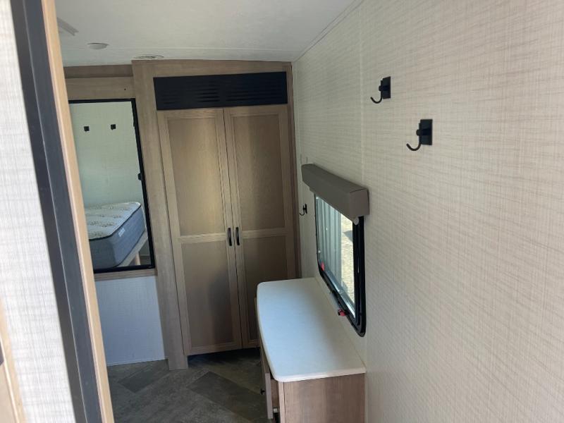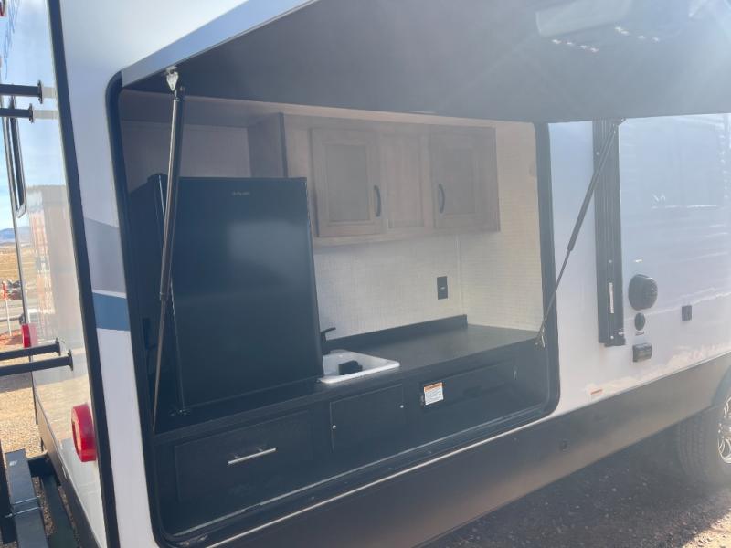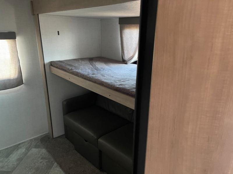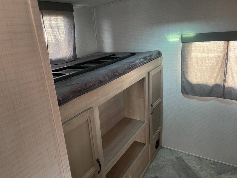 The whole gang will have a good time camping in this travel trailer! There is a place for everyone to sleep between the rear private bunkhouse with a 40" x 74" loft bed and a flip up bunk bed above a cube sofa, and the front private bedroom has an RV queen bed slide, plus the booth dinette and jiffy sofa in the main living area can provide extra sleeping spaces. The bedroom also has a dresser and a front closet that is big enough for your clothes and an area prepped to add an optional washer and dryer. The chef can choose to either cook indoors with the three burner cooktop or breathe in some fresh air while cooking at the outside camp kitchen with a refrigerator, a sink, overhead cabinets, and a grill with drawers next to it for your cooking utensils!