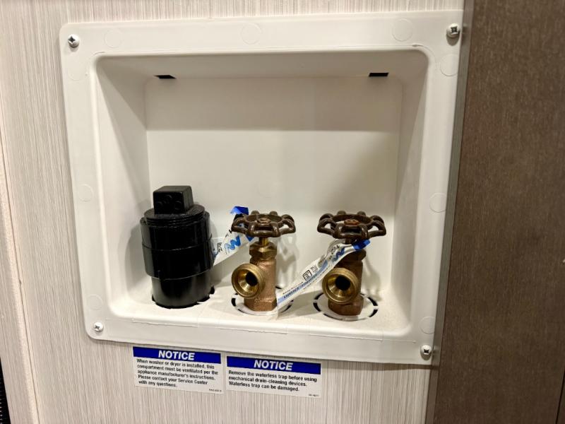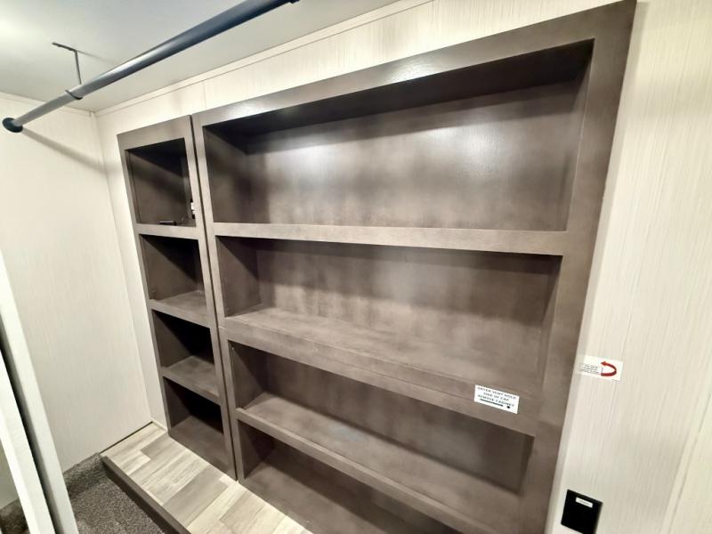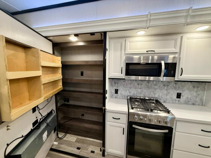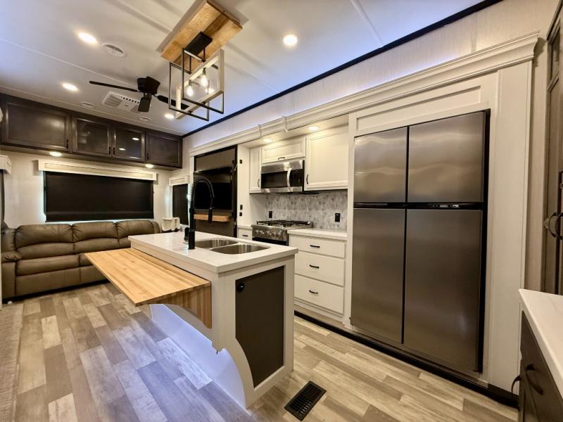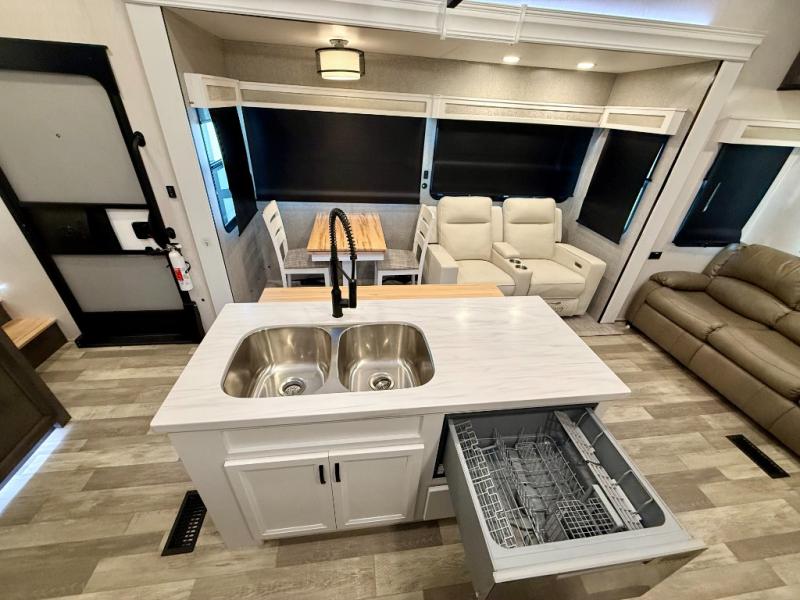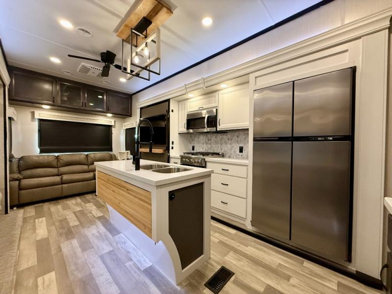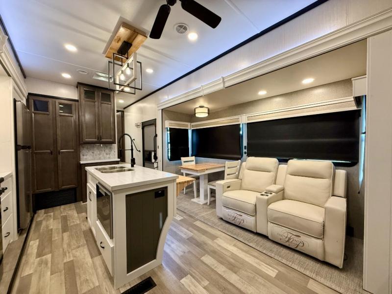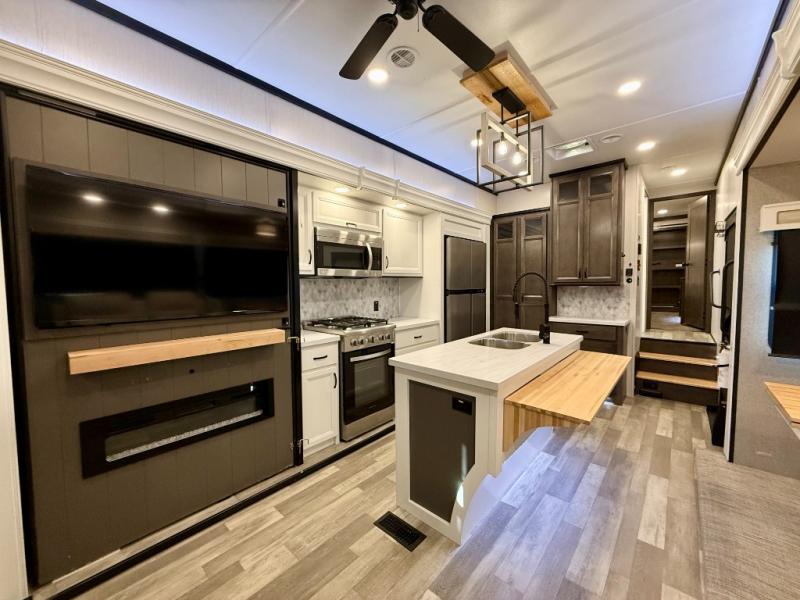 Pack your bags and hitch up this fifth wheel for a fun camping trip! When mother nature rains on your parade, relax in the rear living area on either the hide-a-bed sofa or power theater seating with USB charging across from the entertainment center with a fireplace and 50" flat screen TV. The chef can prepare their best meals with the kitchen island and there is a fold-down breakfast counter here for convenience. You could even add the optional pull-out kitchen for breakfast outdoors. The full bathroom has a 48" x 30" shower with a seat to wash the sand out of your hair after a fun day at the beach. The king bed slide in the front private bedroom welcomes you to enjoy a good night's rest and the front wardrobe has storage shelves and an area prepped to add an optional washer and dryer for you to have clean clothes throughout your entire trip!