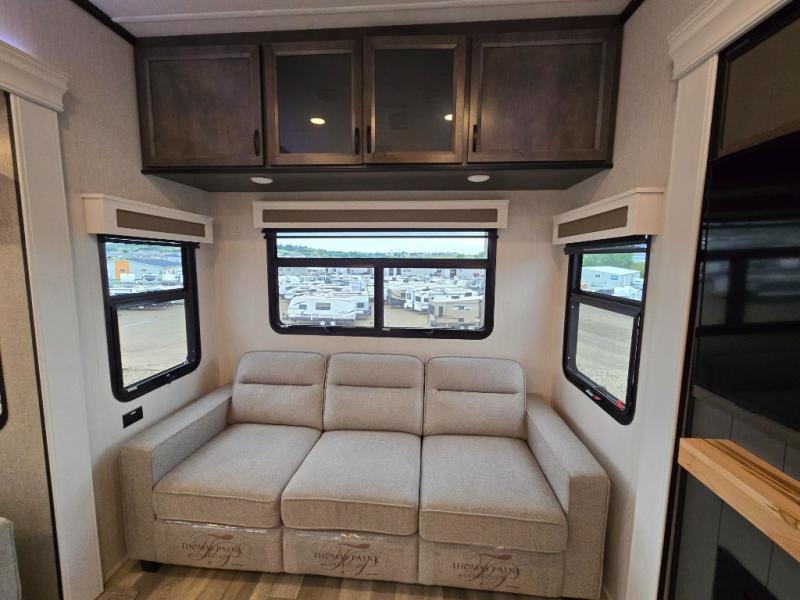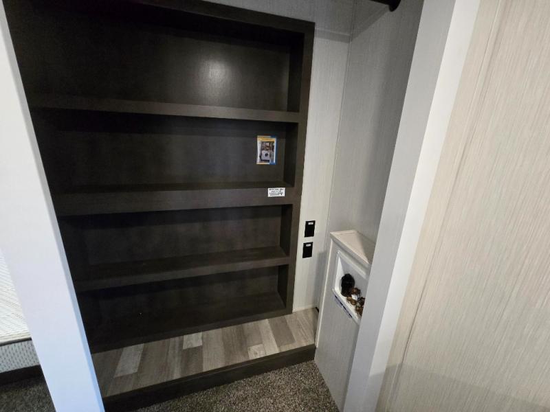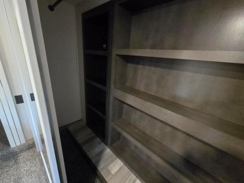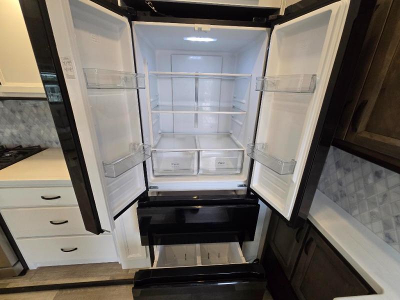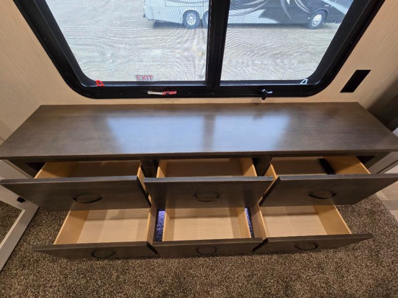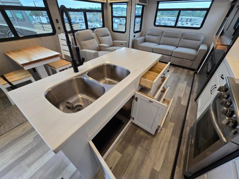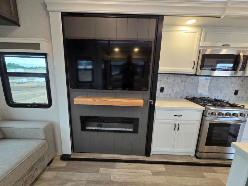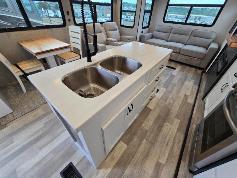 You can bring a guest or two to join in on the fun with this fifth wheel! The rear living area has a hide-a-bed sofa and power theater seating with USB charging across from an entertainment center with a fireplace and a 50" flat screen TV. The chef can prepare their best meals with the kitchen island and your guests will love the fold-down breakfast counter. You could even add the optional pull-out kitchen for breakfast outdoors. The full bathroom has a 48" x 30" shower with a seat plus a dual sink vanity for convenience. The king bed slide in the front private bedroom welcomes you to enjoy a good night's rest and the front wardrobe has storage shelves and an area prepped to add an optional washer and dryer for you to have clean clothes throughout your entire trip!