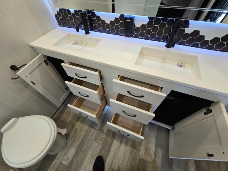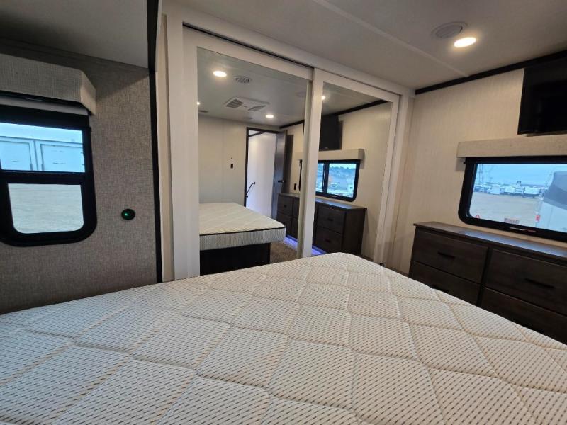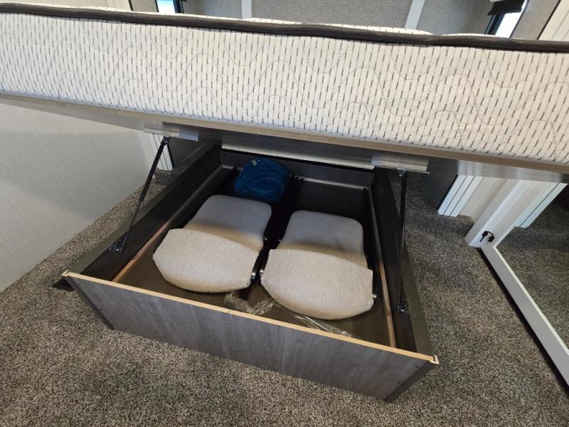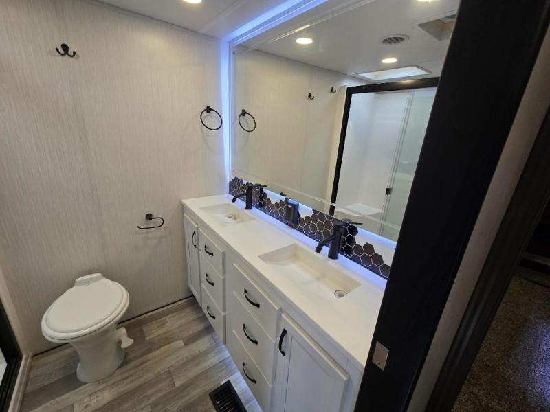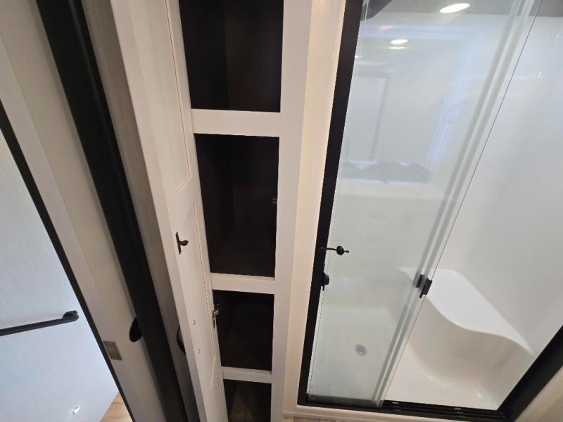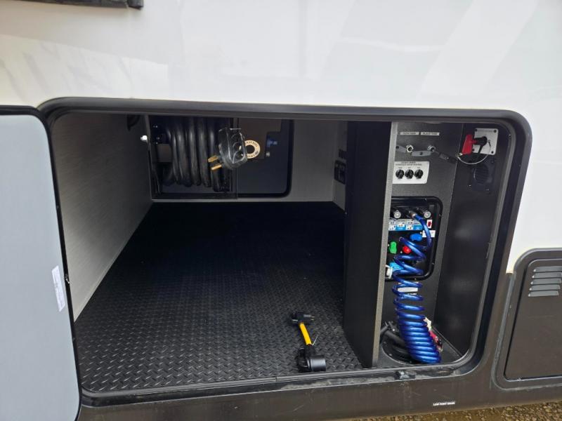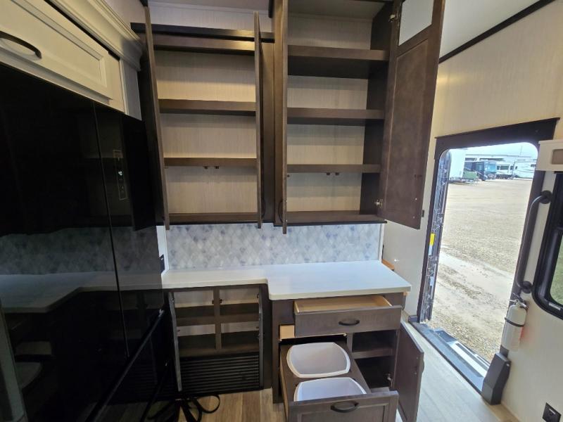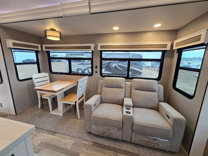 You can bring a guest or two to join in on the fun with this fifth wheel! The rear living area has a hide-a-bed sofa and power theater seating with USB charging across from an entertainment center with a fireplace and a 50" flat screen TV. The chef can prepare their best meals with the kitchen island and your guests will love the fold-down breakfast counter. You could even add the optional pull-out kitchen for breakfast outdoors. The full bathroom has a 48" x 30" shower with a seat plus a dual sink vanity for convenience. The king bed slide in the front private bedroom welcomes you to enjoy a good night's rest and the front wardrobe has storage shelves and an area prepped to add an optional washer and dryer for you to have clean clothes throughout your entire trip!