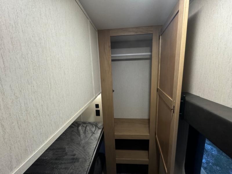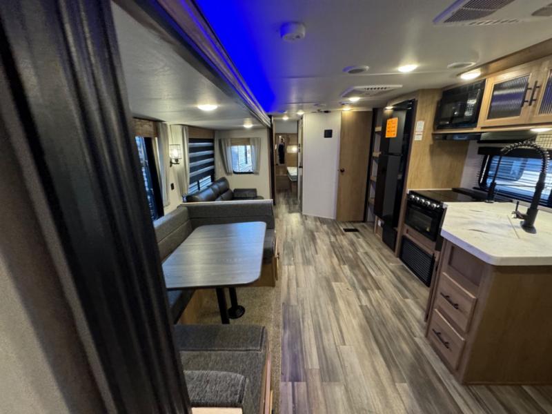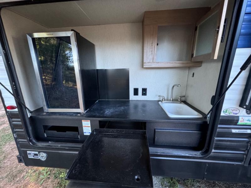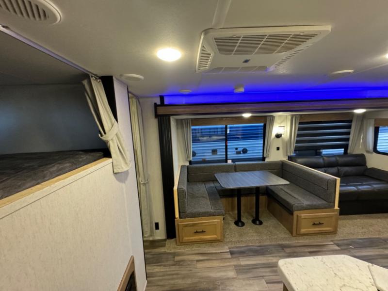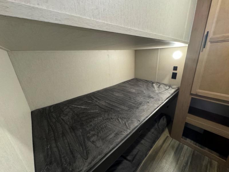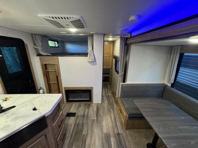 Escape your ordinary life with this innovative travel trailer! It features 64" top bunk bed above a 36" bottom bunk with wardrobes on either side of them, plus there is a wall at the foot of the beds with a fireplace on the other side. You will have your own privacy with the front private bedroom that has a walk around queen bed with wardrobes on either side and an entrance into the dual entry bathroom which has a neo-angled shower to freshen up in each morning. The sofa and U-shaped dinette can also transform into extra sleeping spaces when you aren't using them to enjoy a meal or relax in front of the TV mount. The outdoor bar and grill comes with a 5.6 cu. ft. refrigerator and everything you need to prepare delicious meals outdoors. You even have a rear storage rack and outside storage areas to store your outdoor gear!