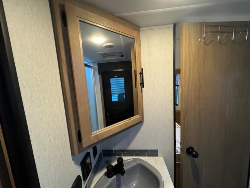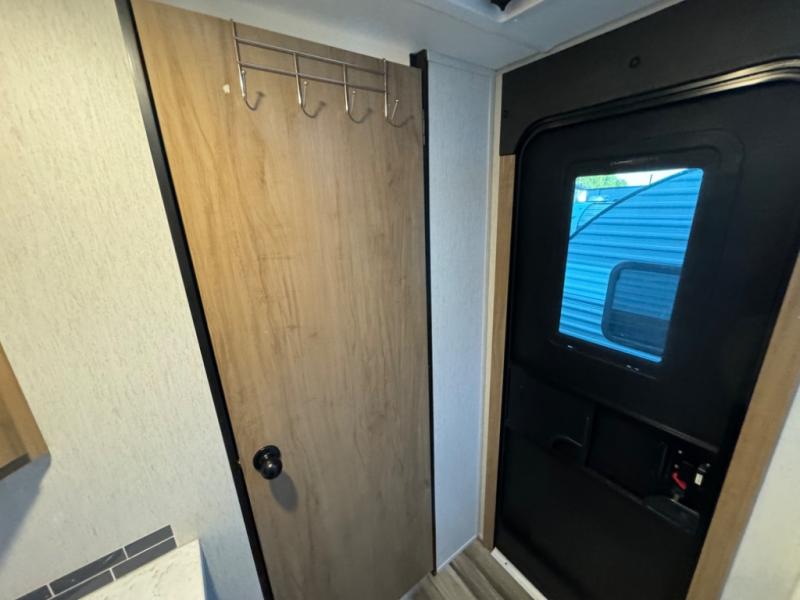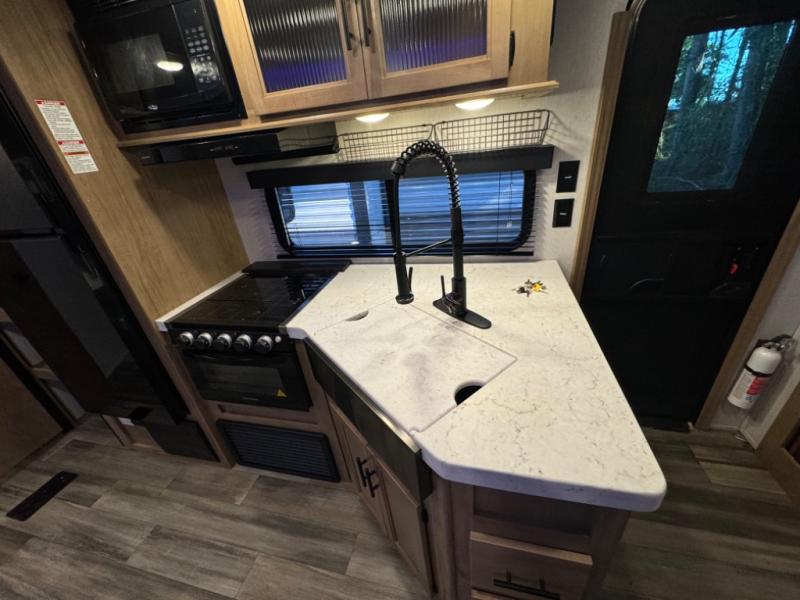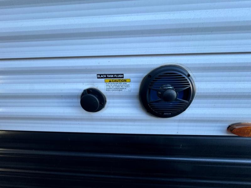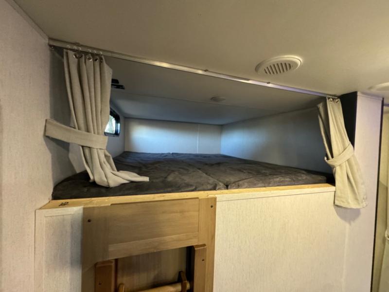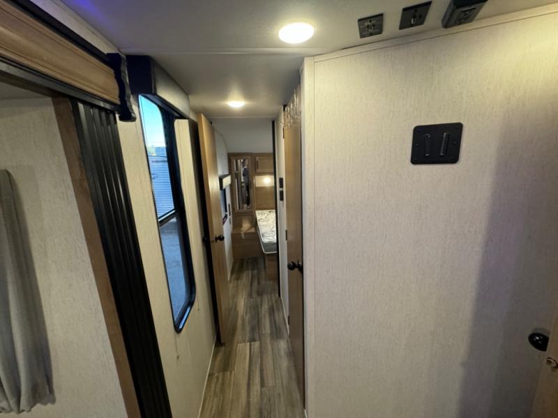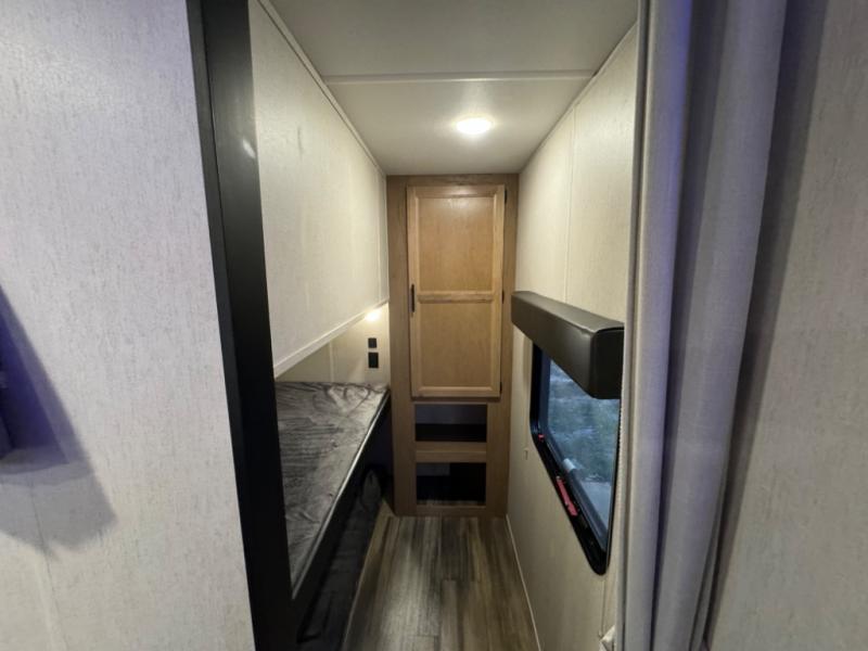 Escape your ordinary life with this innovative travel trailer! It features 64" top bunk bed above a 36" bottom bunk with wardrobes on either side of them, plus there is a wall at the foot of the beds with a fireplace on the other side. You will have your own privacy with the front private bedroom that has a walk around queen bed with wardrobes on either side and an entrance into the dual entry bathroom which has a neo-angled shower to freshen up in each morning. The sofa and U-shaped dinette can also transform into extra sleeping spaces when you aren't using them to enjoy a meal or relax in front of the TV mount. The outdoor bar and grill comes with a 5.6 cu. ft. refrigerator and everything you need to prepare delicious meals outdoors. You even have a rear storage rack and outside storage areas to store your outdoor gear!